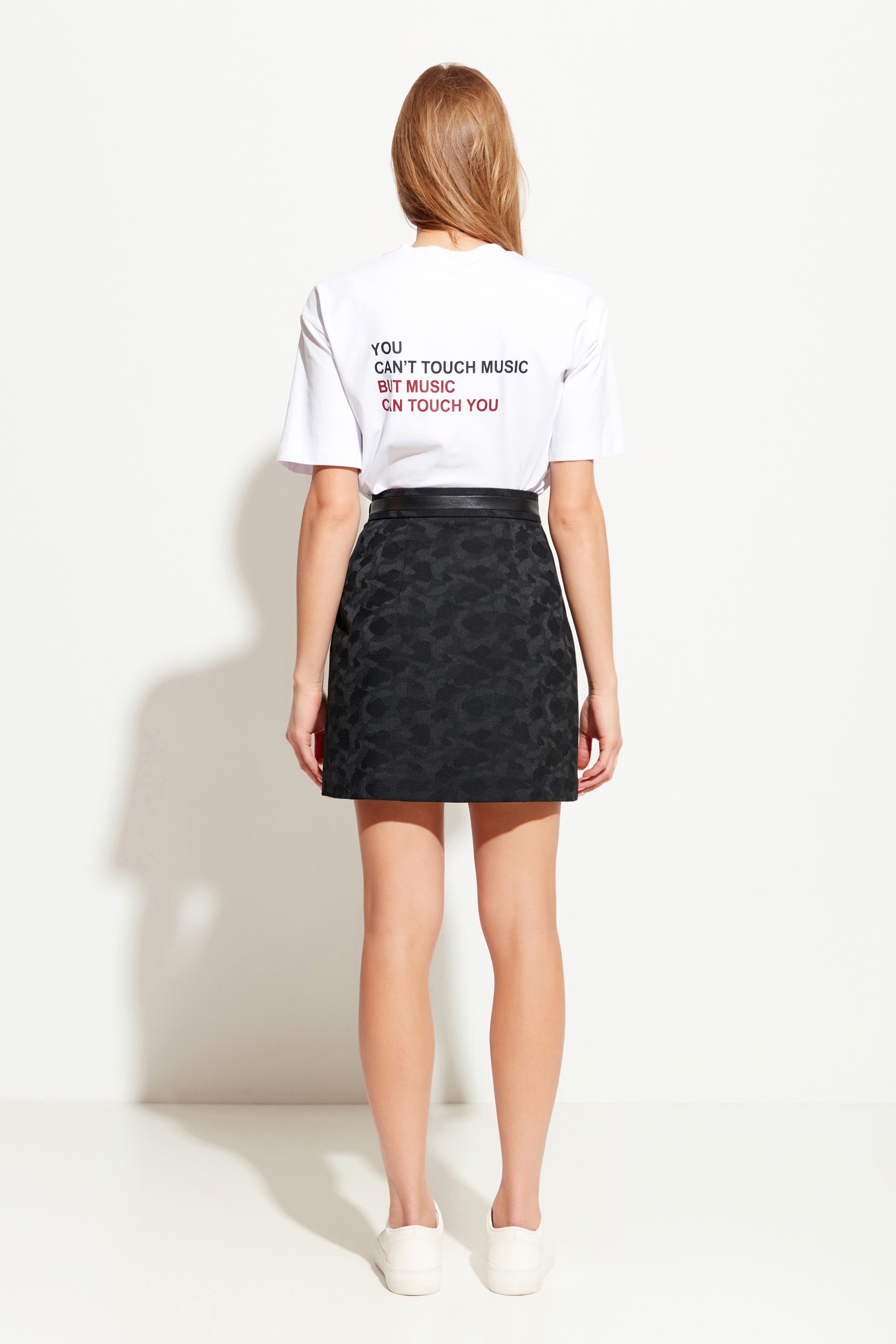 Футболка прямого кроя, длиной до середины линии бедер. Округлый вырез горловины. Линия плеч спущена. Рукав короткий, широкий. Перед изделия и спинка декорированы акцентным принтом. Универсальная, базовая модель, которая необходима в каждом гардеробе.