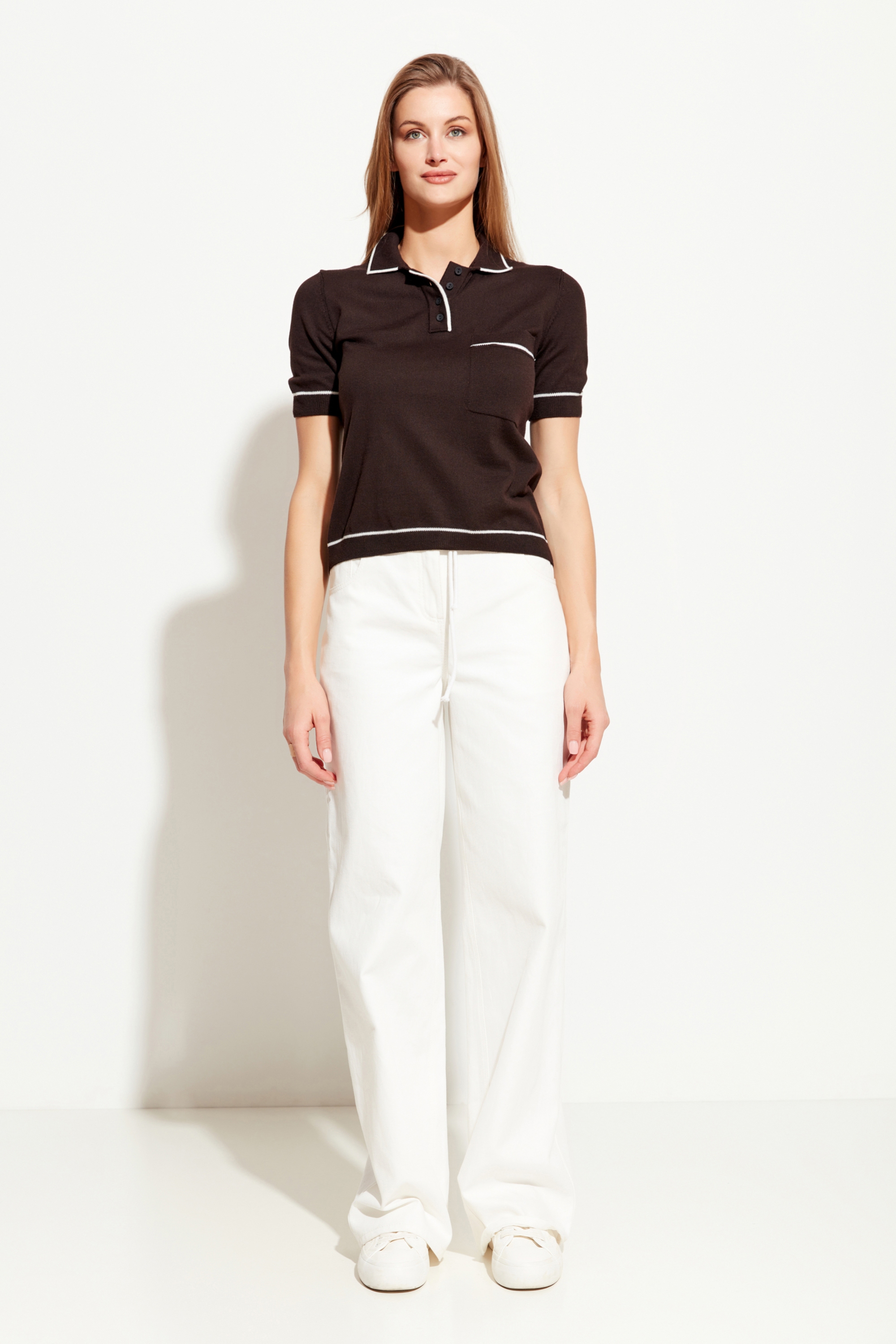 Джемпер вязаный полуприлегающего силуэта, длиной выше линии бедер. Воротник отложной. На груди накладной карман. Воротник, манжеты и карман обрамлены контрастной вставкой из аналогичной пряжи. Классическая, универсальная модель, которая подойдет к любому типу гардероба и по любому случаю.
