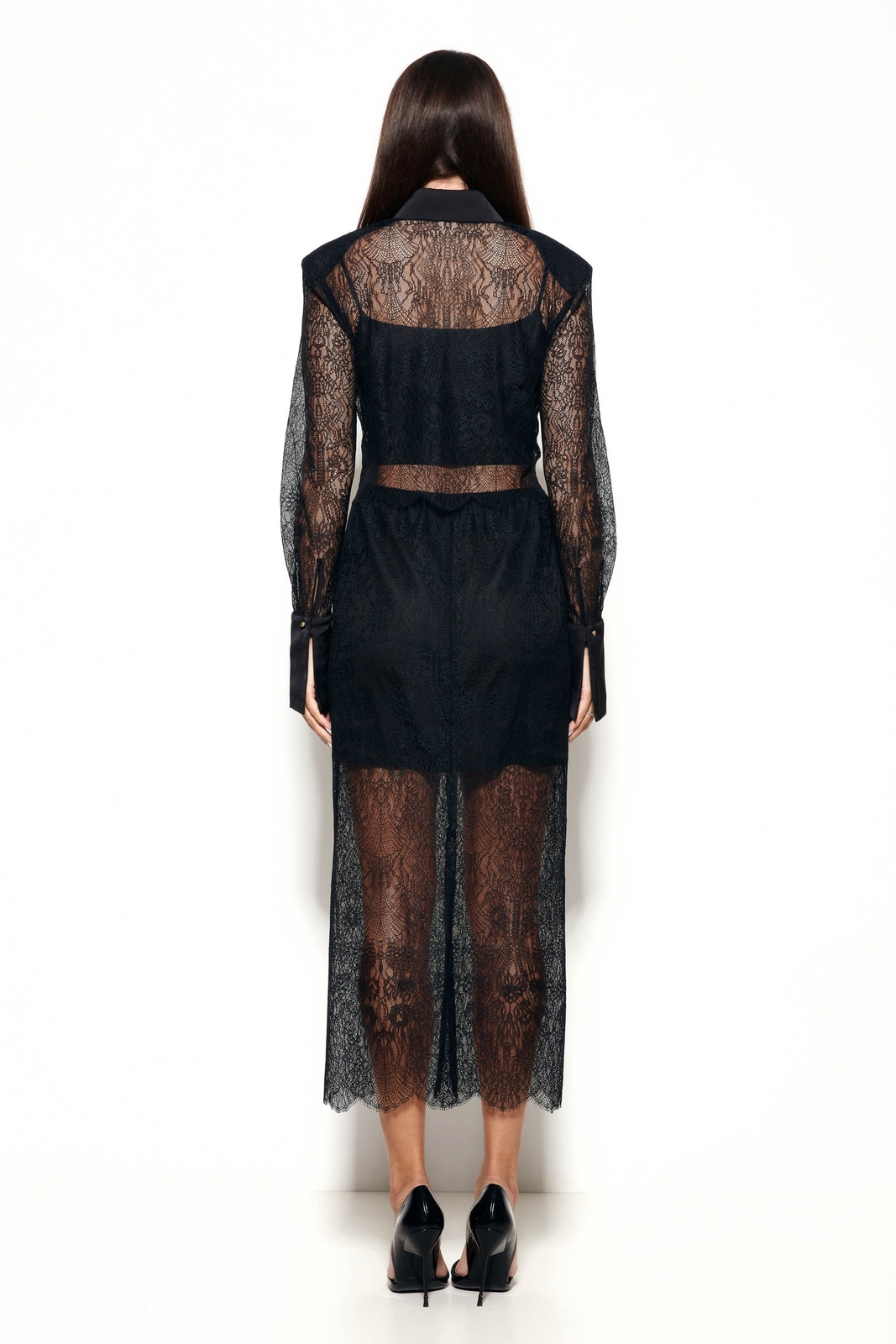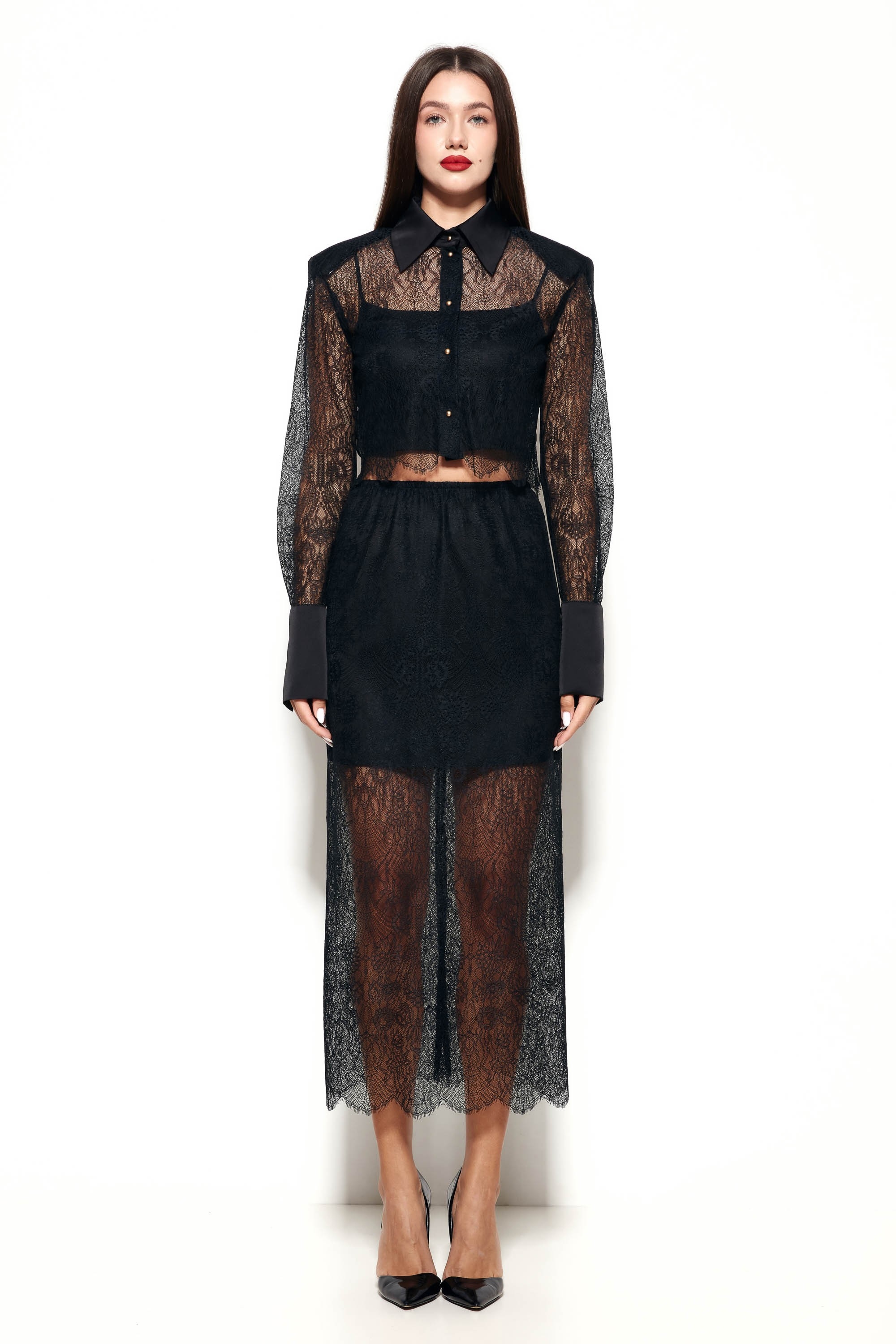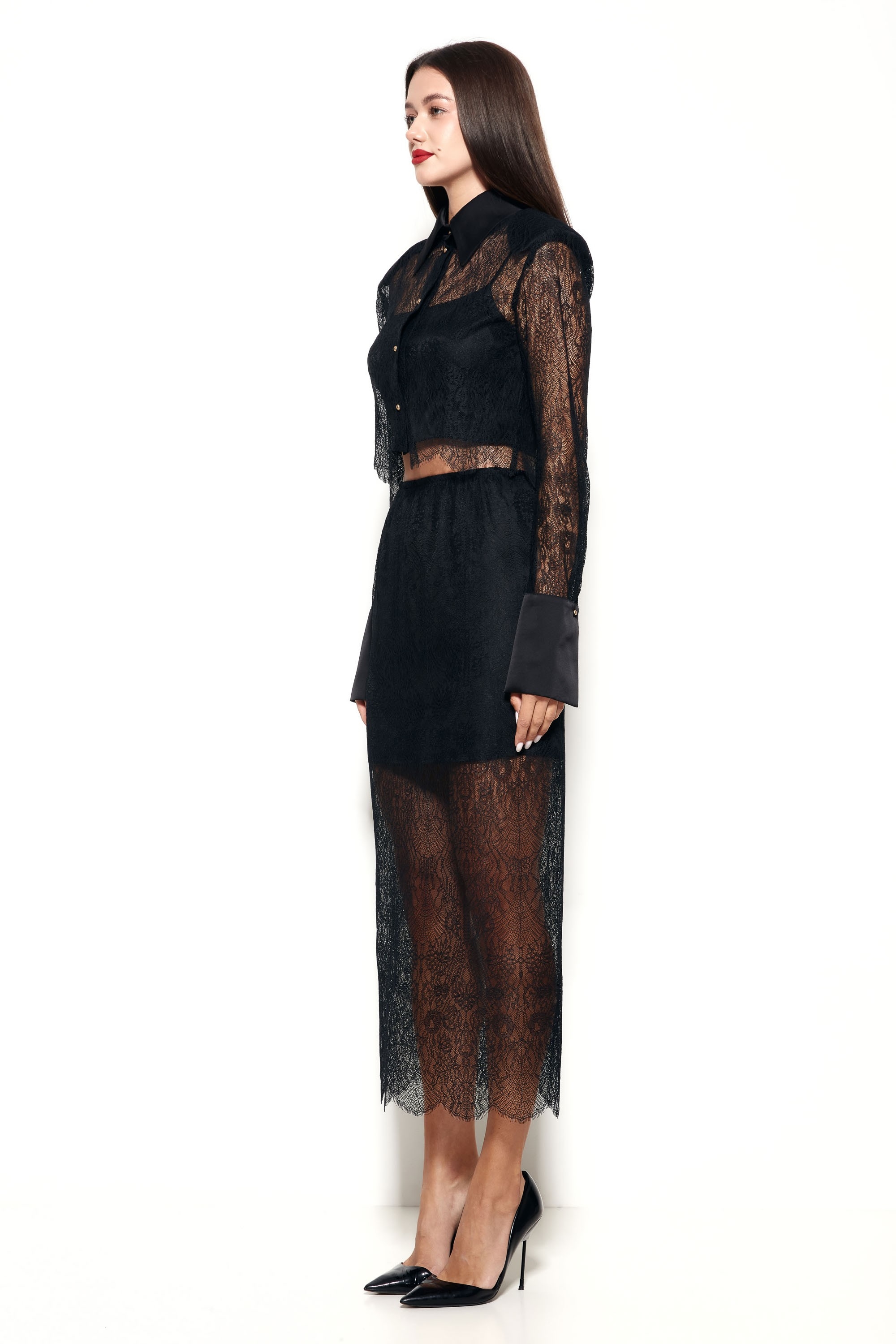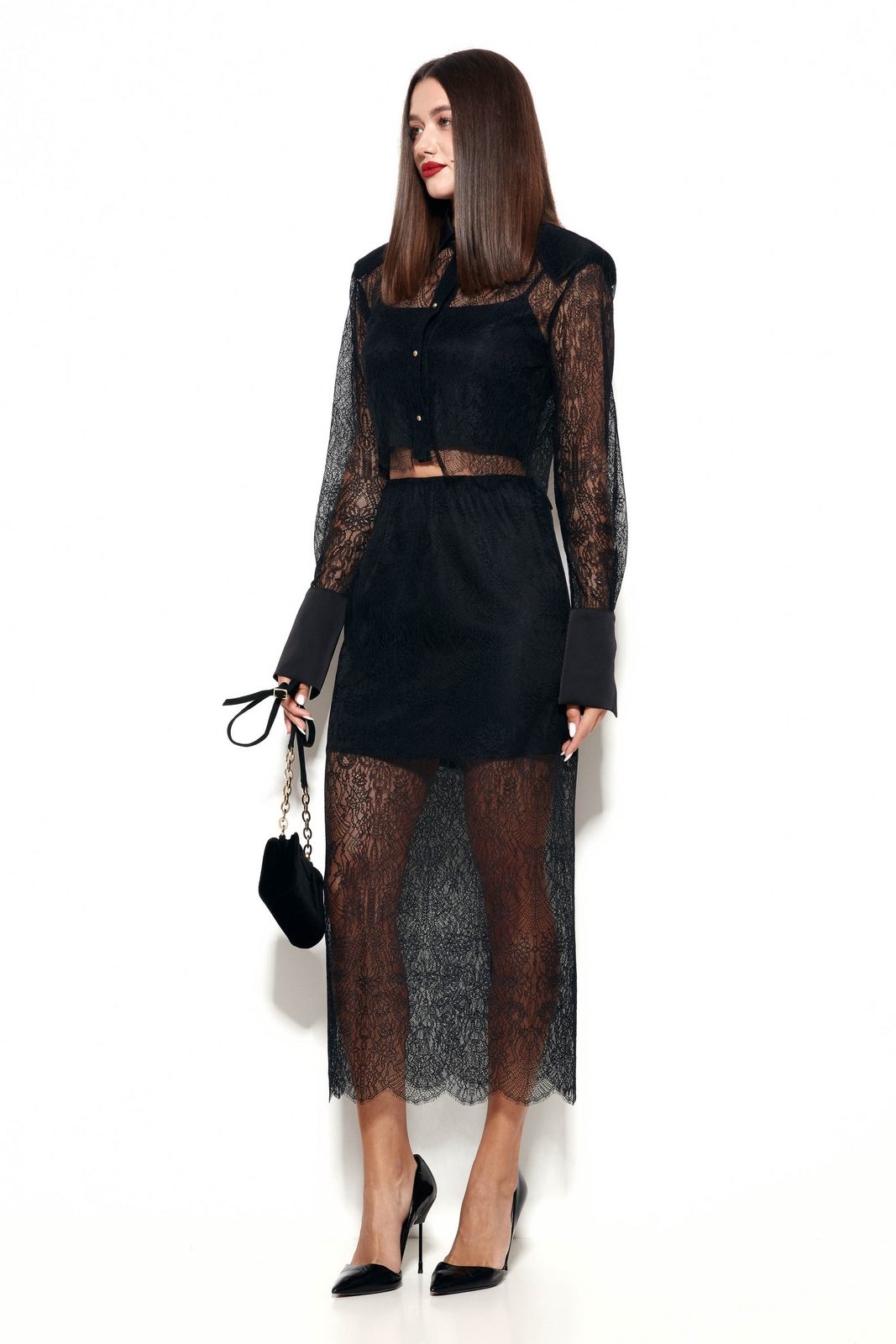 Кружевная ткань блузы эффектно подчеркивает силуэт и добавляет образу изысканности.