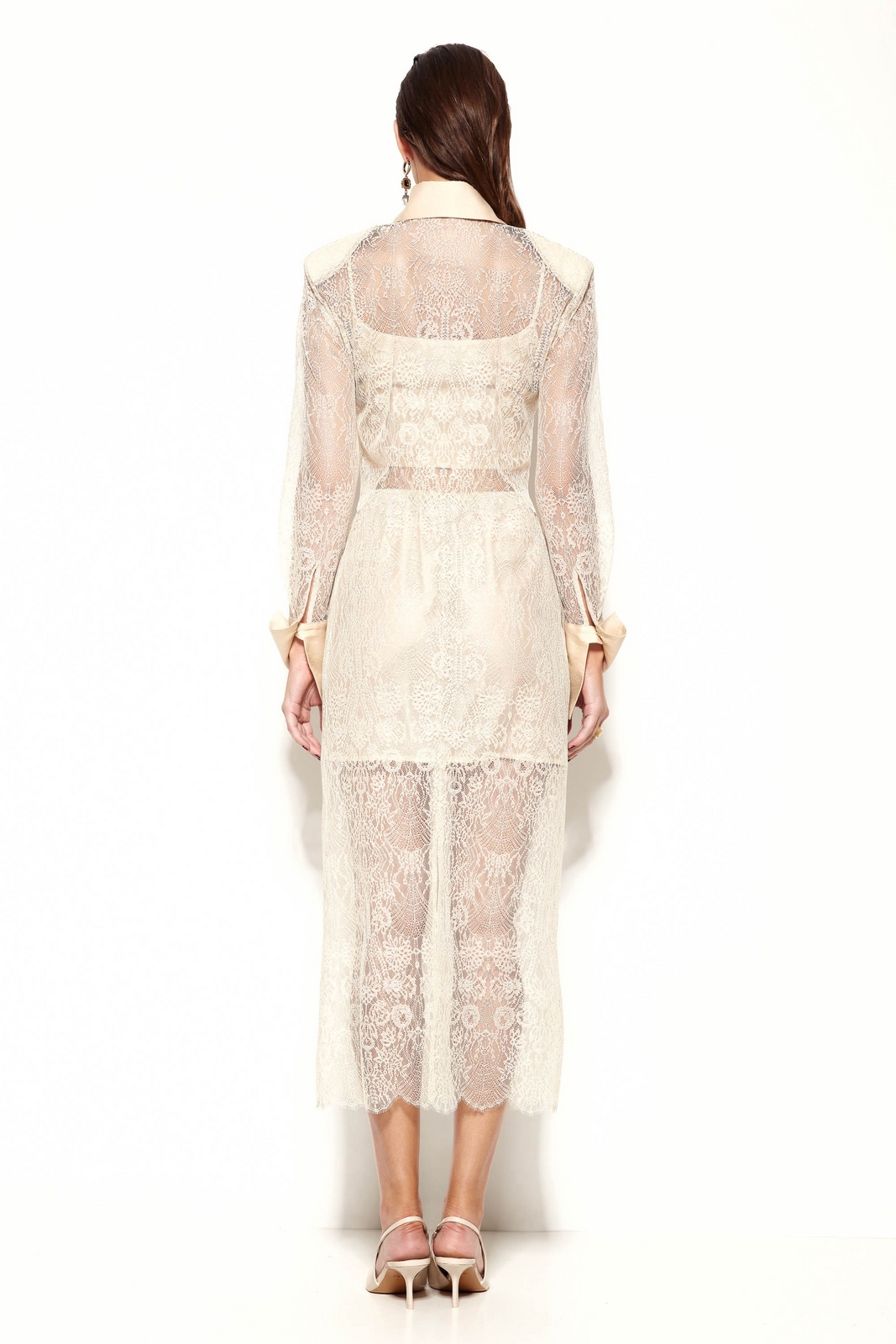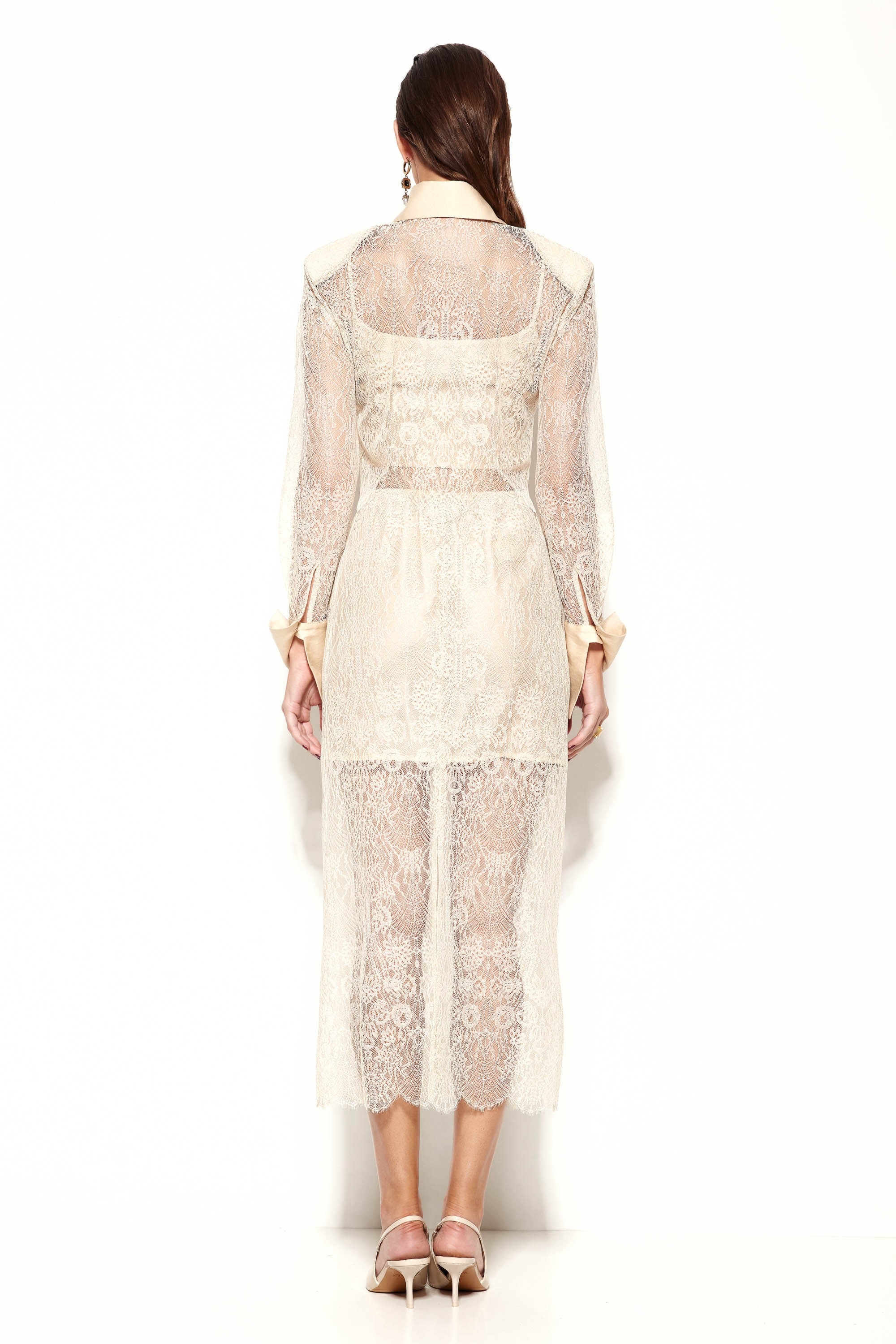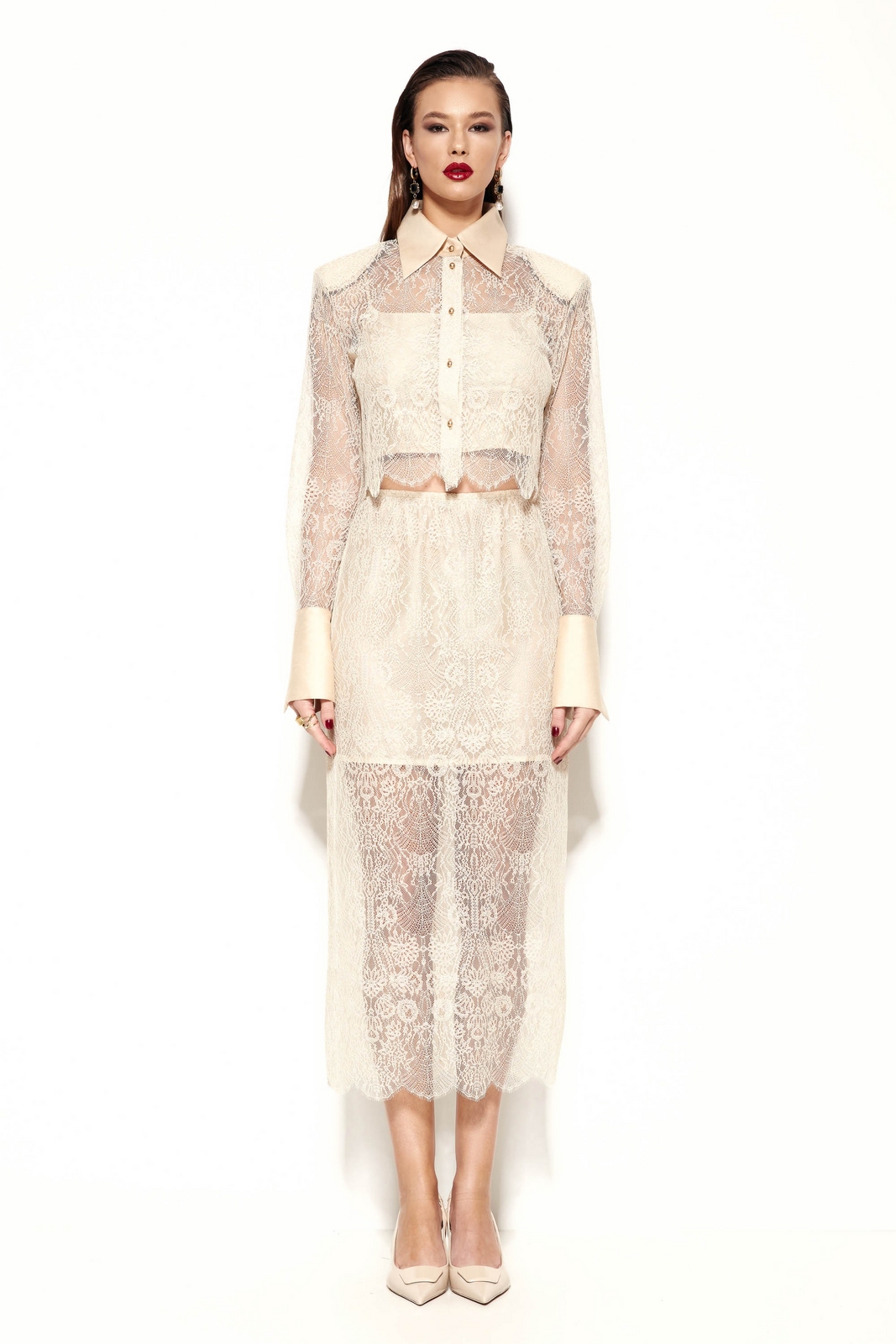 Кружевная ткань блузы эффектно подчеркивает силуэт и добавляет образу изысканности.