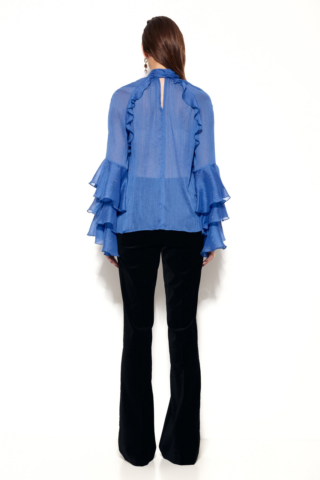 Рукава регланы, декорированные объемными воланами, которые добавляют изделию воздушности и романтичности.