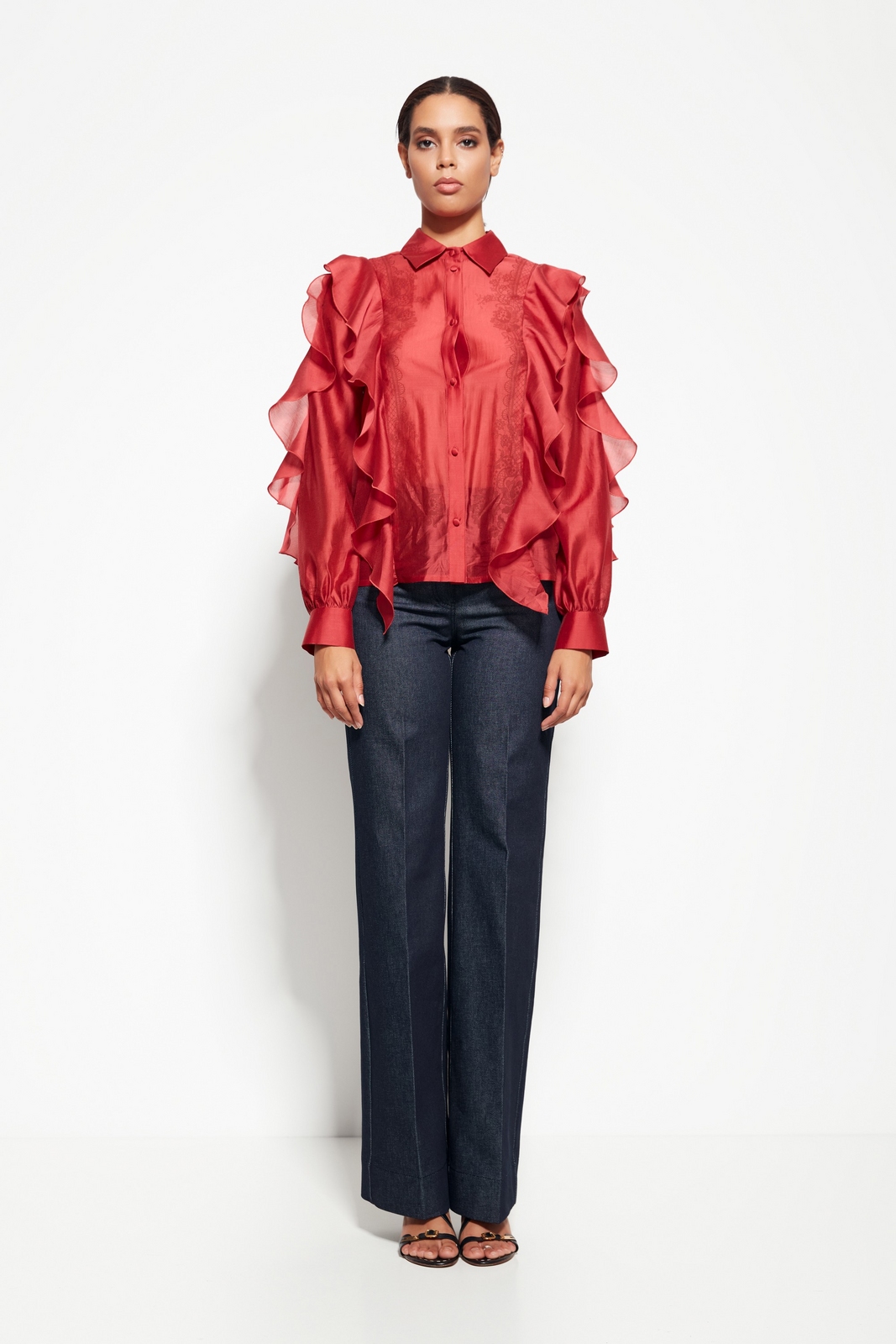 Блуза Lakbi 55307 с воланами на рукавах и передней части — элегантный акцент вашего вечернего образа.