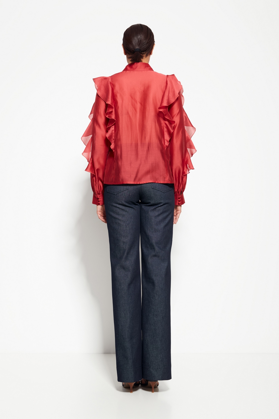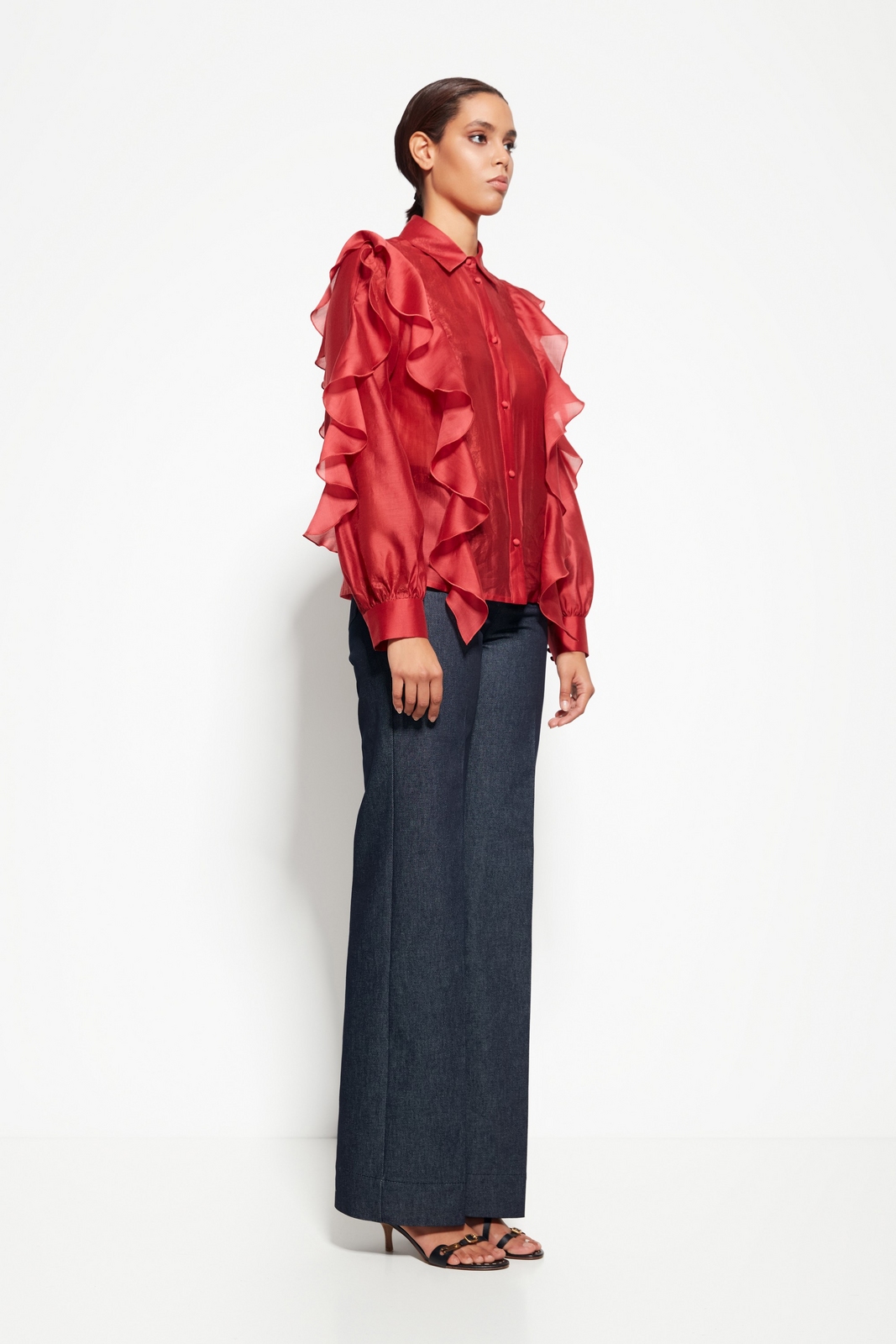 Декор: Воланы на рукавах и передней части, добавляющие объём и динамичность.