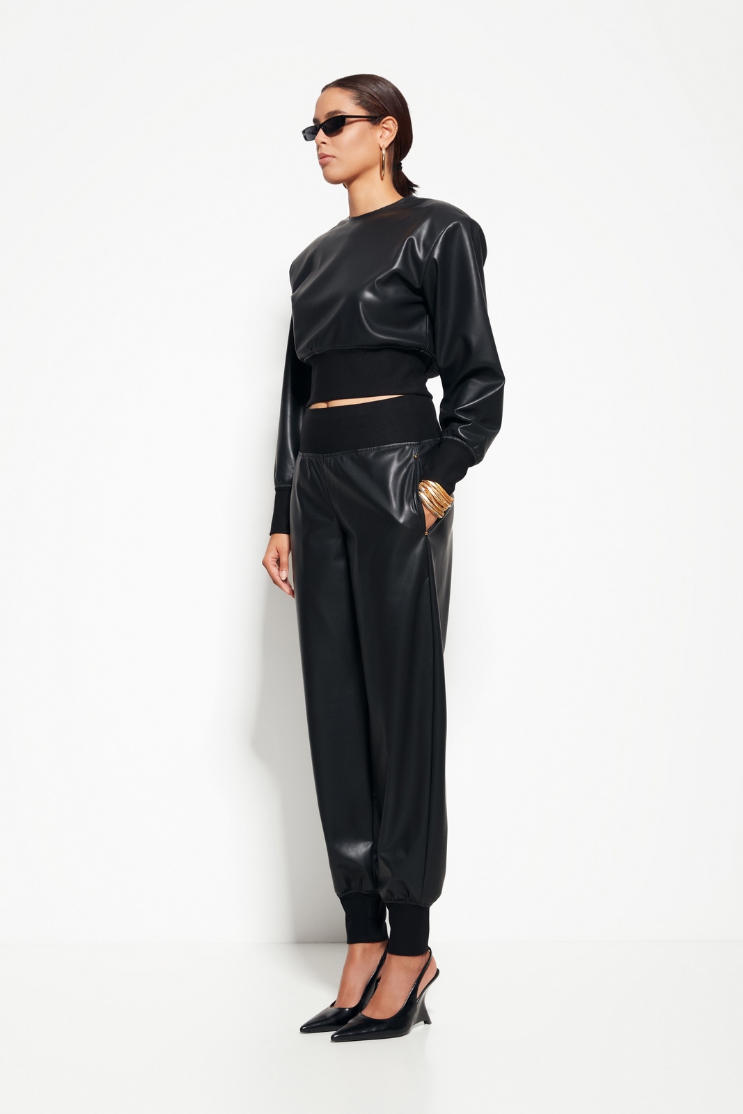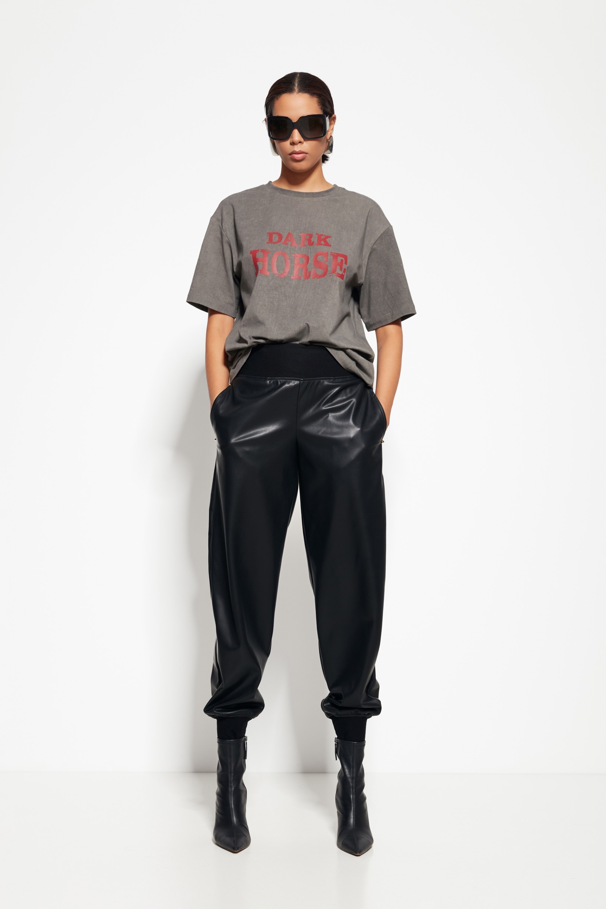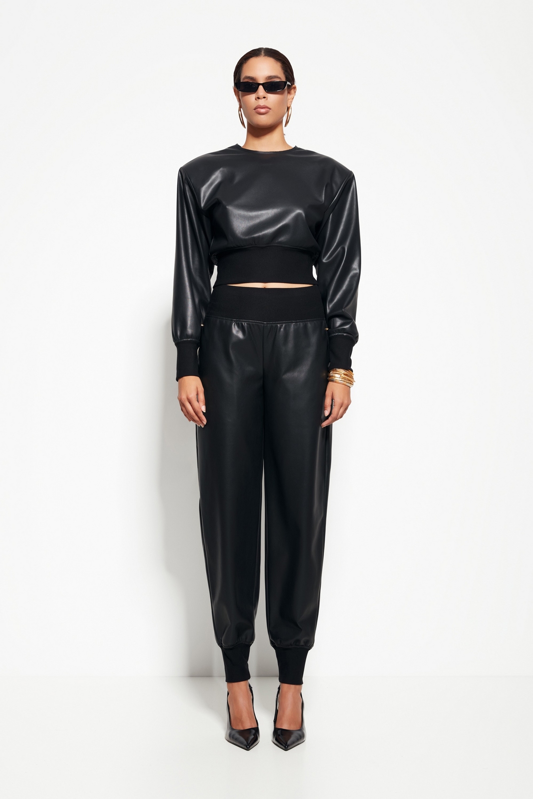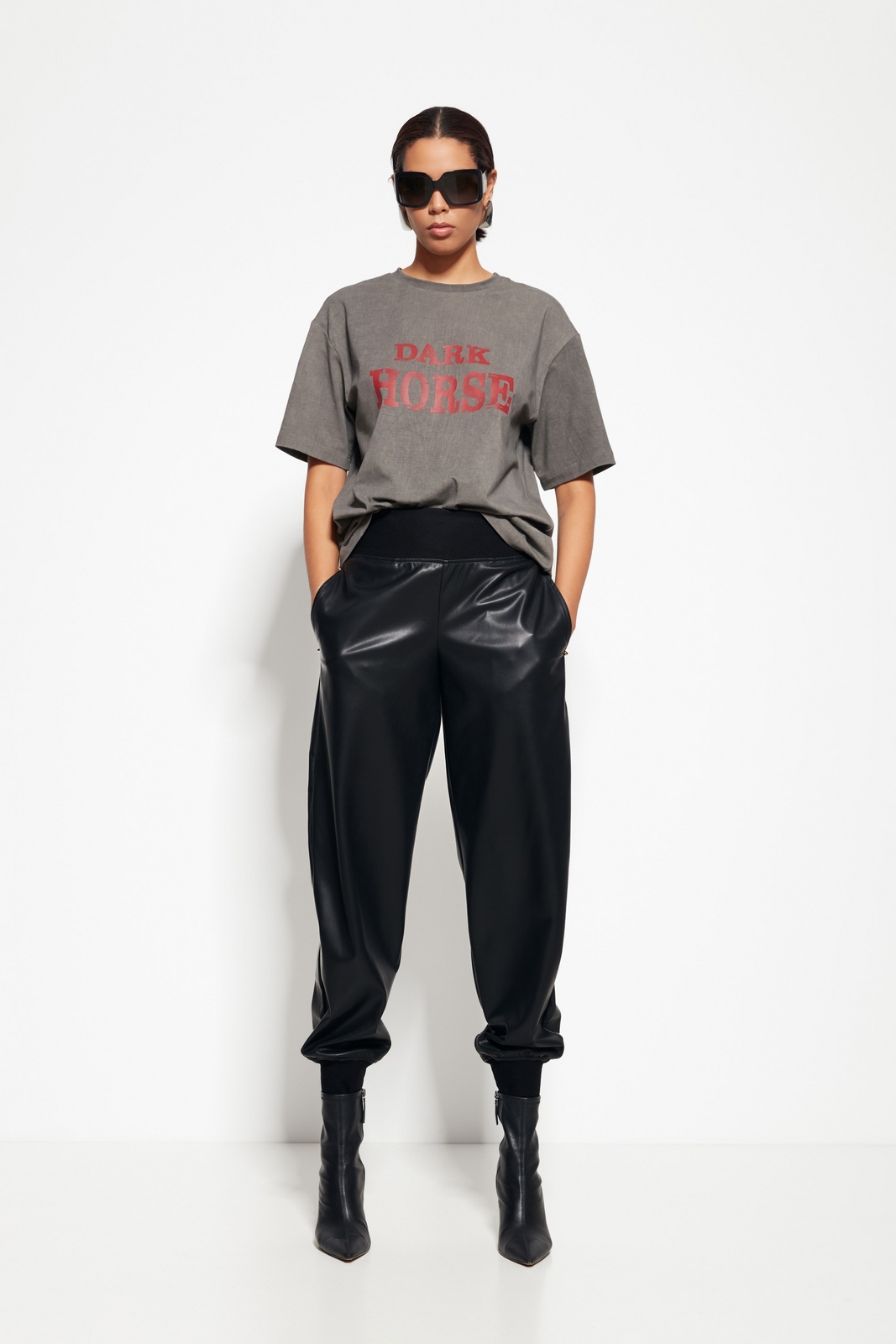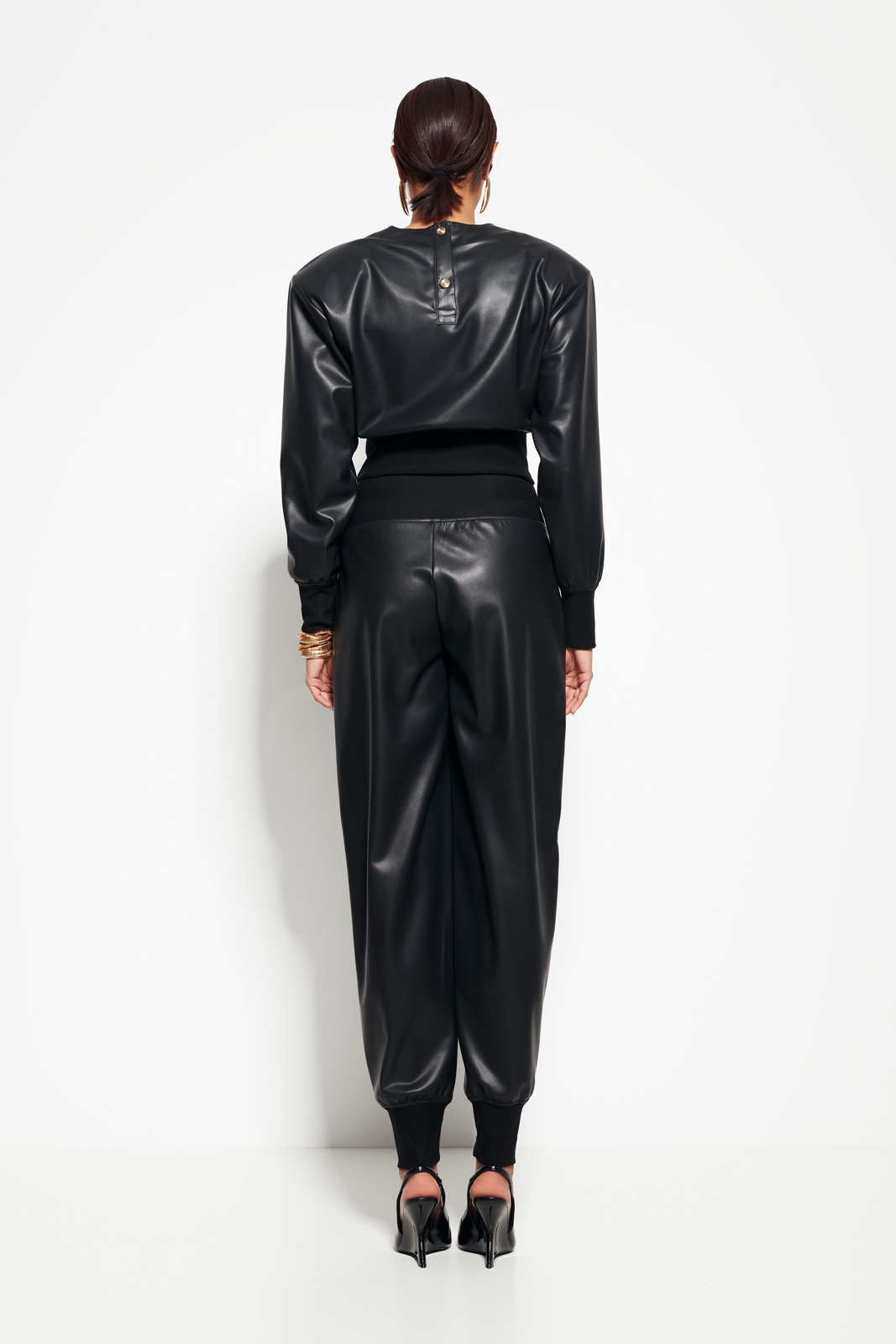 Модель из коллекции Party 2026 — брюки из эко-кожи с широким поясом-резинкой и резиновыми манжетами внизу. Этот дизайн сочетает современный минимализм и спортивные нотки, создавая выразительный и комфортный образ.