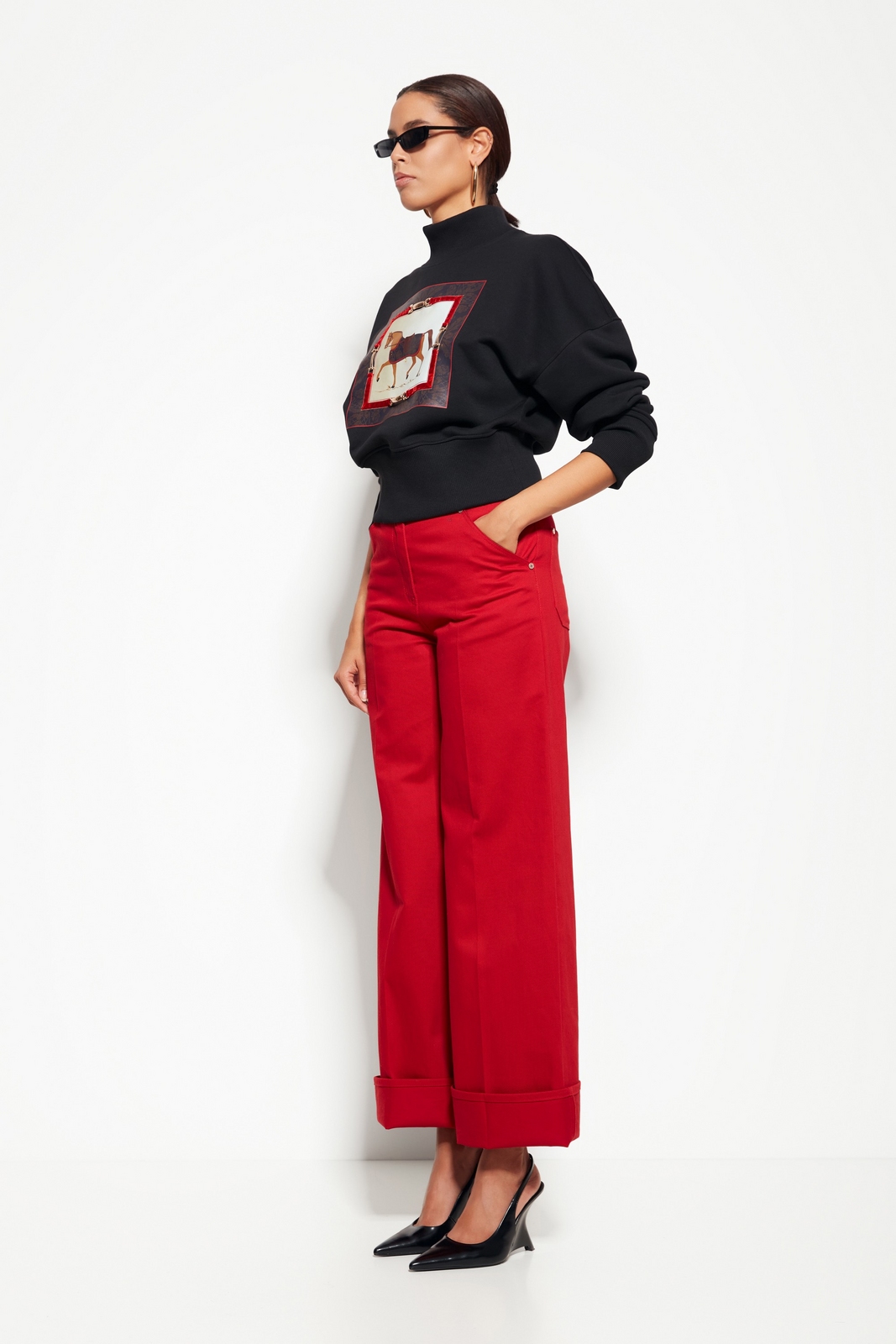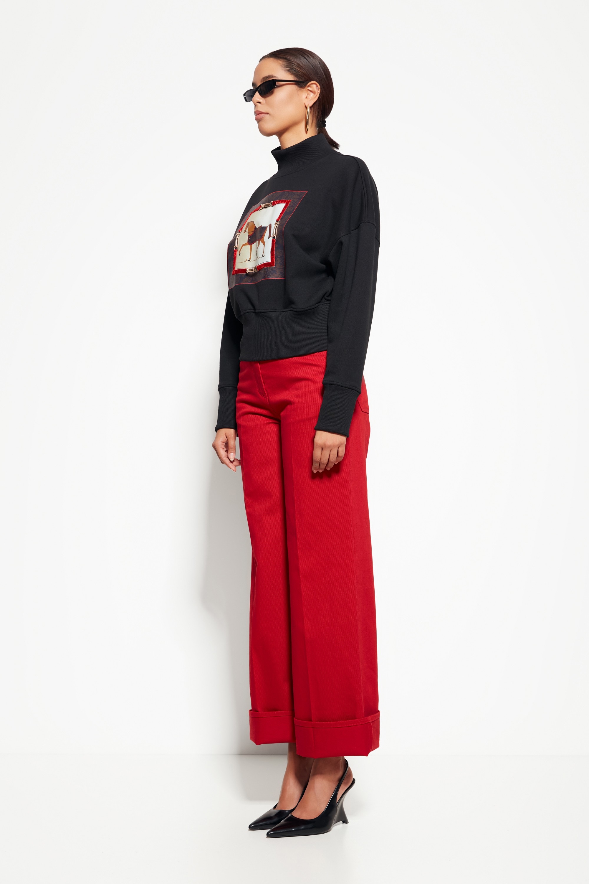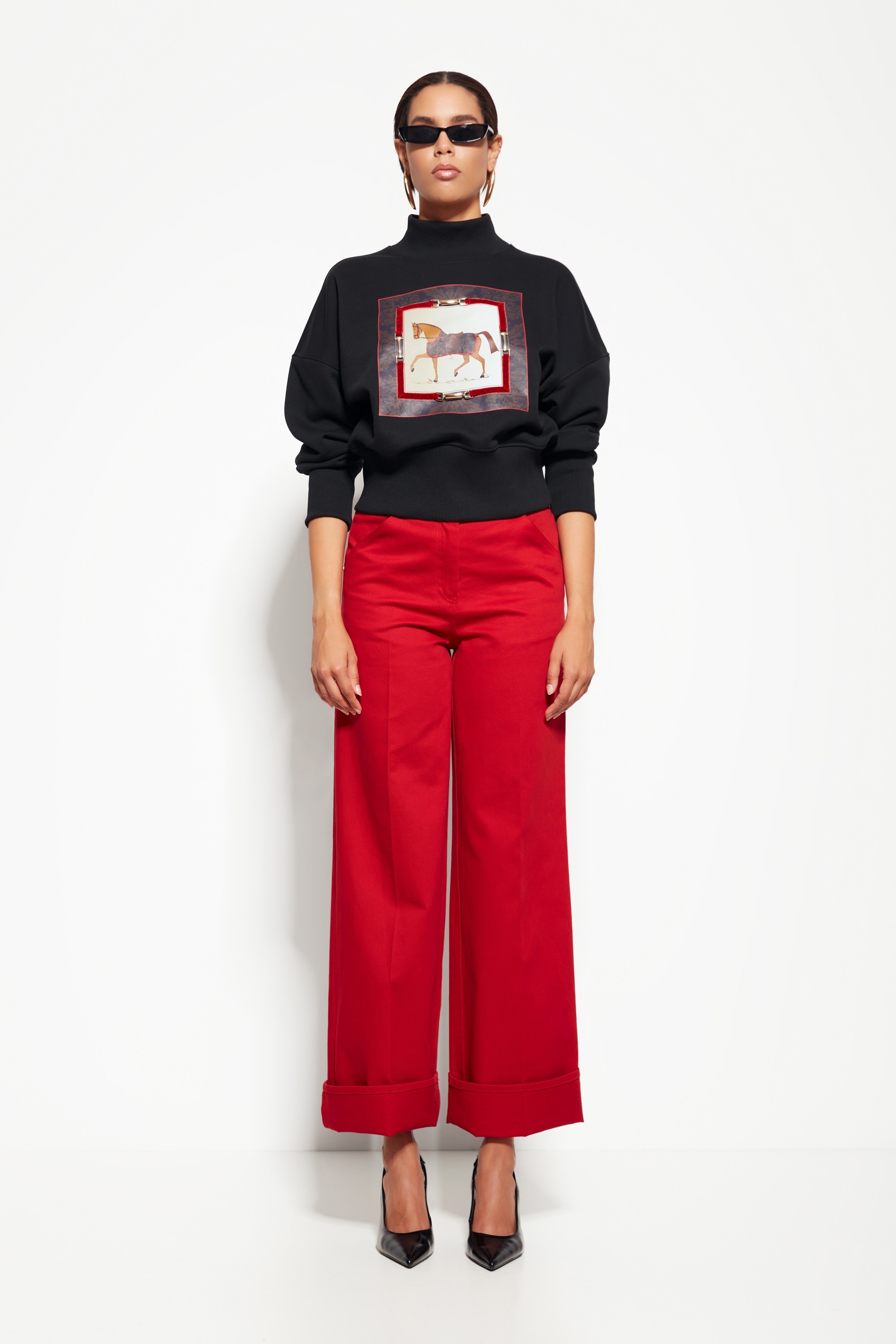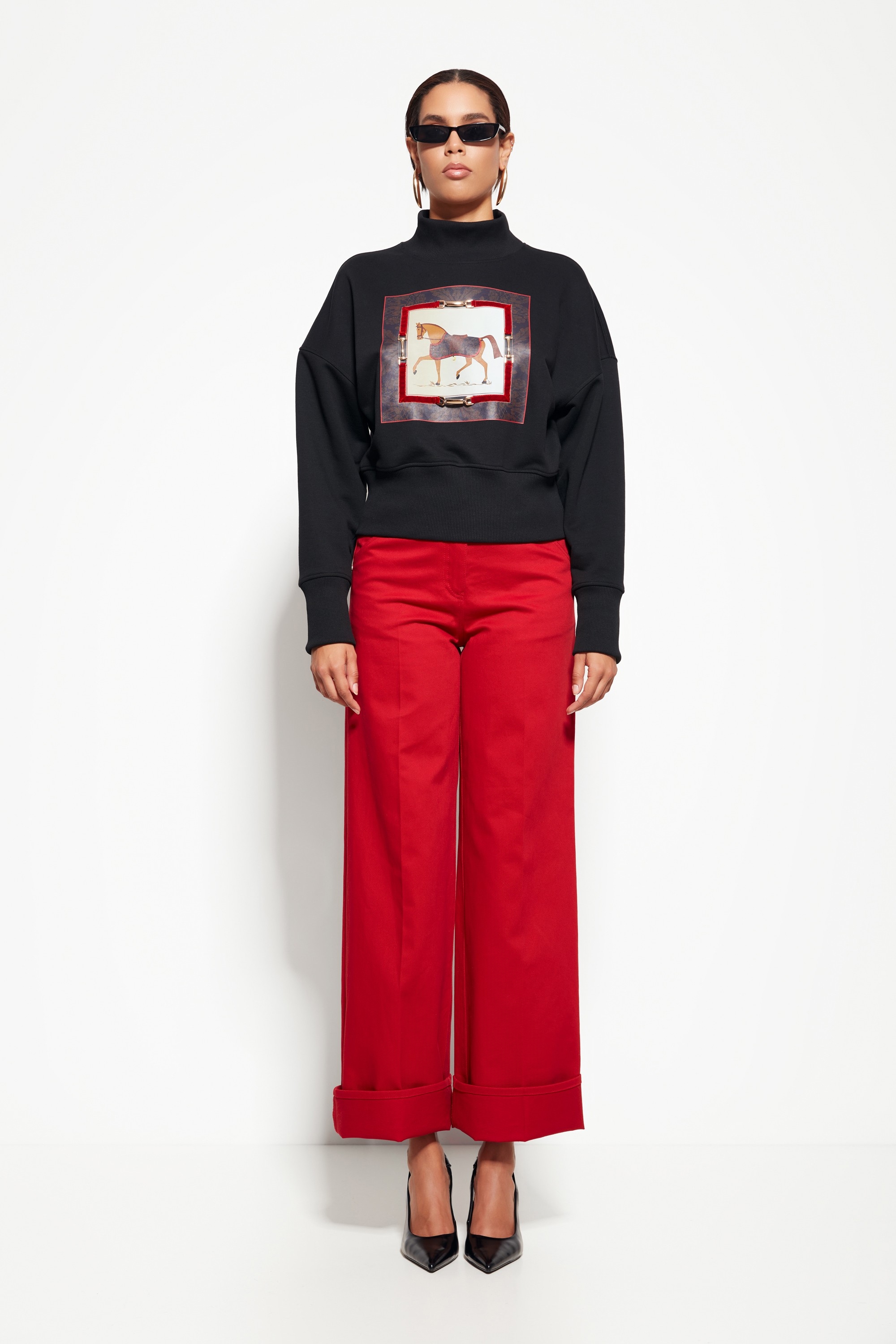 Модель из коллекции Party 2026 — прямой джемпер с высокой горловиной и крупным принтом лошади, символизирующим наступающий год. Минималистичный дизайн и эффектный принт создают современный и выразительный образ.