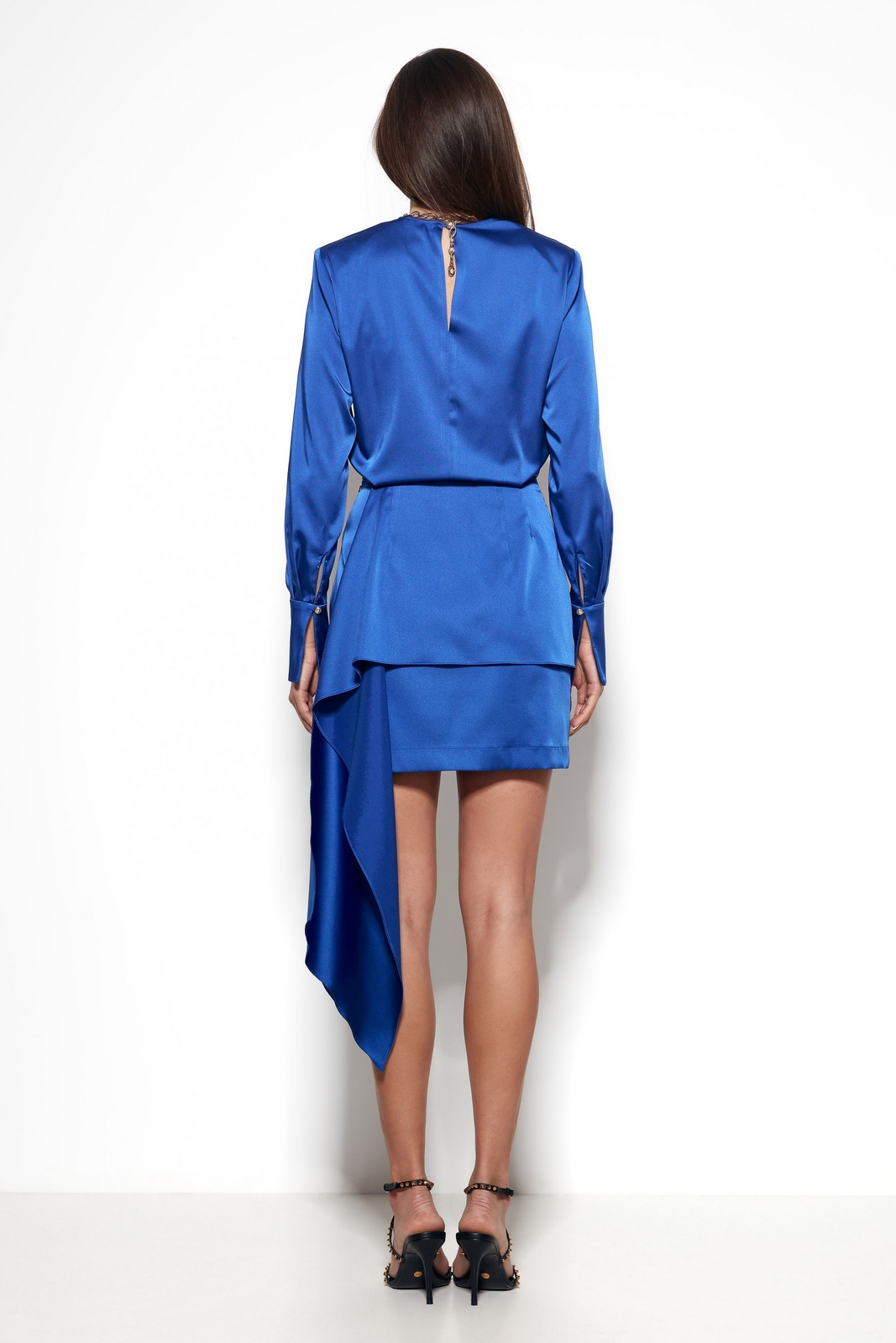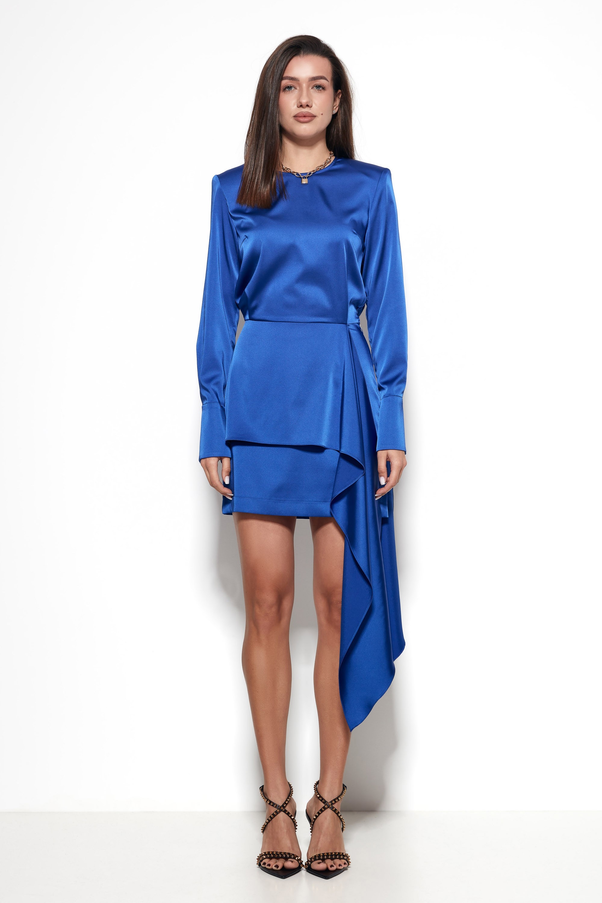 Юбка платья декорирована воланом с удлиненными краями, которые эффектно подчеркивают длину ног.