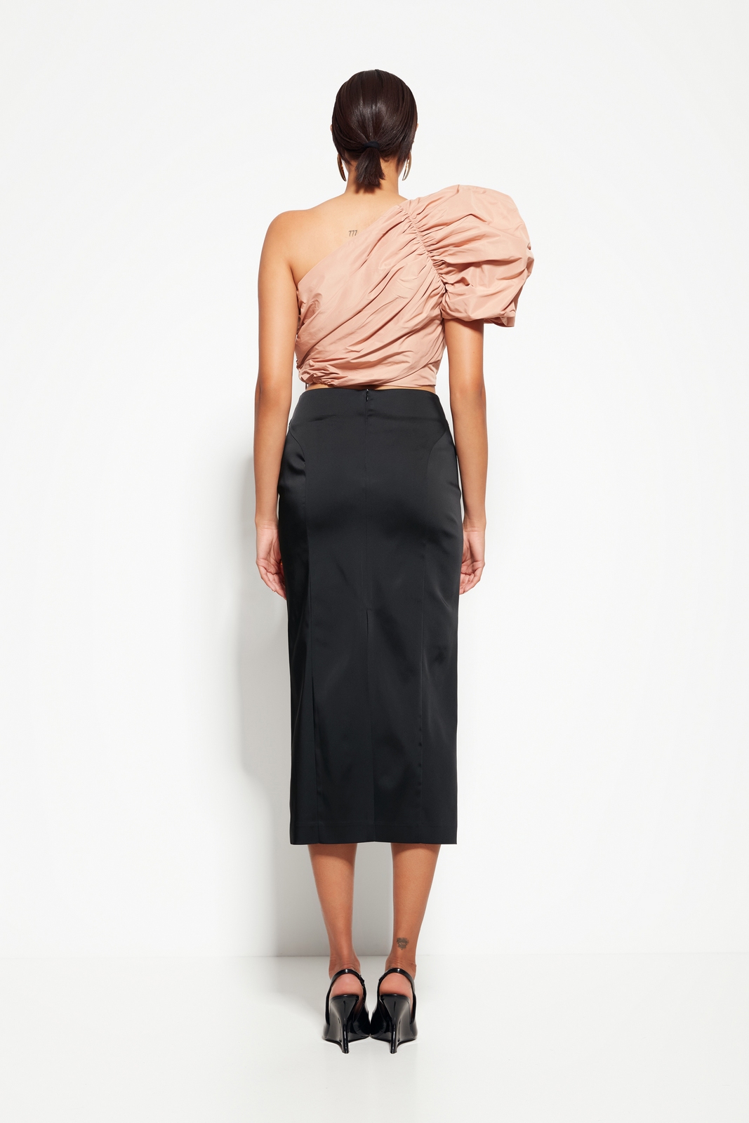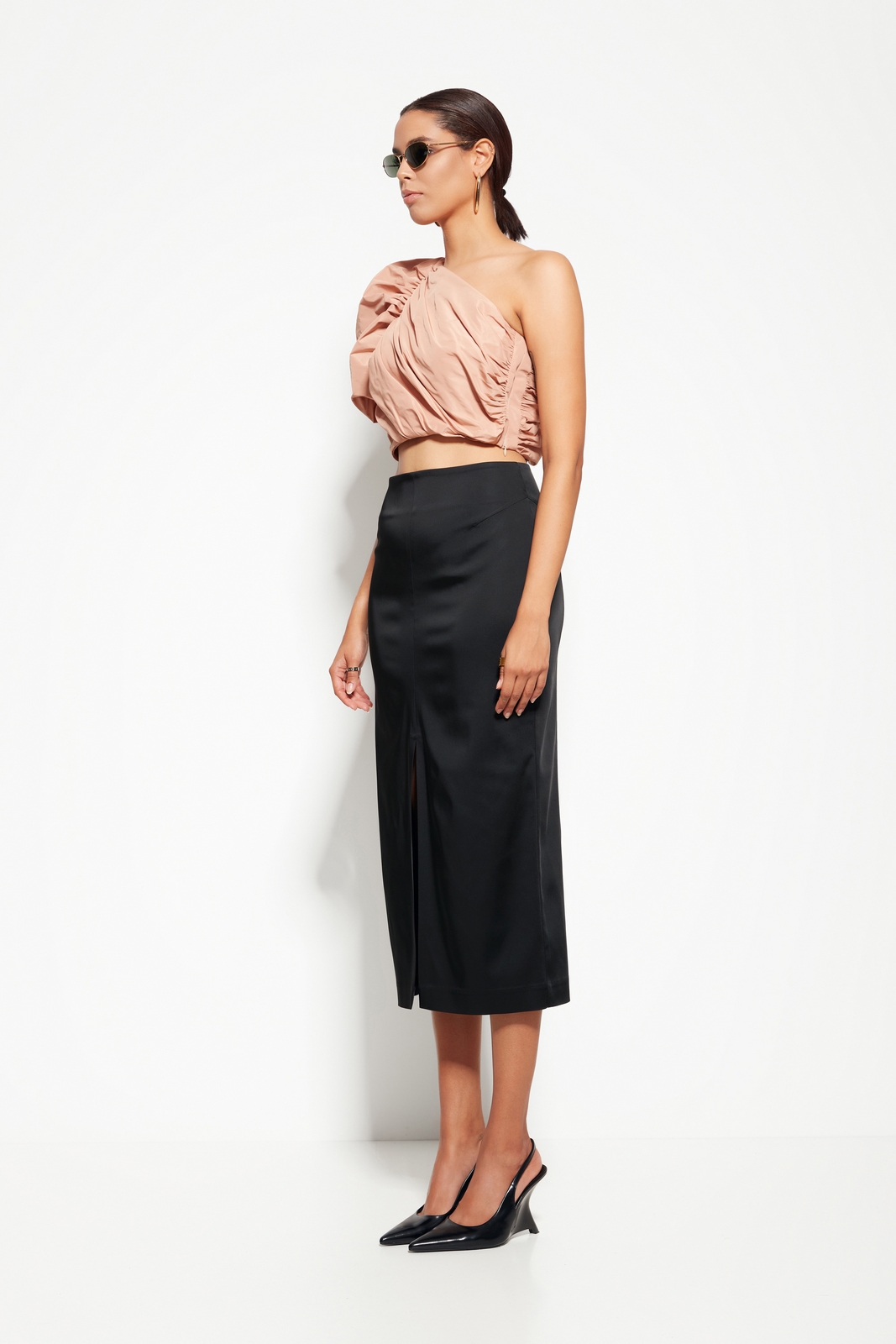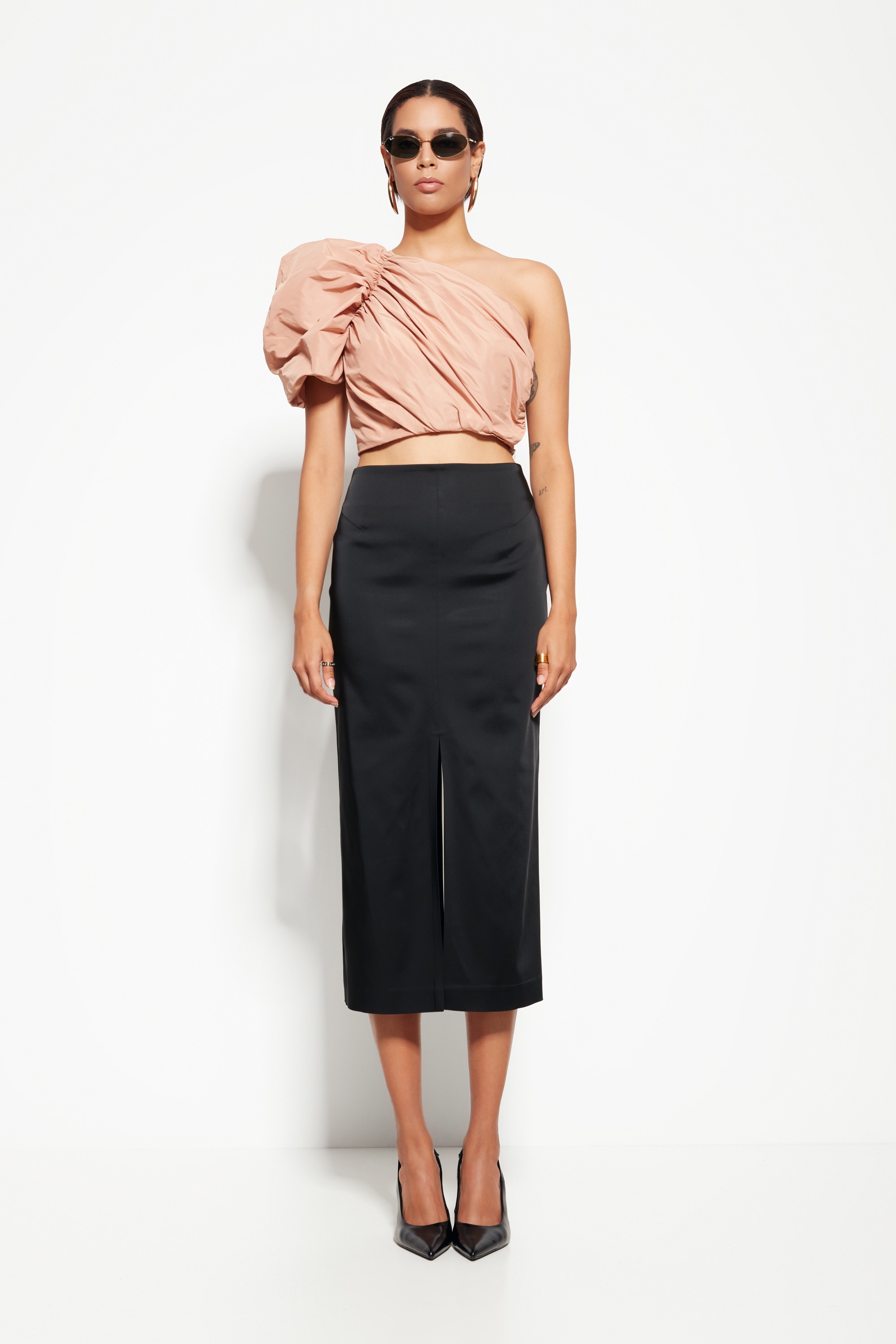 Черная юбка из коллекции Party 2026 - изящная модель с мягким силуэтом, подчёркивающая женственность, но при этом сохраняющая лёгкость и свободу движений. Изделие выполнено из нежной ткани с деликатным блеском, что делает его ярким акцентом в праздничном или вечернем наряде.