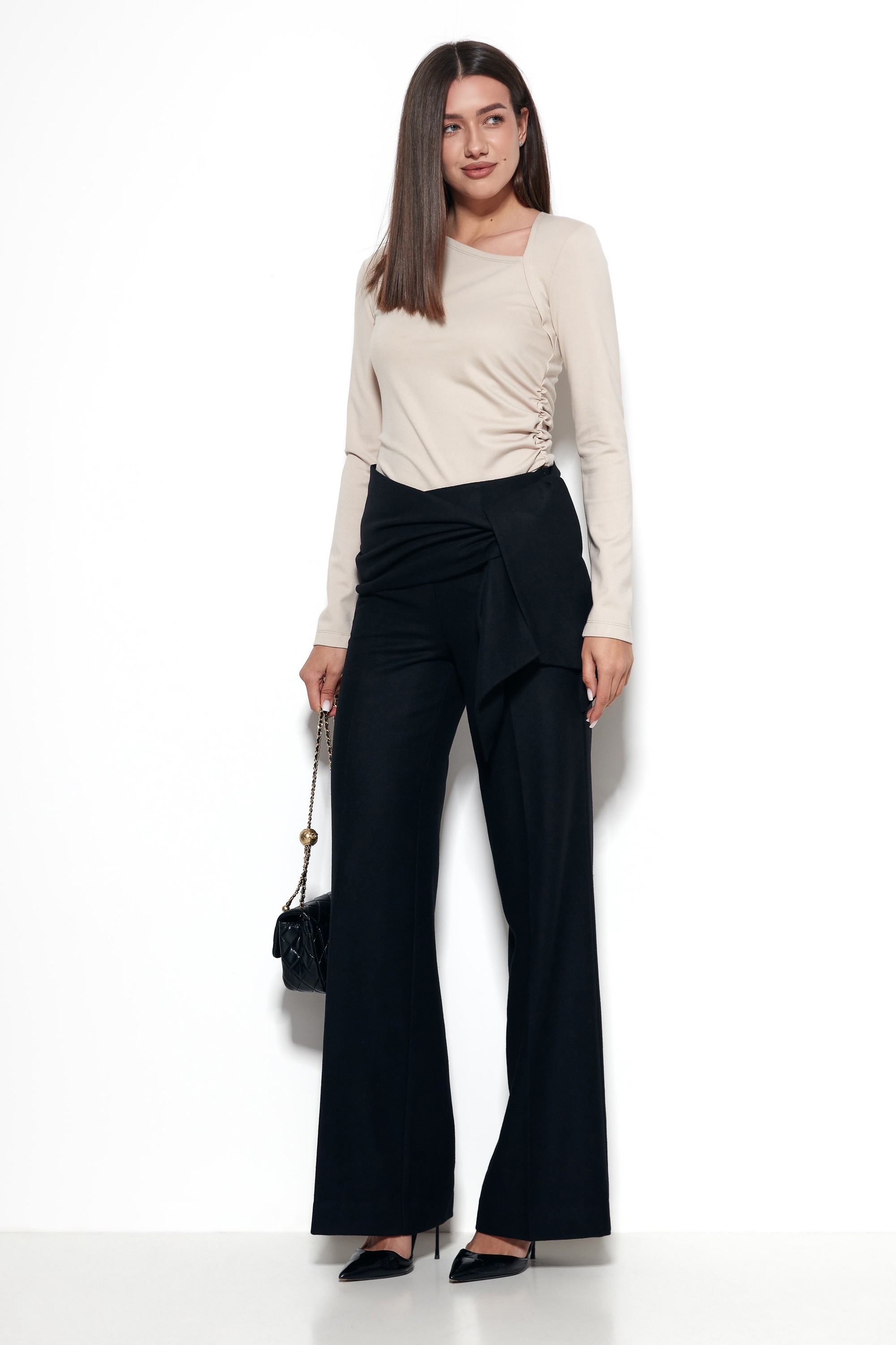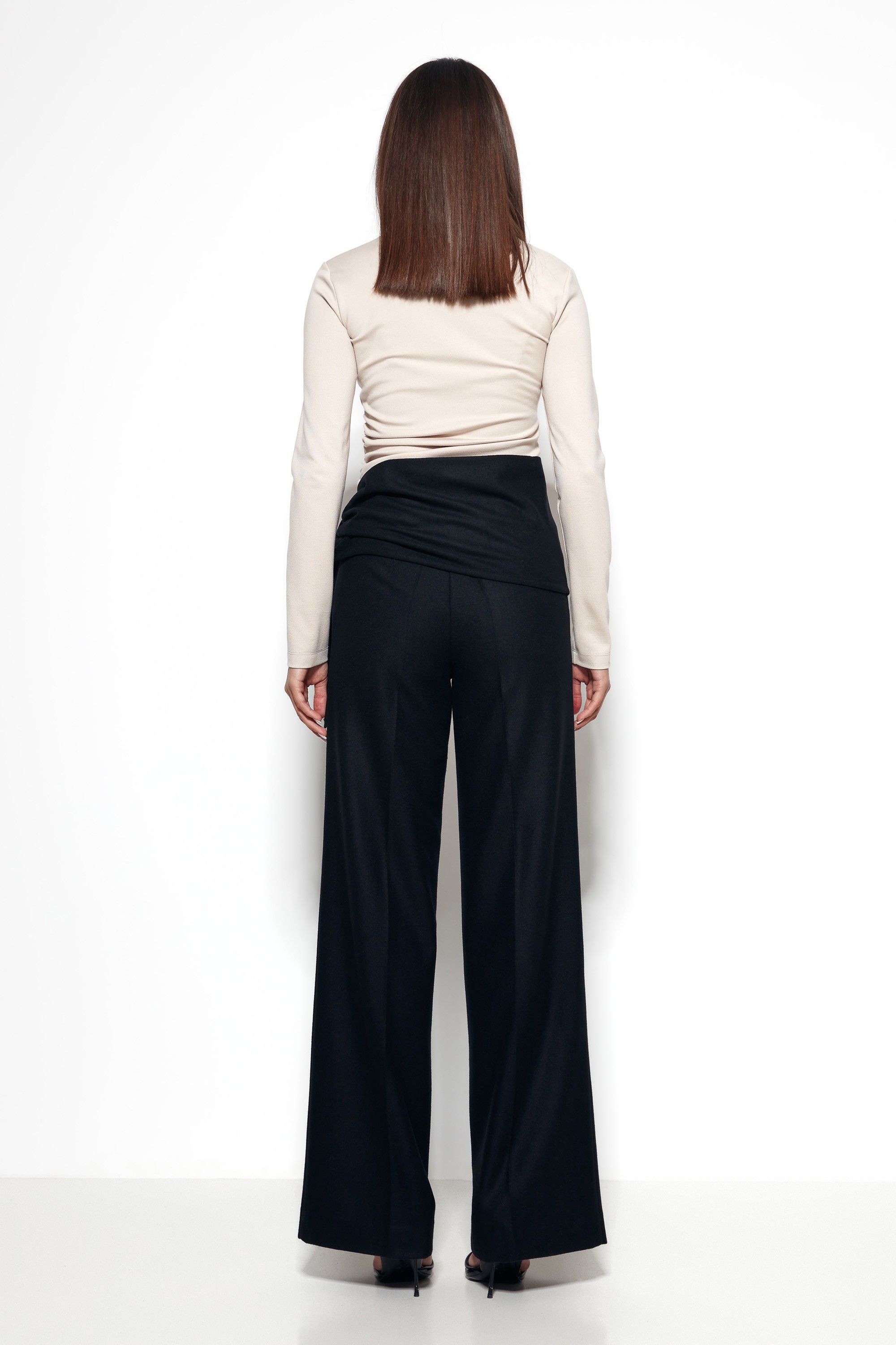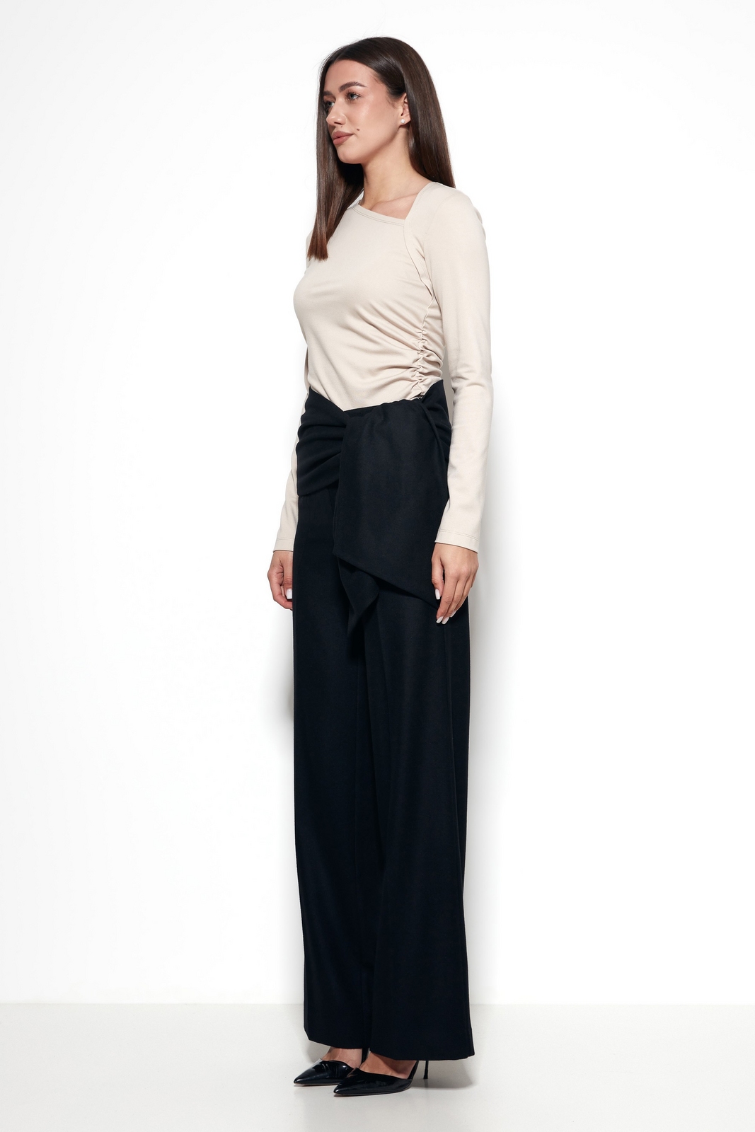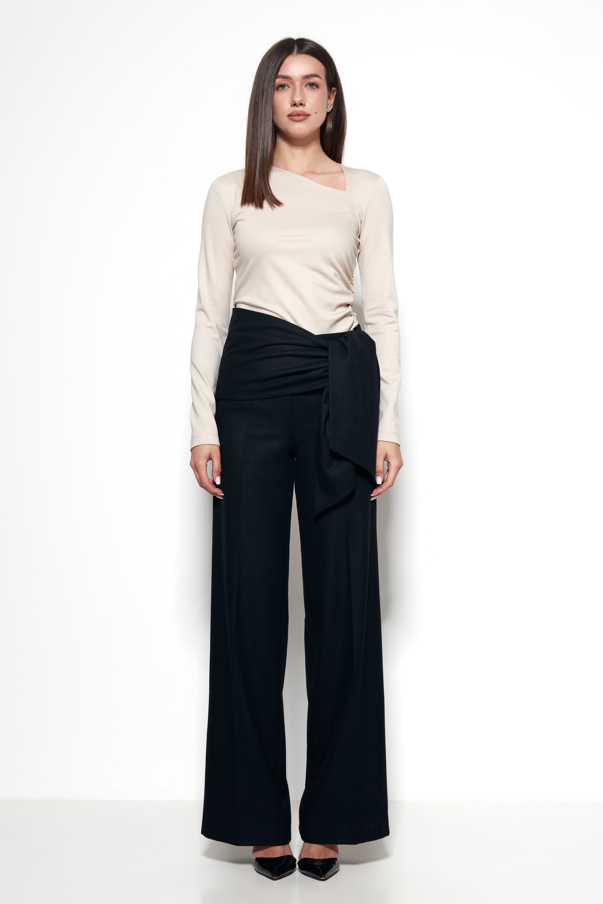 Брюки с широким съемным поясом из аналогичной ткани, который подчеркивает линию бедер и делает образ элегантным и изысканным.