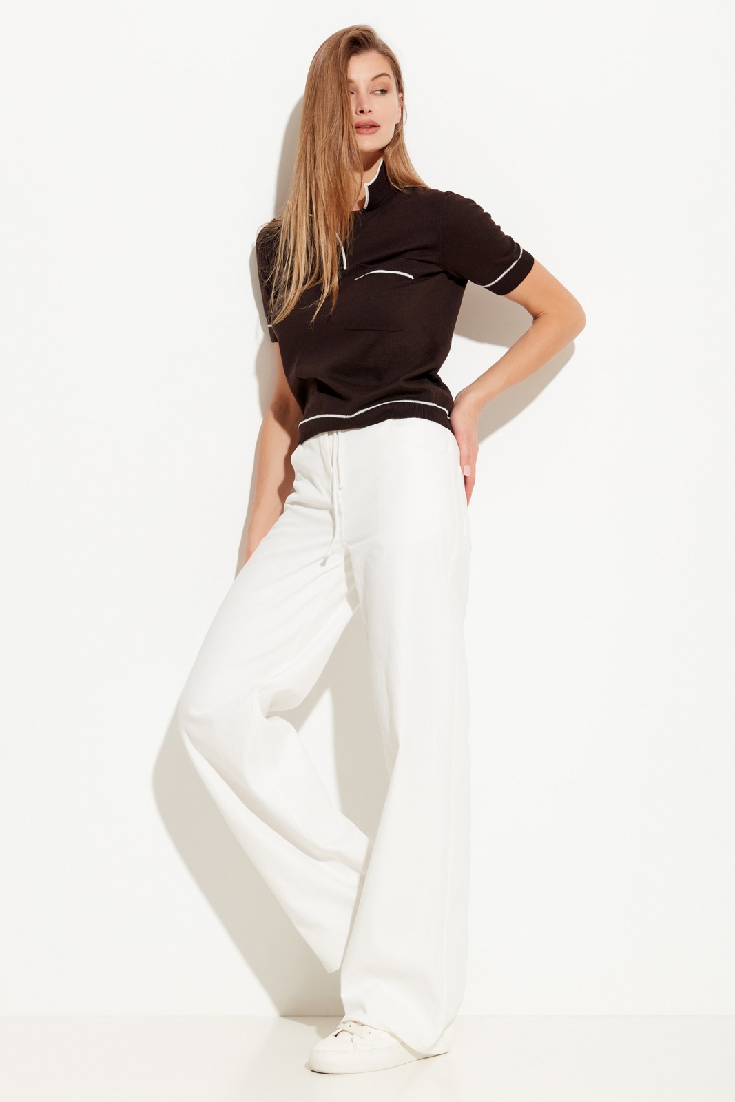 Джемпер вязаный полуприлегающего силуэта, длиной выше линии бедер. Воротник отложной. На груди накладной карман. Воротник, манжеты и карман обрамлены контрастной вставкой из аналогичной пряжи. Классическая, универсальная модель, которая подойдет к любому типу гардероба и по любому случаю.