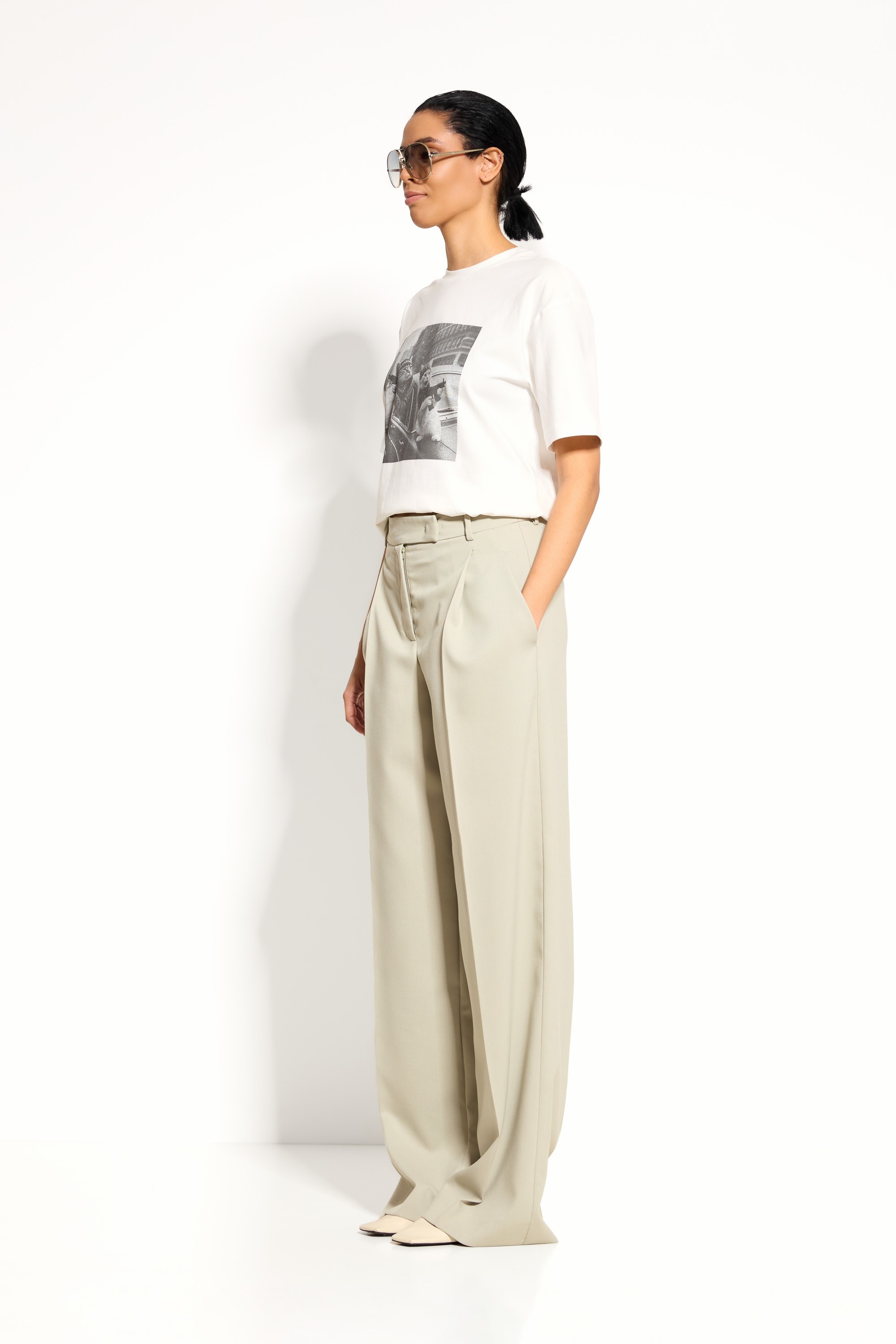 Широкий крой с расширением от линии бедра — свободный силуэт, создающий лёгкость и современный стиль.