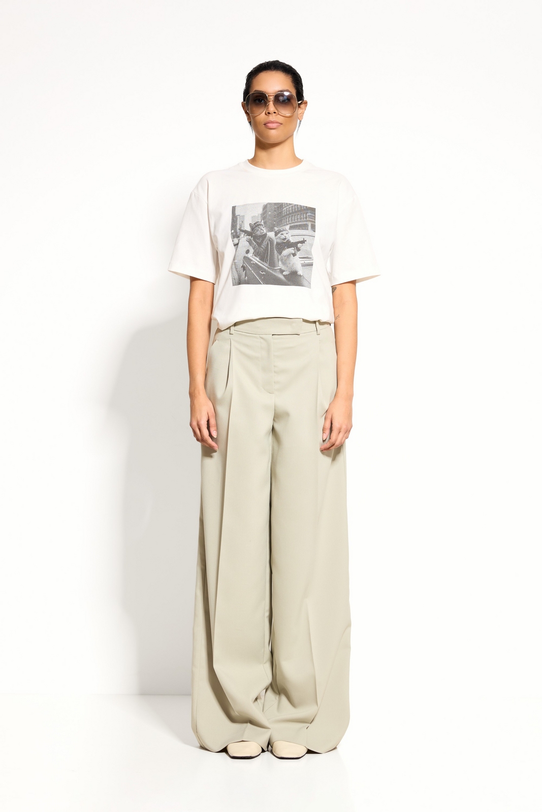 Аксессуары: лаконичные украшения и структурированная сумка подчеркнут длину макси и силуэт брюк.