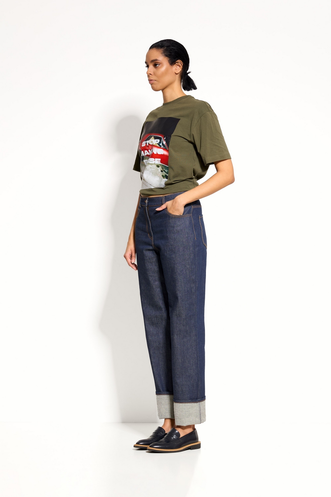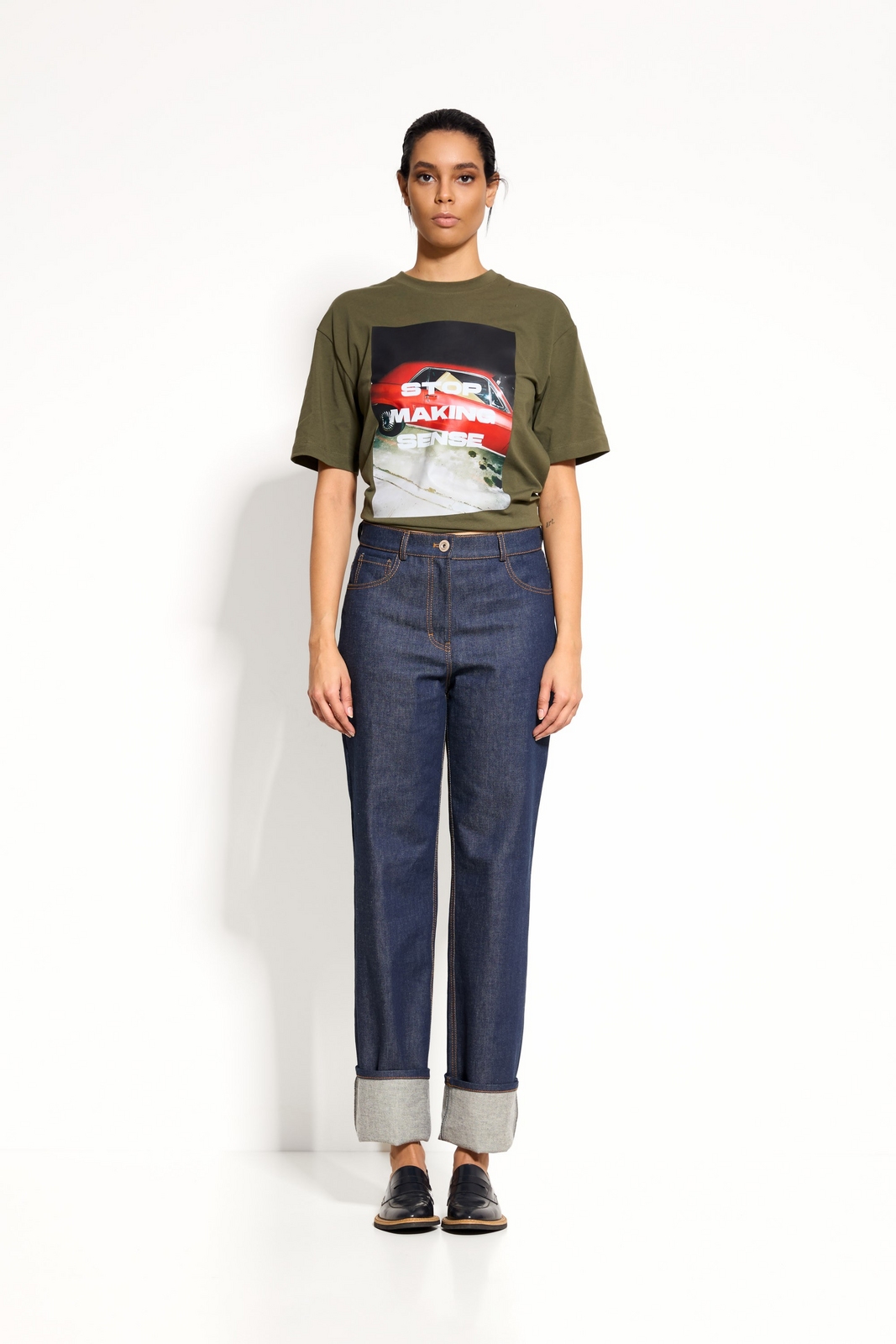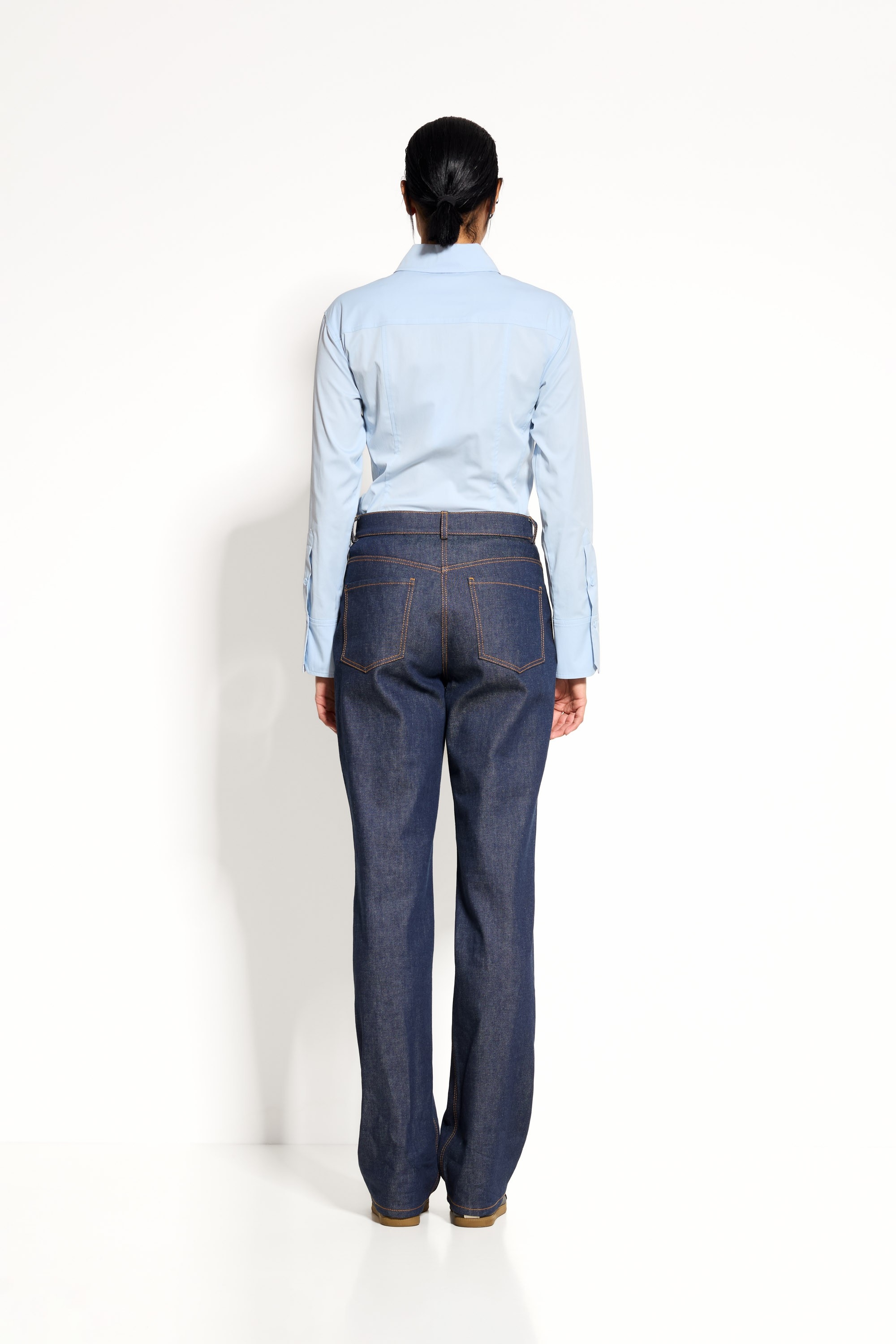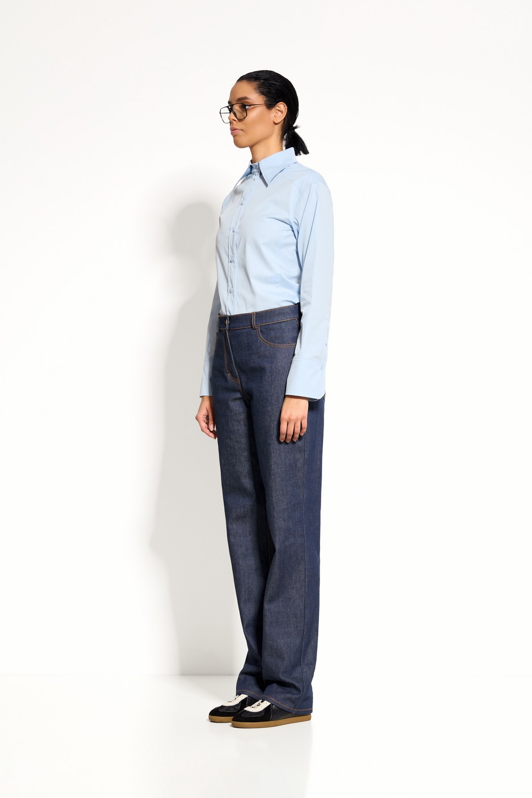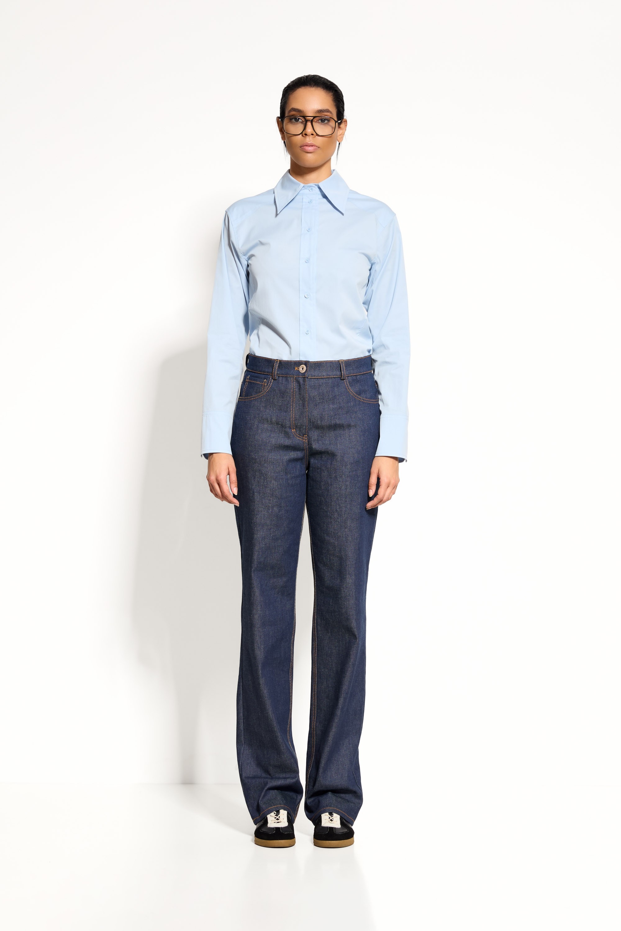 Базовый элемент гардероба: джинсовые брюки прямого кроя — универсальный вариант на каждый день.