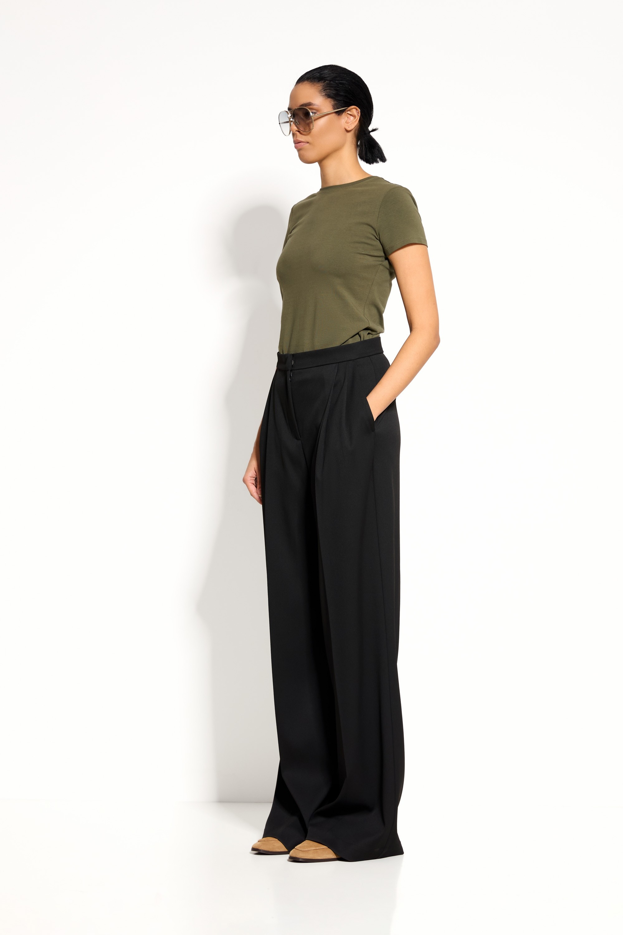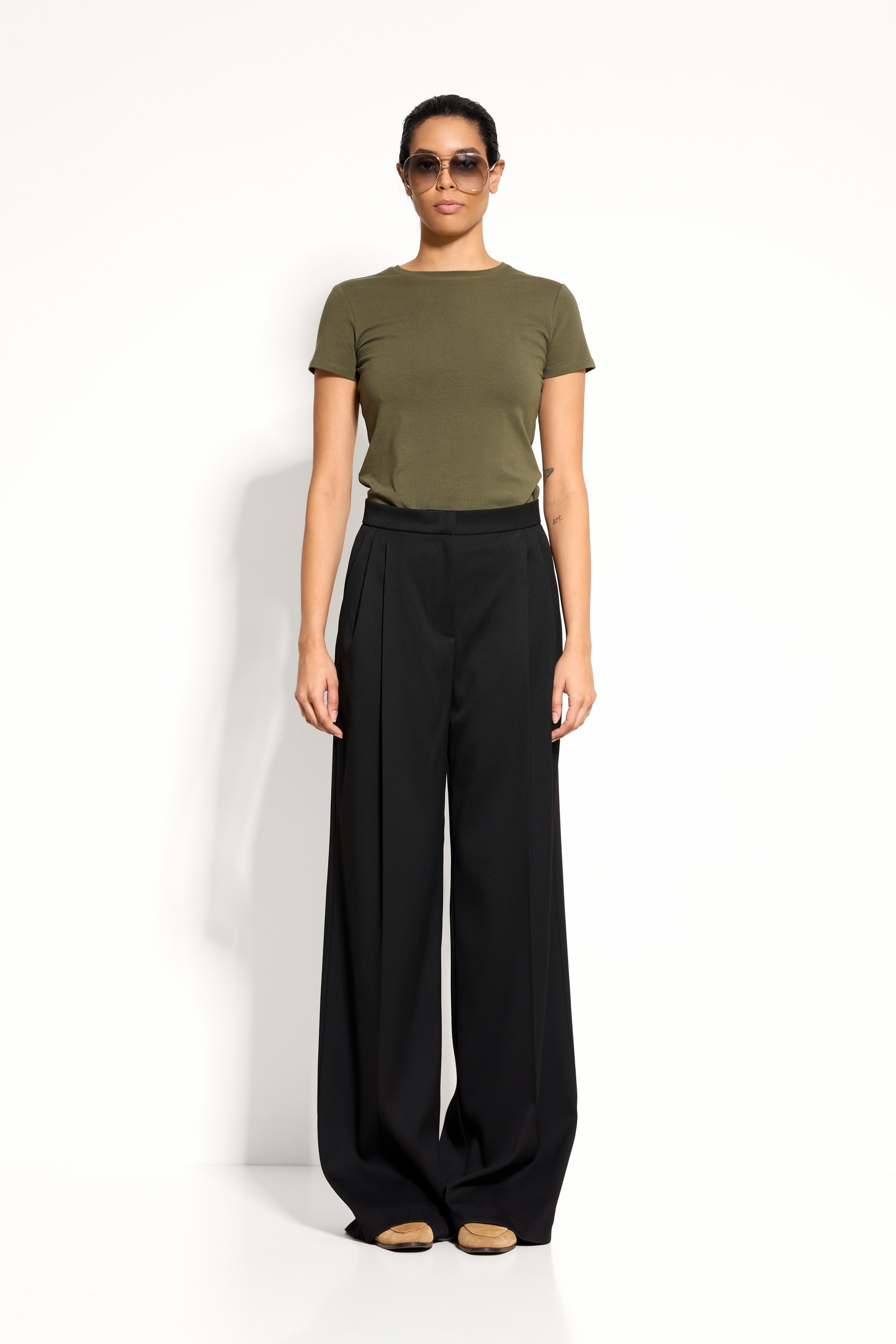 Аксессуары: лаконичные украшения и структурированная сумка подчеркнут объём и элегантность брюк.