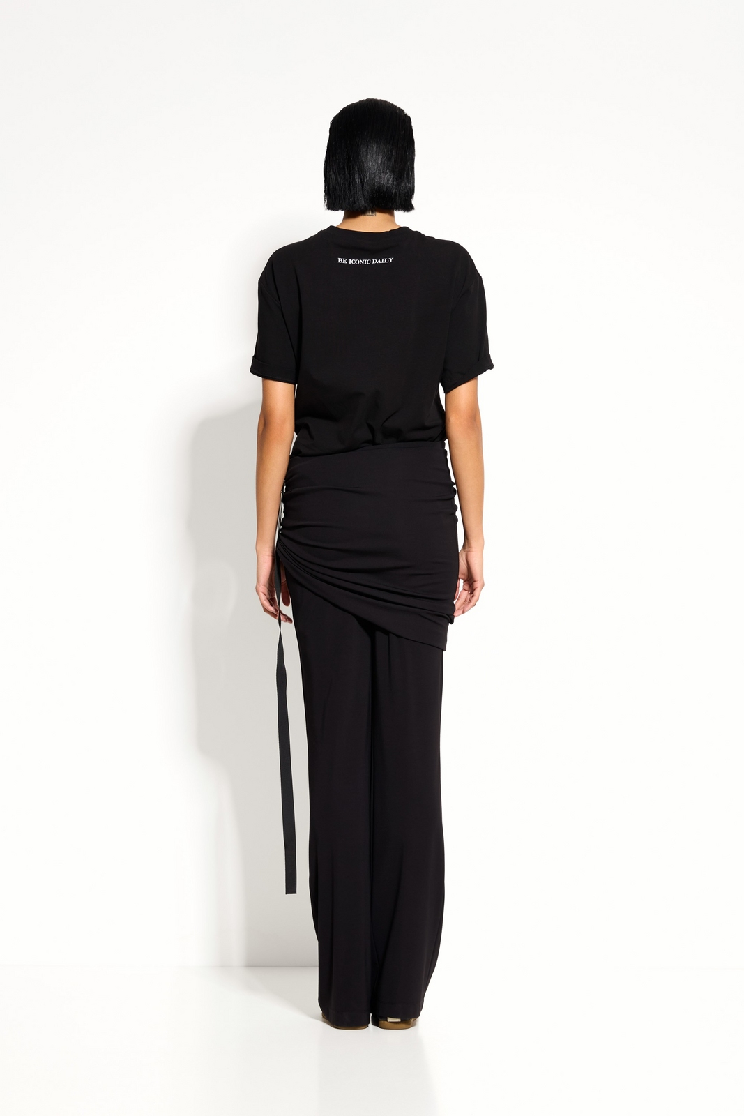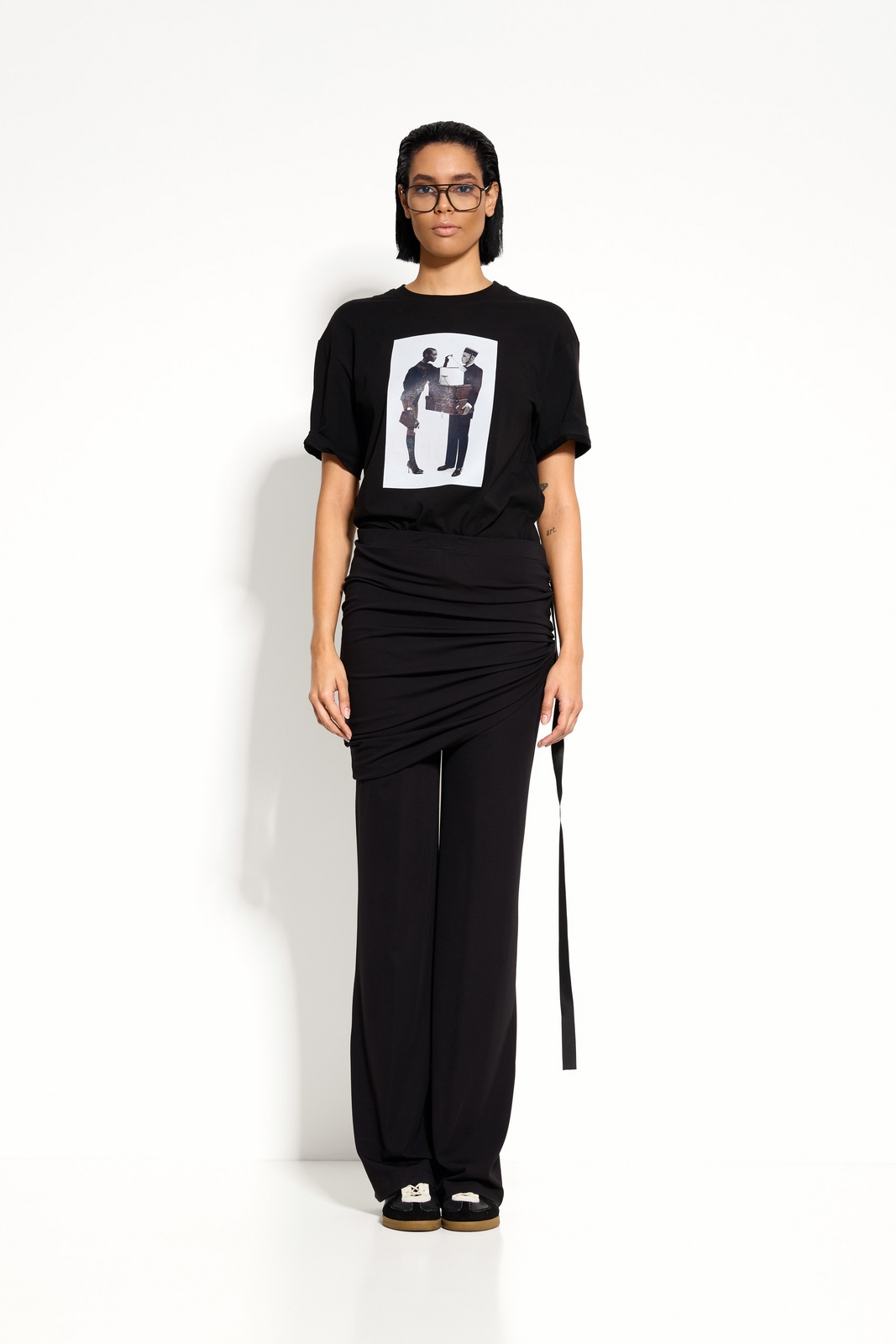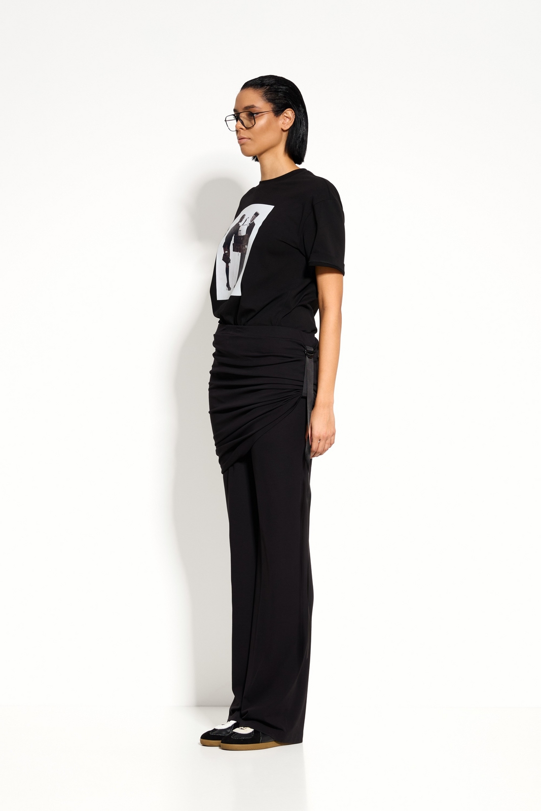 Выразительный акцент — верхний слой‑юбка с драпировкой делает брюки уникальными.