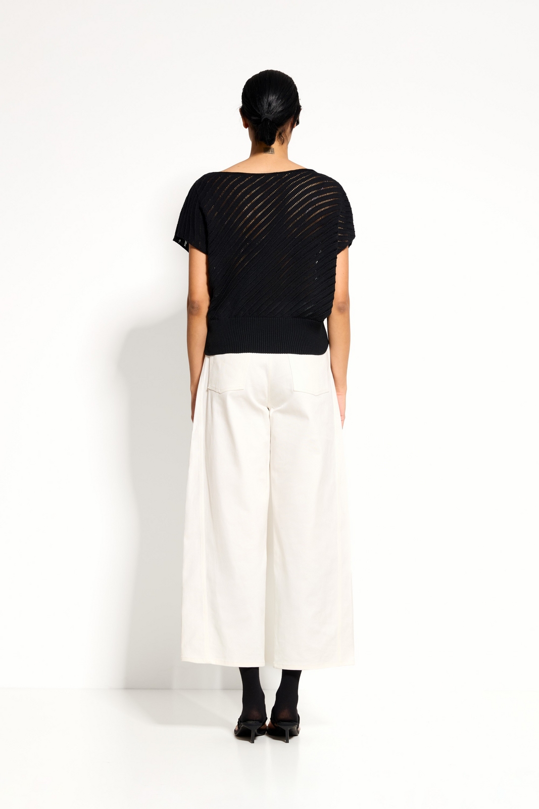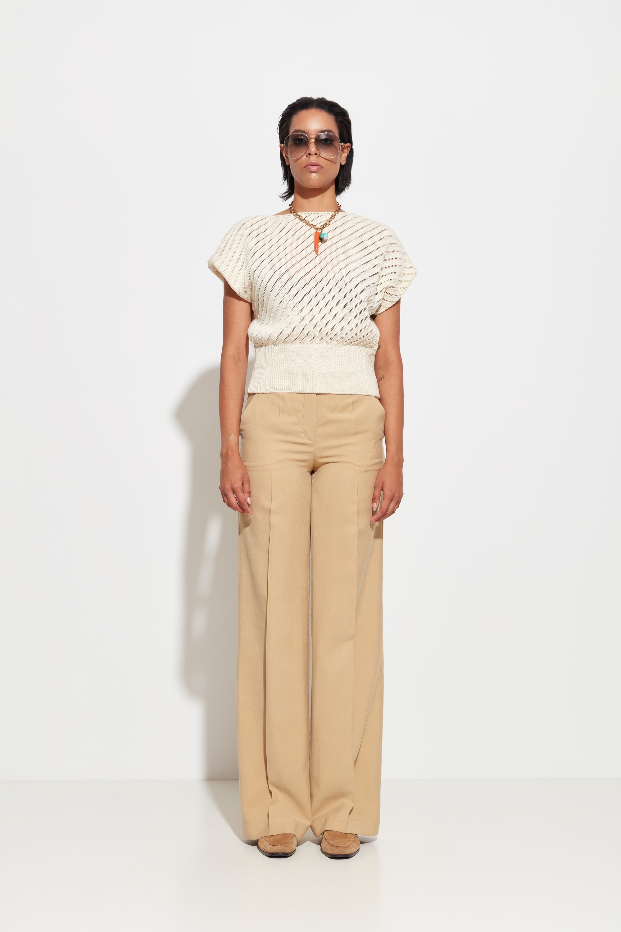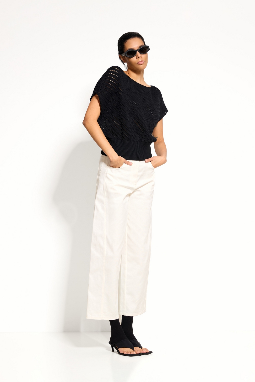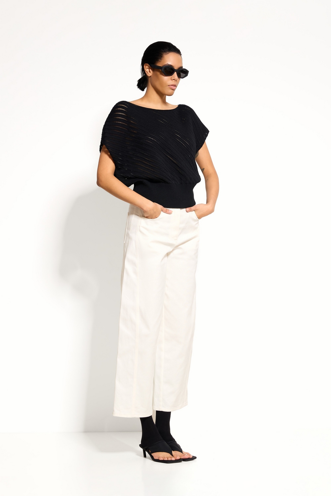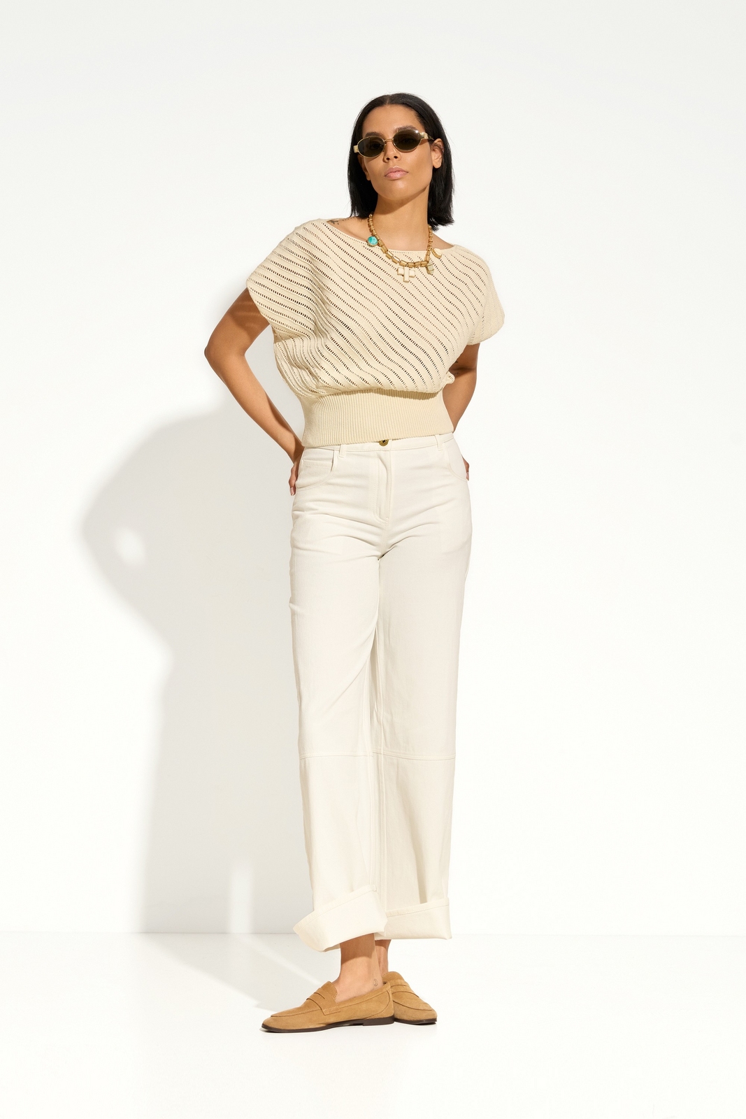Широкий эластичный пояс из вязки — регулируемый объём и аккуратная форма низа.