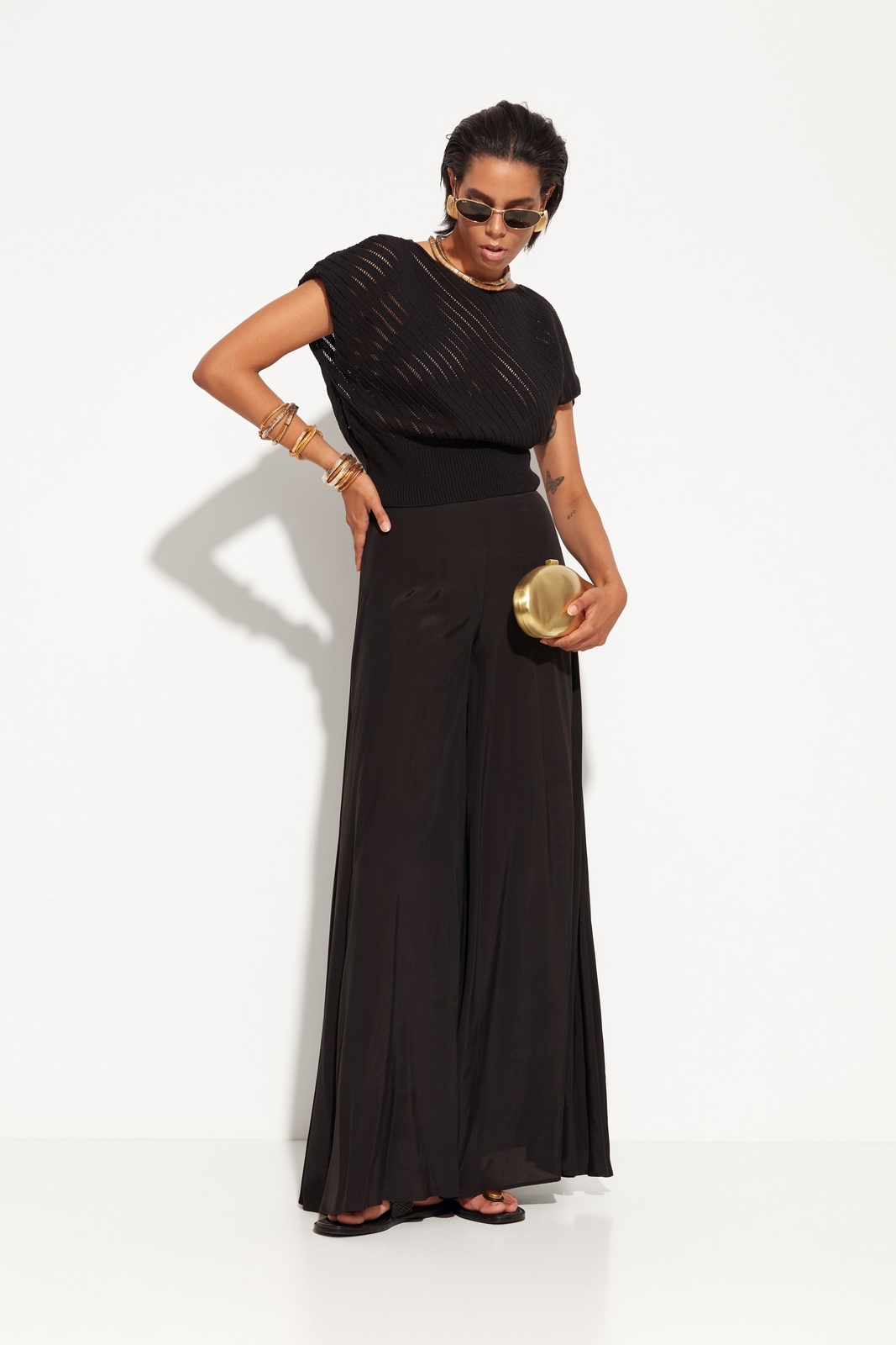 Аксессуары: минималистичные украшения и аккуратная сумка подчеркнут элегантность джемпера и линию пояса.
