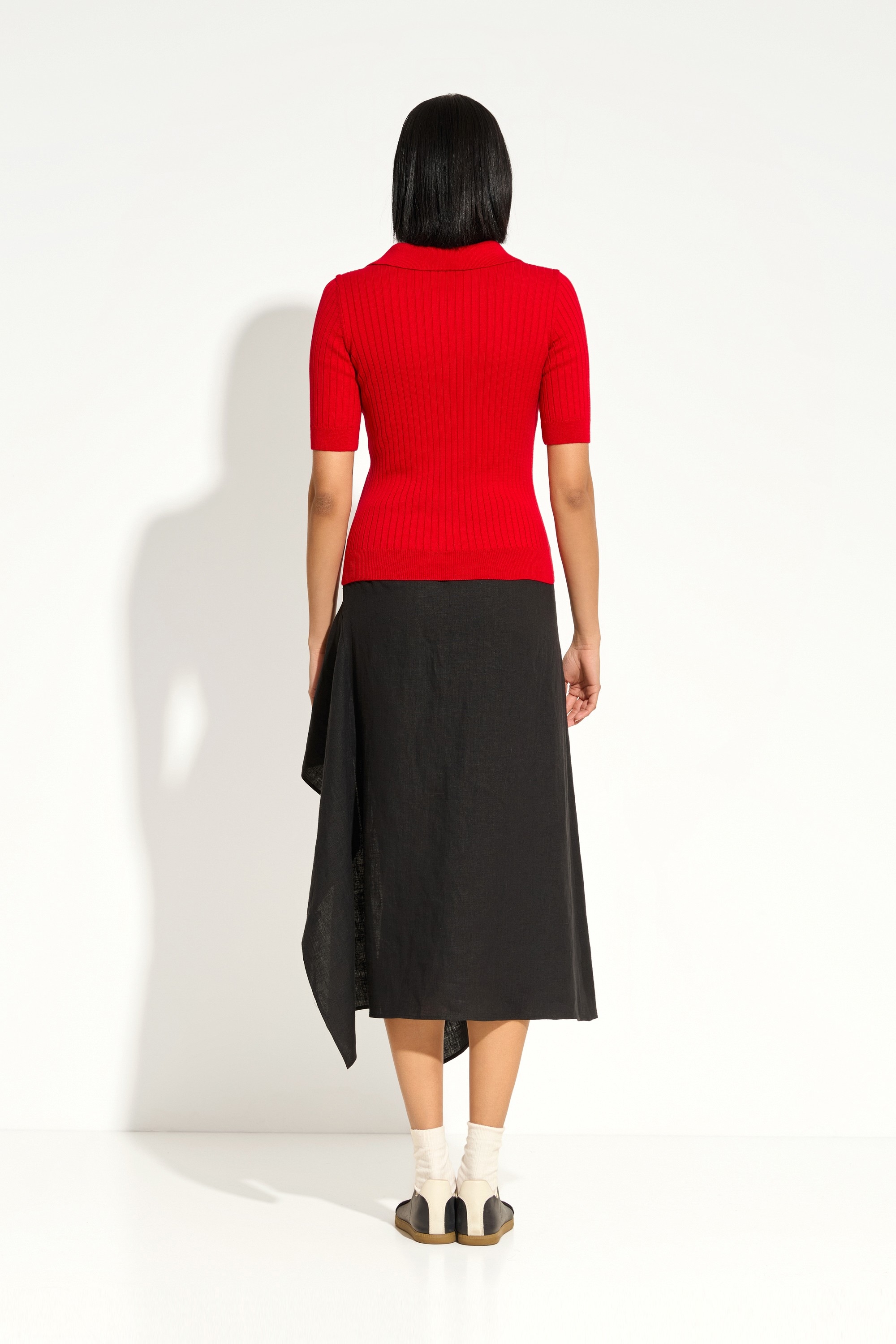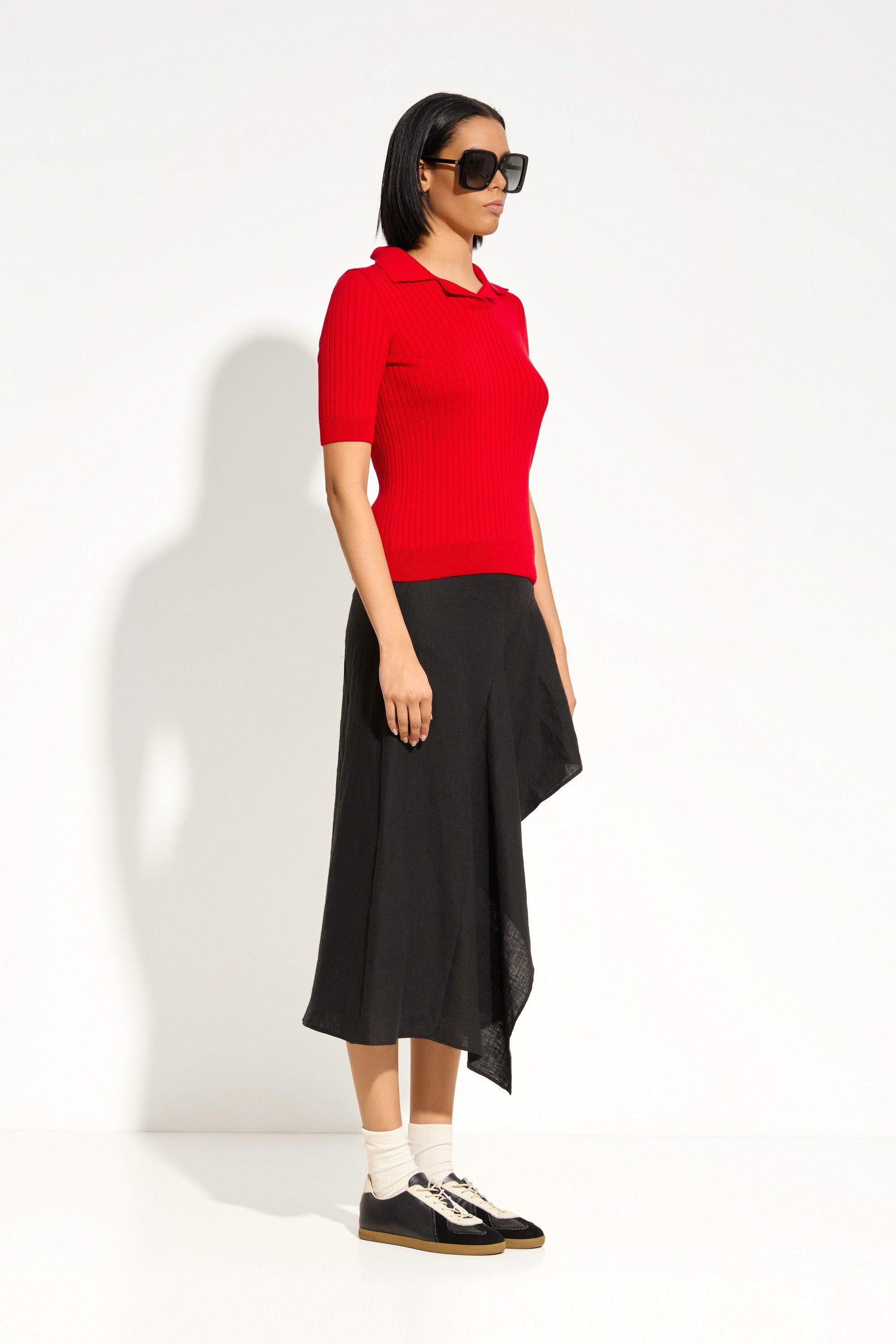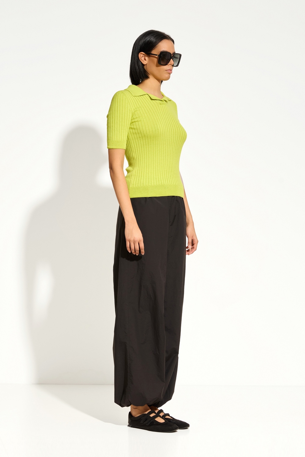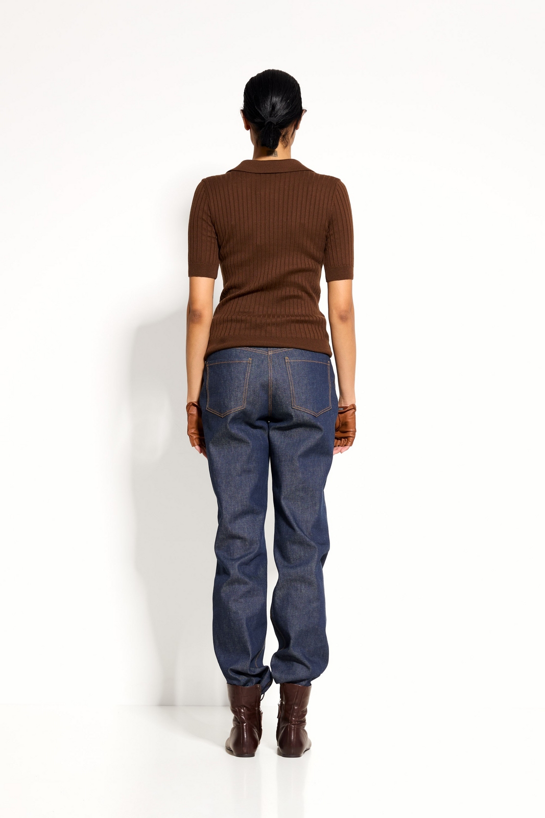 Низ: джинсы, брюки прямого кроя или юбка‑миди для сбалансированного силуэта.