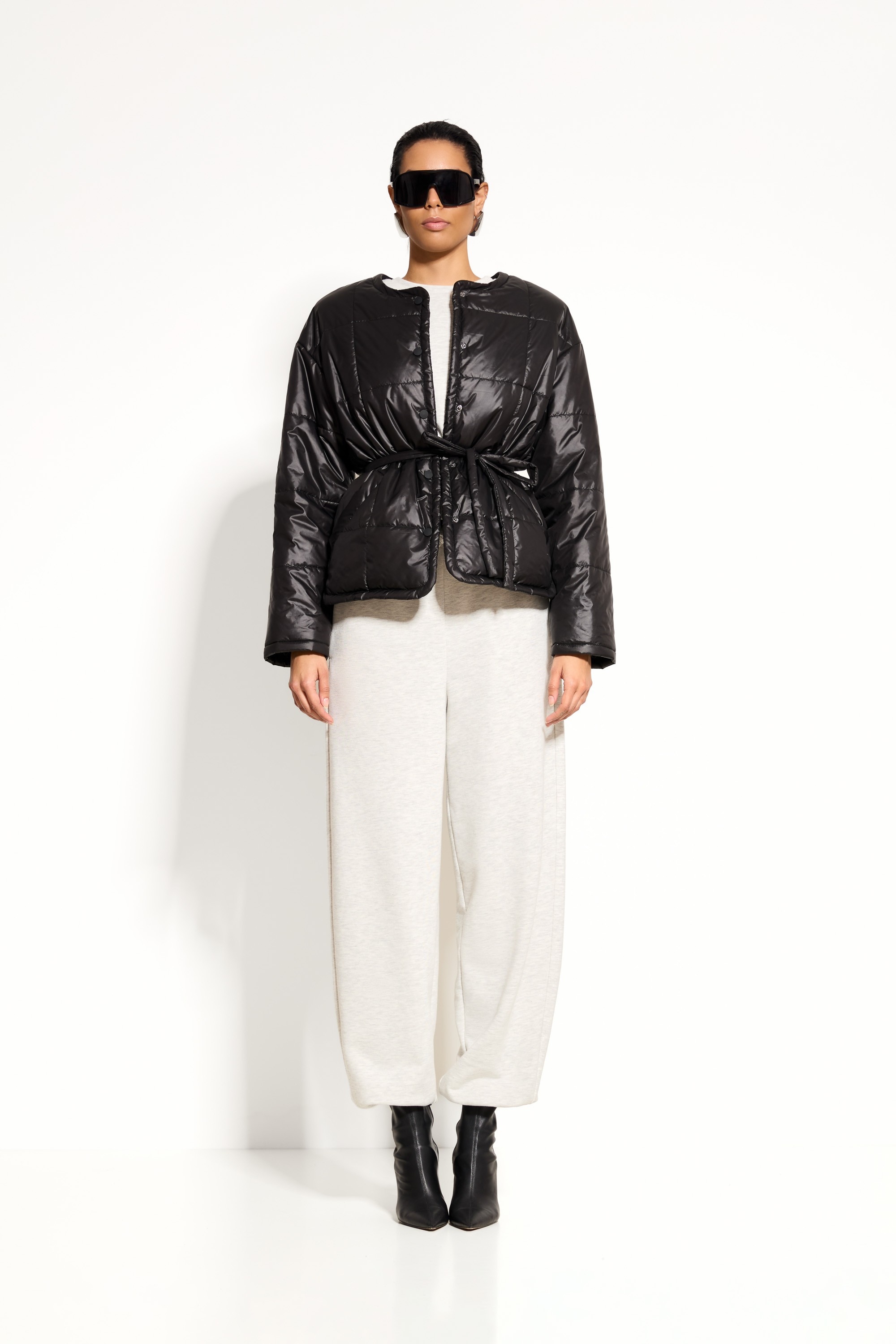 Черная куртка Lakbi 55338 — элегантная модель в чёрном цвете с круглой горловиной и спущенной линией плеч, которая создаёт свободный и непринуждённый силуэт. Пояс из аналогичной ткани позволяет подчеркнуть талию и регулировать объём, а застёжка на кнопки обеспечивает удобство и практичность. Наполнитель изософт и стежка в крупный квадрат делают куртку тёплой, лёгкой и визуально выразительной, идеально подходящей для повседневного и городского стиля.
