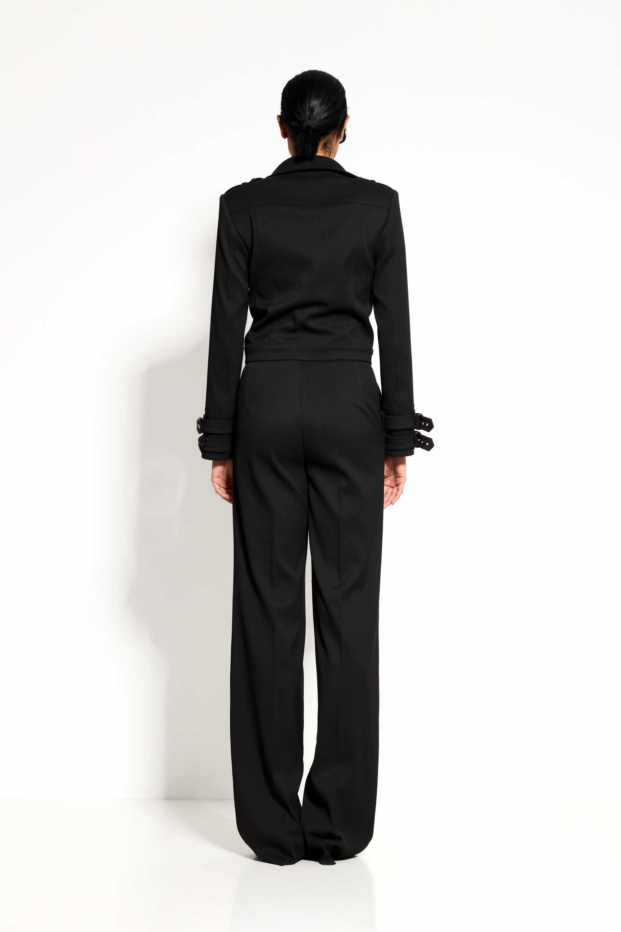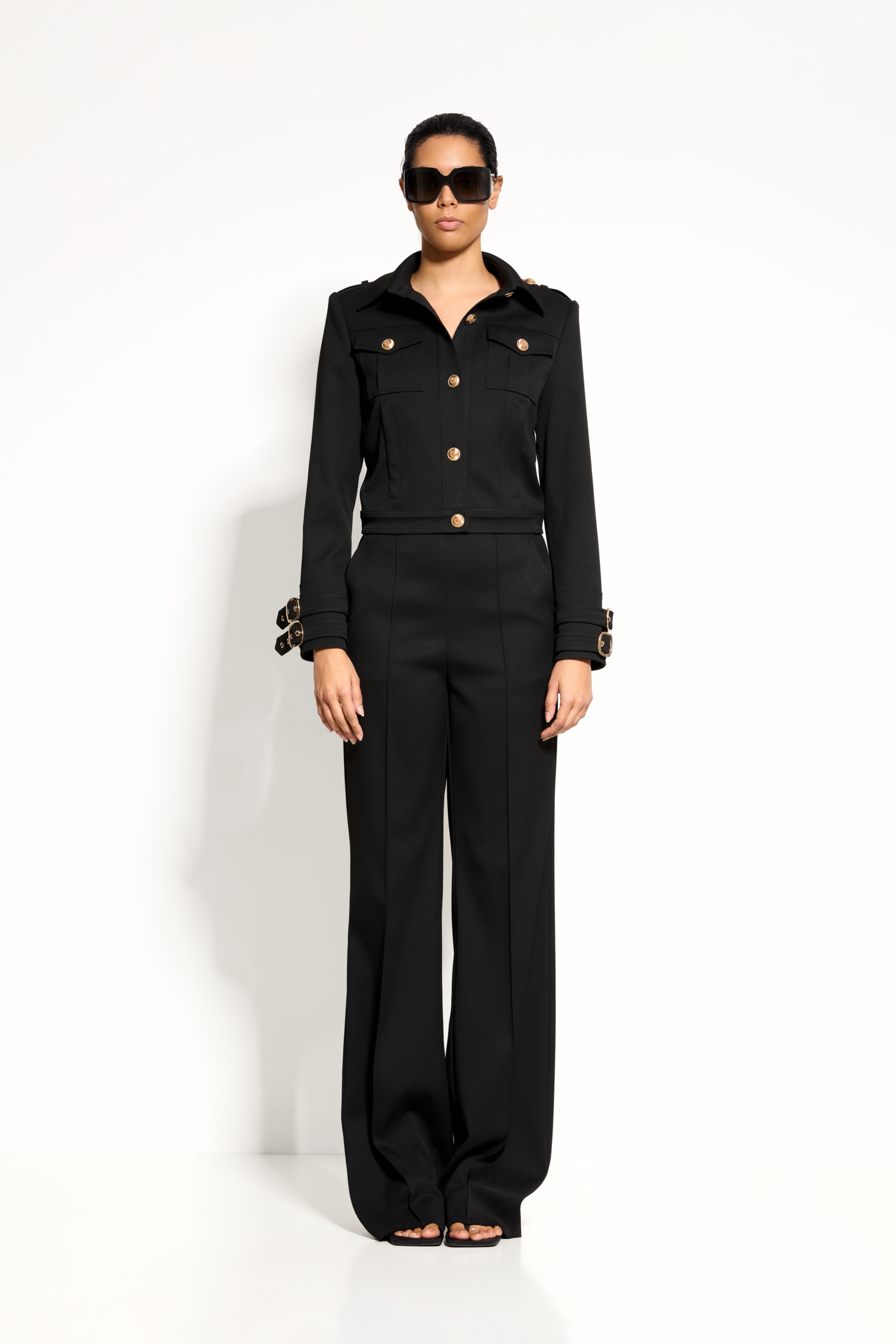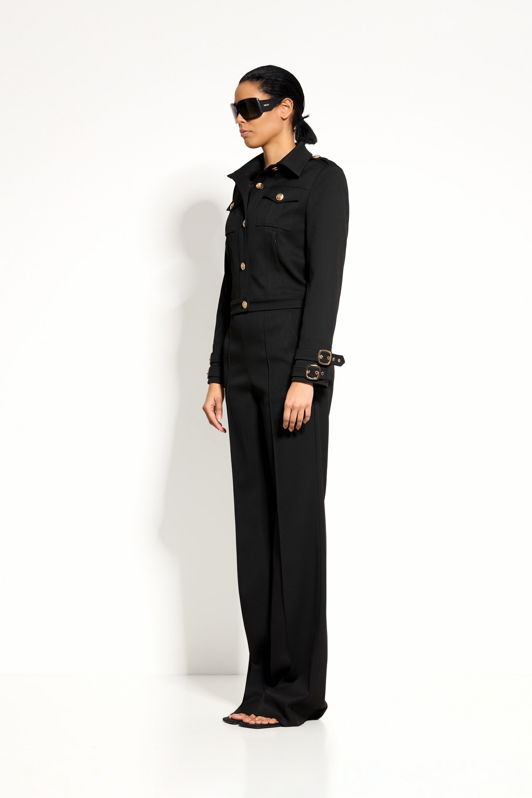 Выразительные детали — золотые пуговицы и декоративные ремешки создают модный акцент.