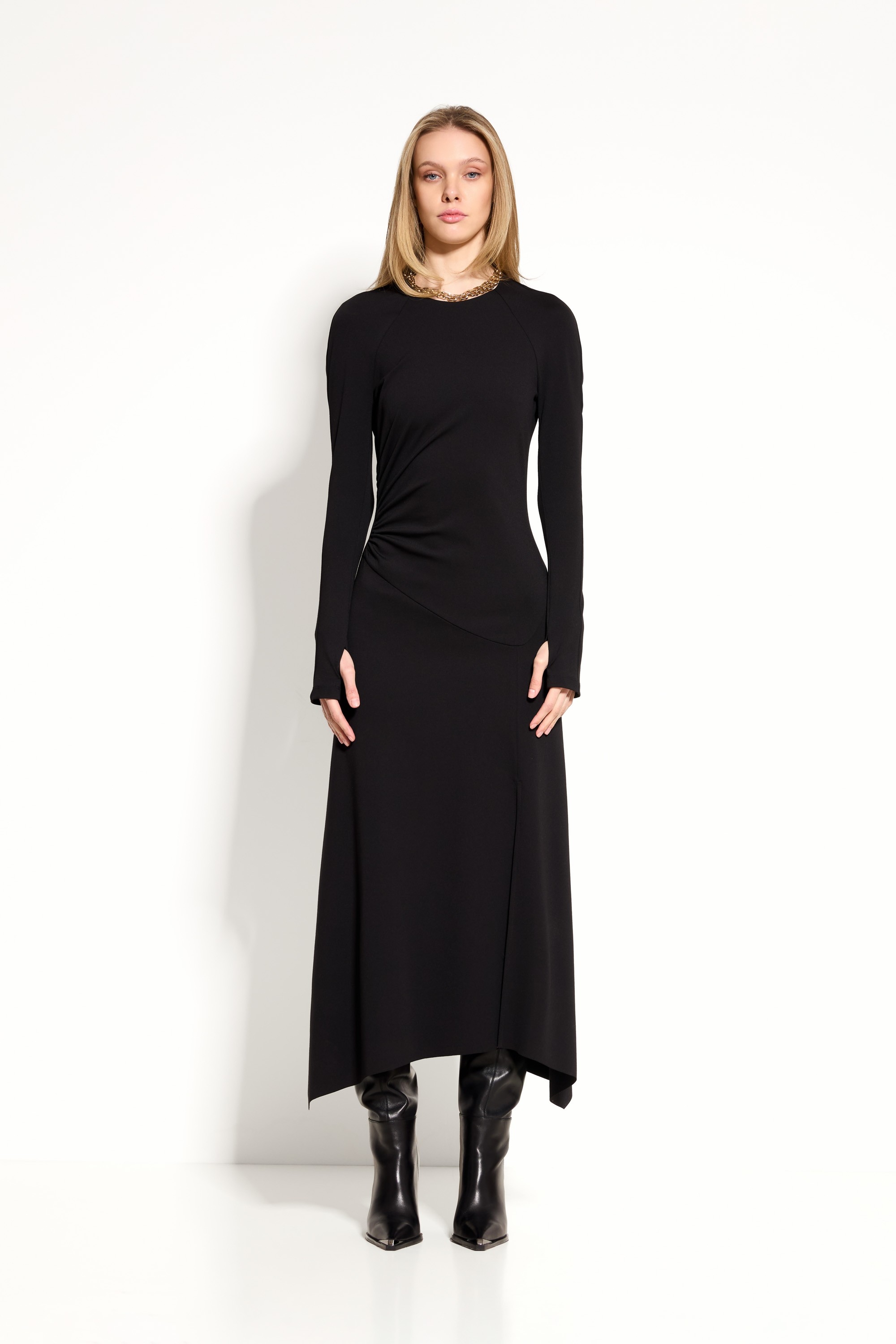 Платье Lakbi 55378 — стильная миди-модель с мягкой спущенной линией плеч и удлинёнными рукавами с прорезями для больших пальцев, которая сочетает комфорт, актуальный силуэт и выразительные детали. А‑образный низ создаёт лёгкий объём, а эффектный разрез спереди добавляет динамики и делает образ более женственным. Эта модель станет универсальной базой гардероба, подходящей как для повседневных, так и для более эффектных аутфитов.