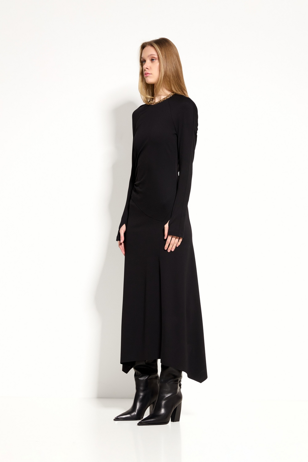 Удлинённый рукав с прорезями для больших пальцев — функциональная и стильная деталь.