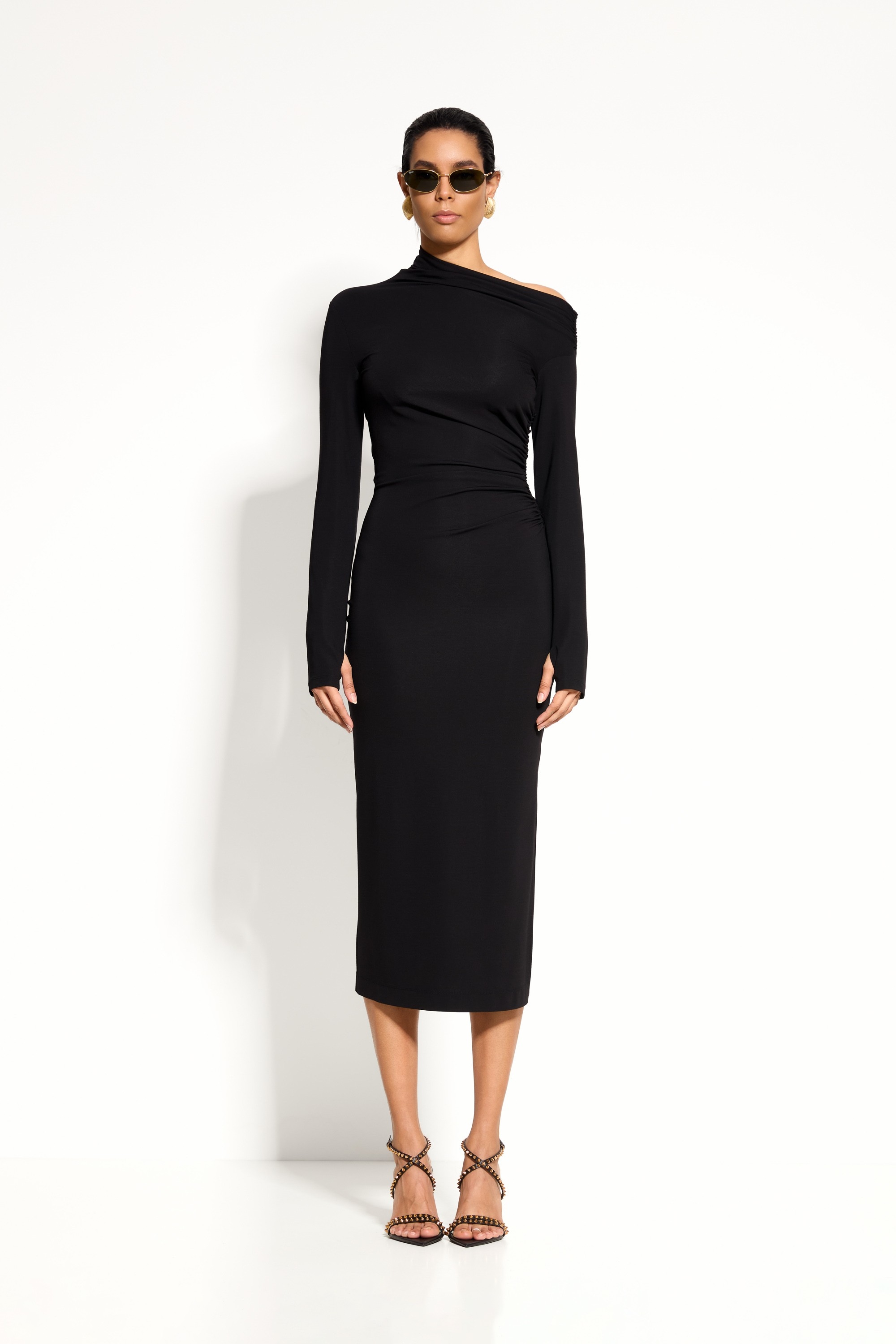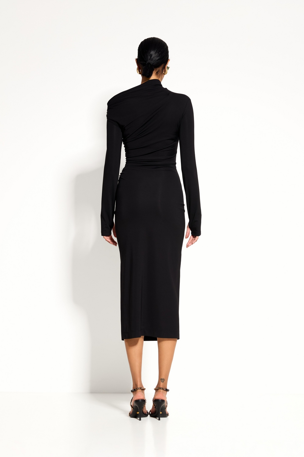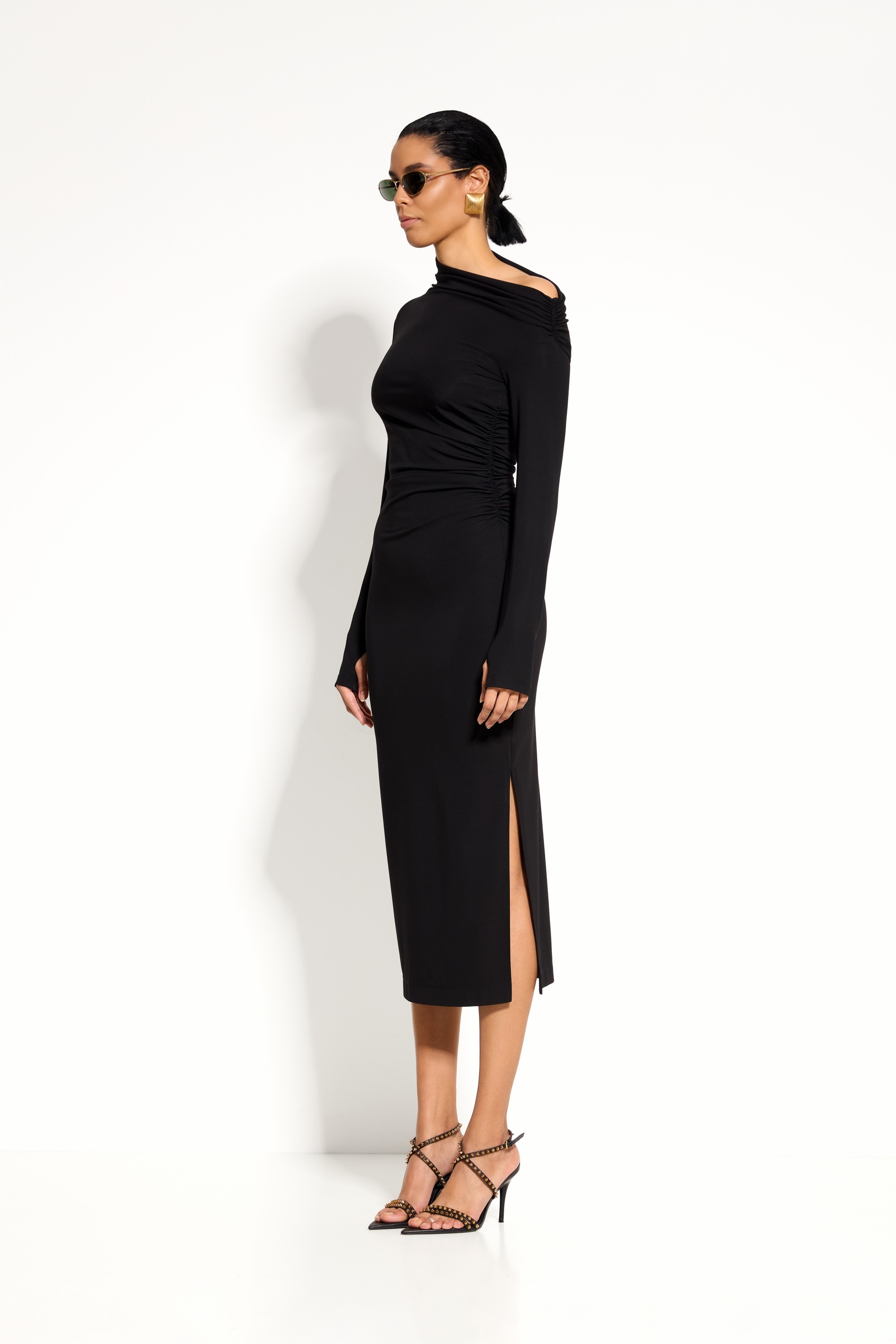 Современный дизайн: сочетание облегающего силуэта, разреза и оригинальных рукавов создаёт стильный, выразительный образ.