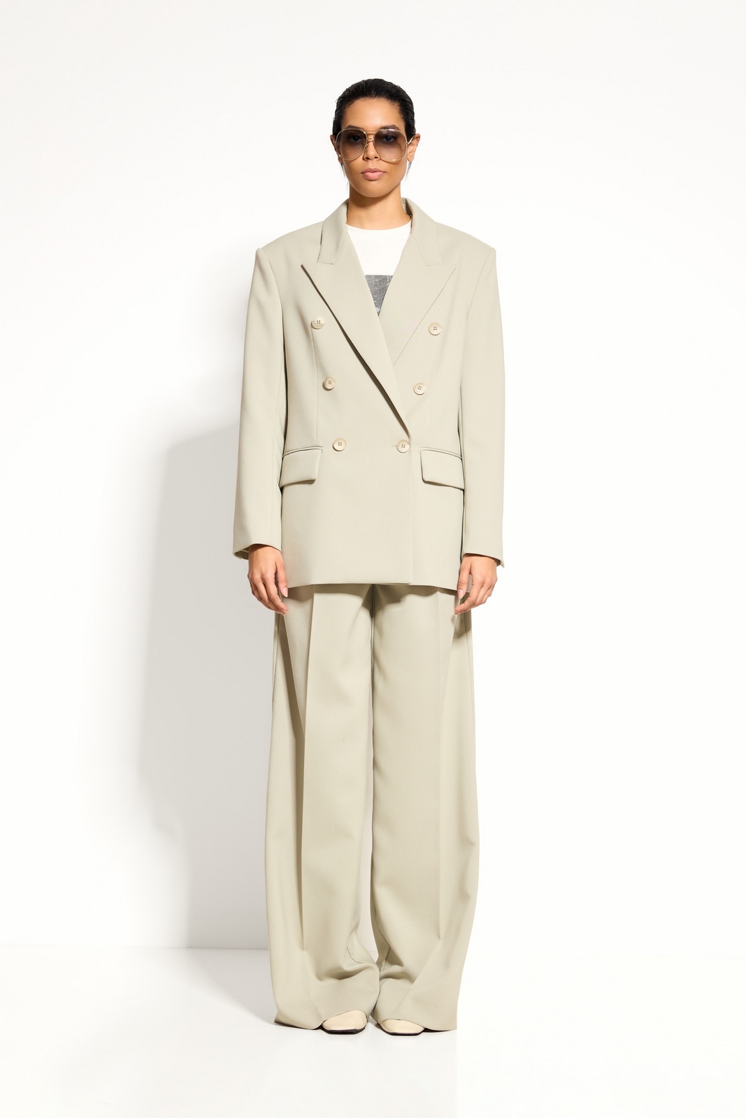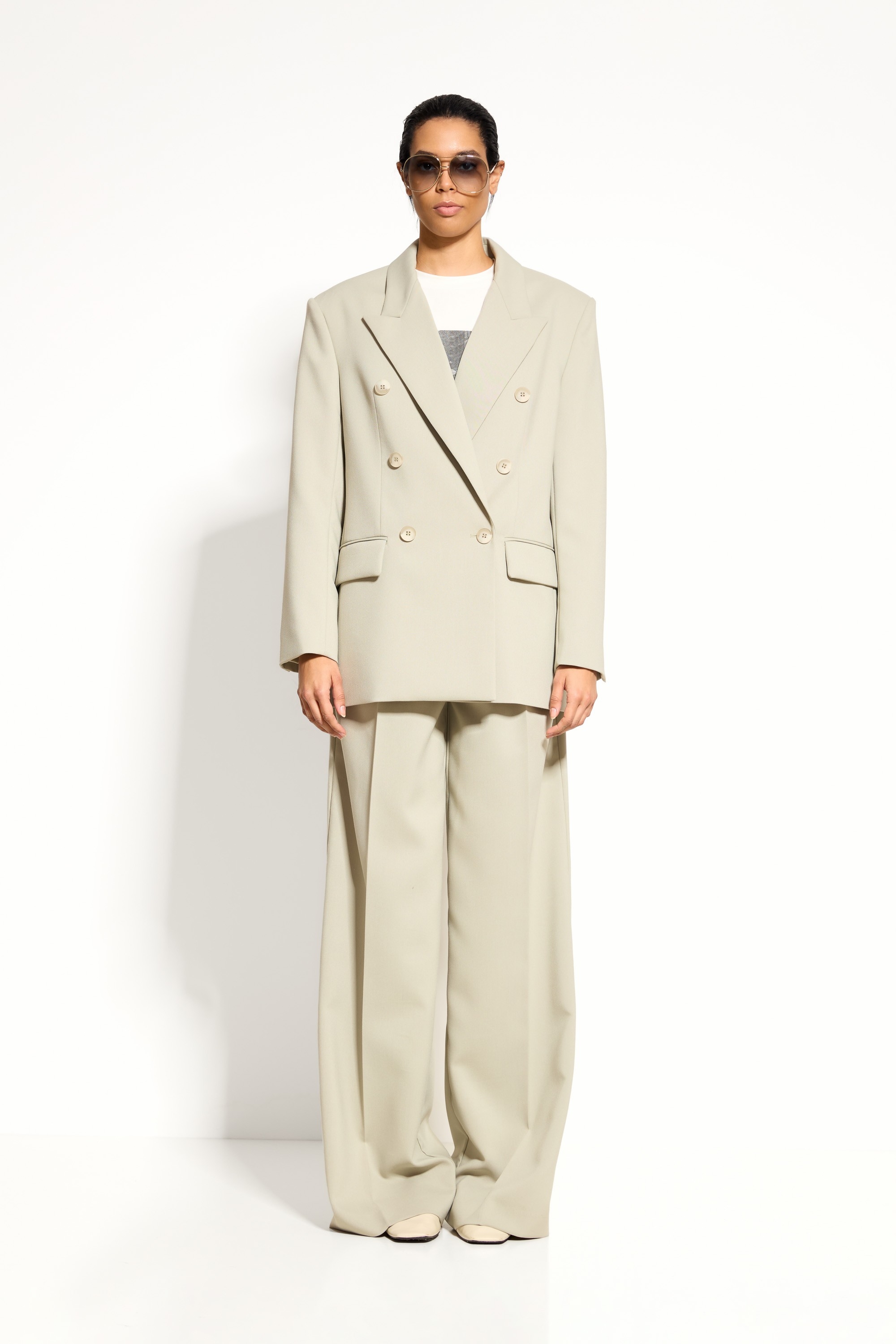 Верх: однотонная рубашка, блуза или базовый топ для сбалансированного силуэта.