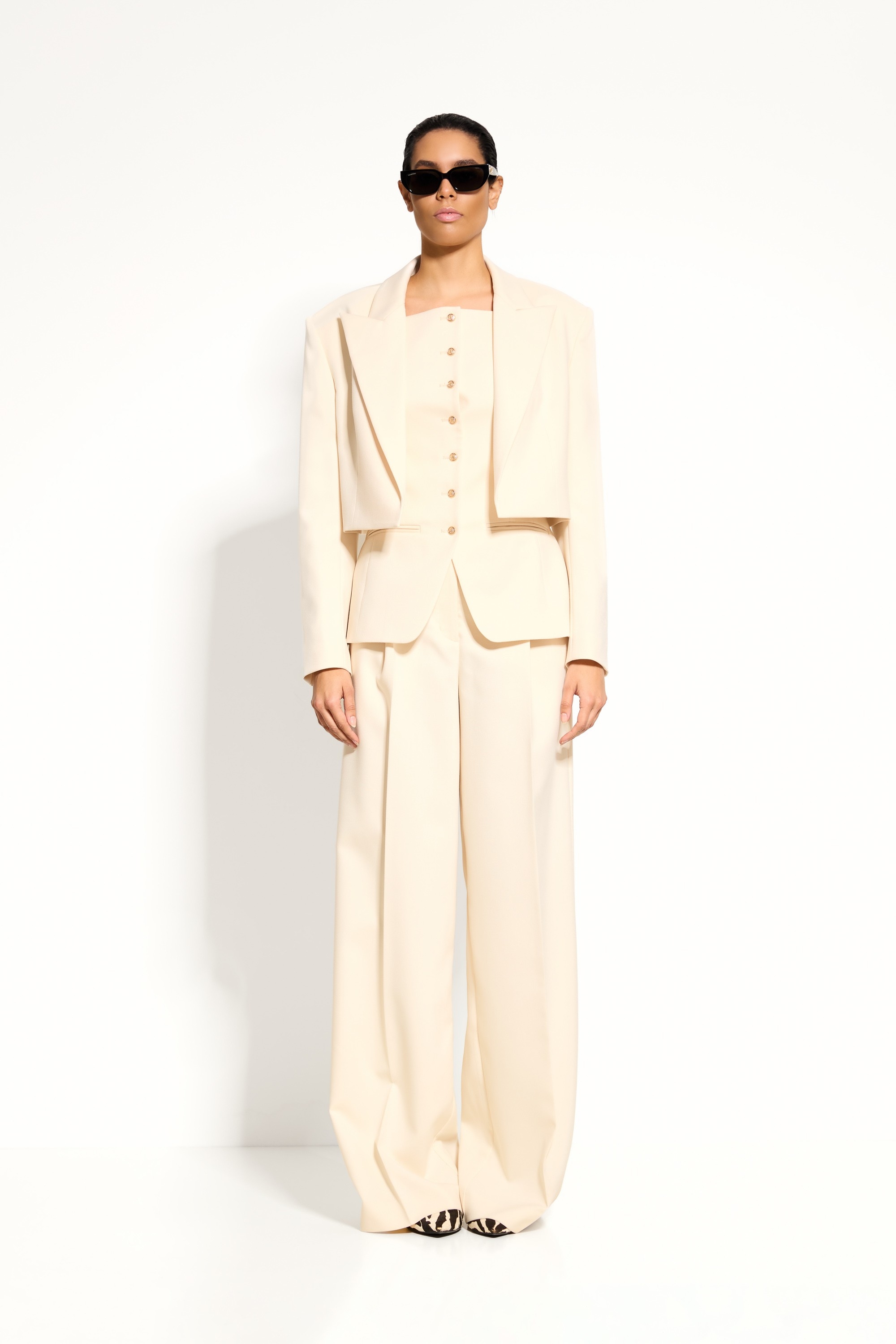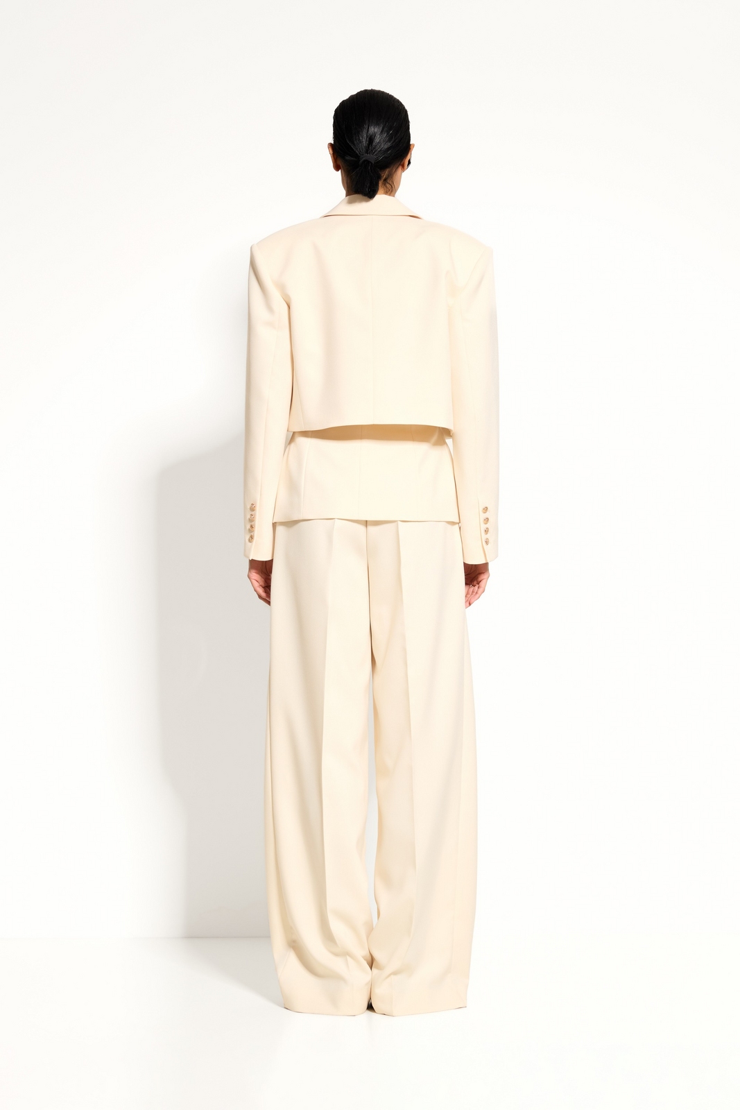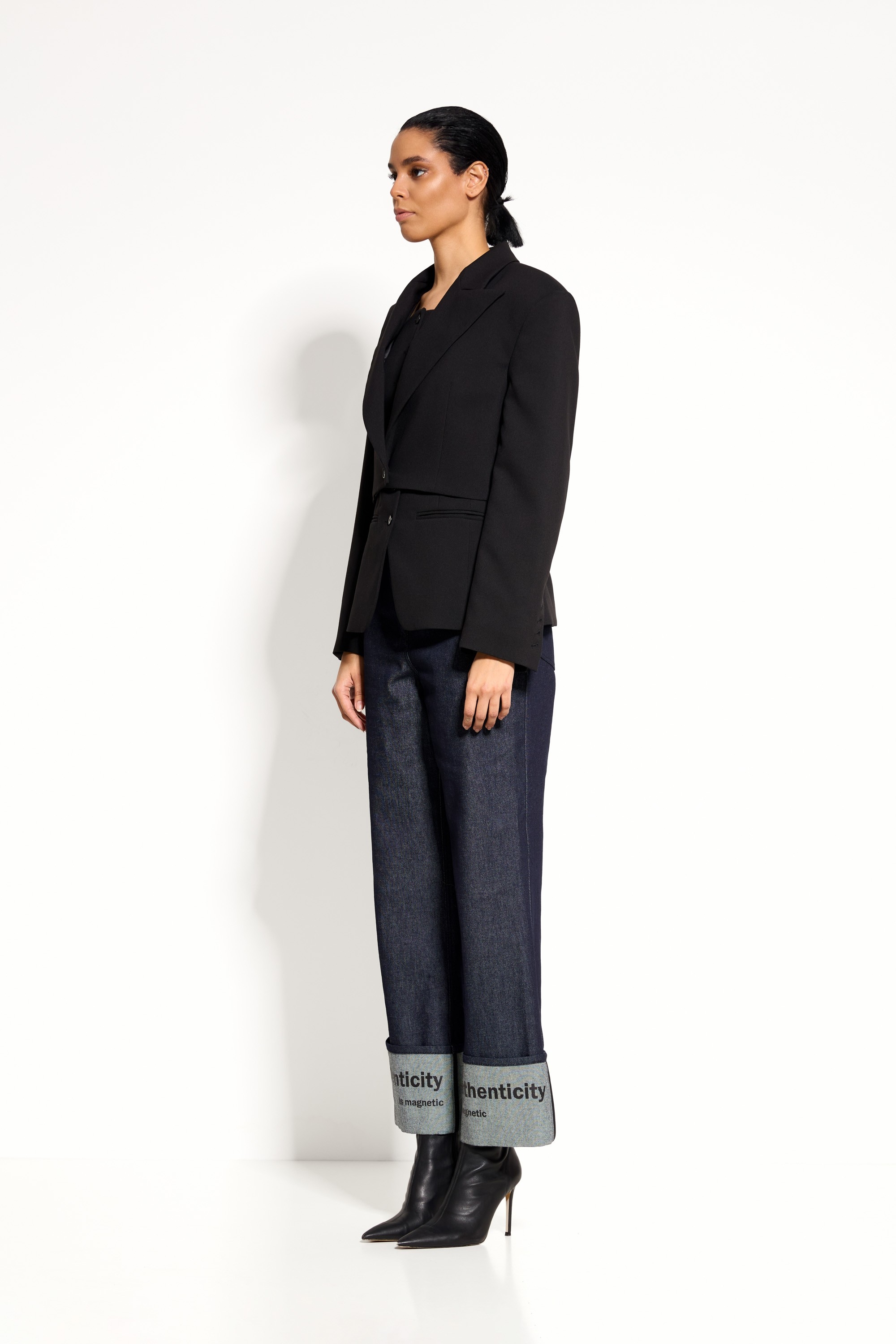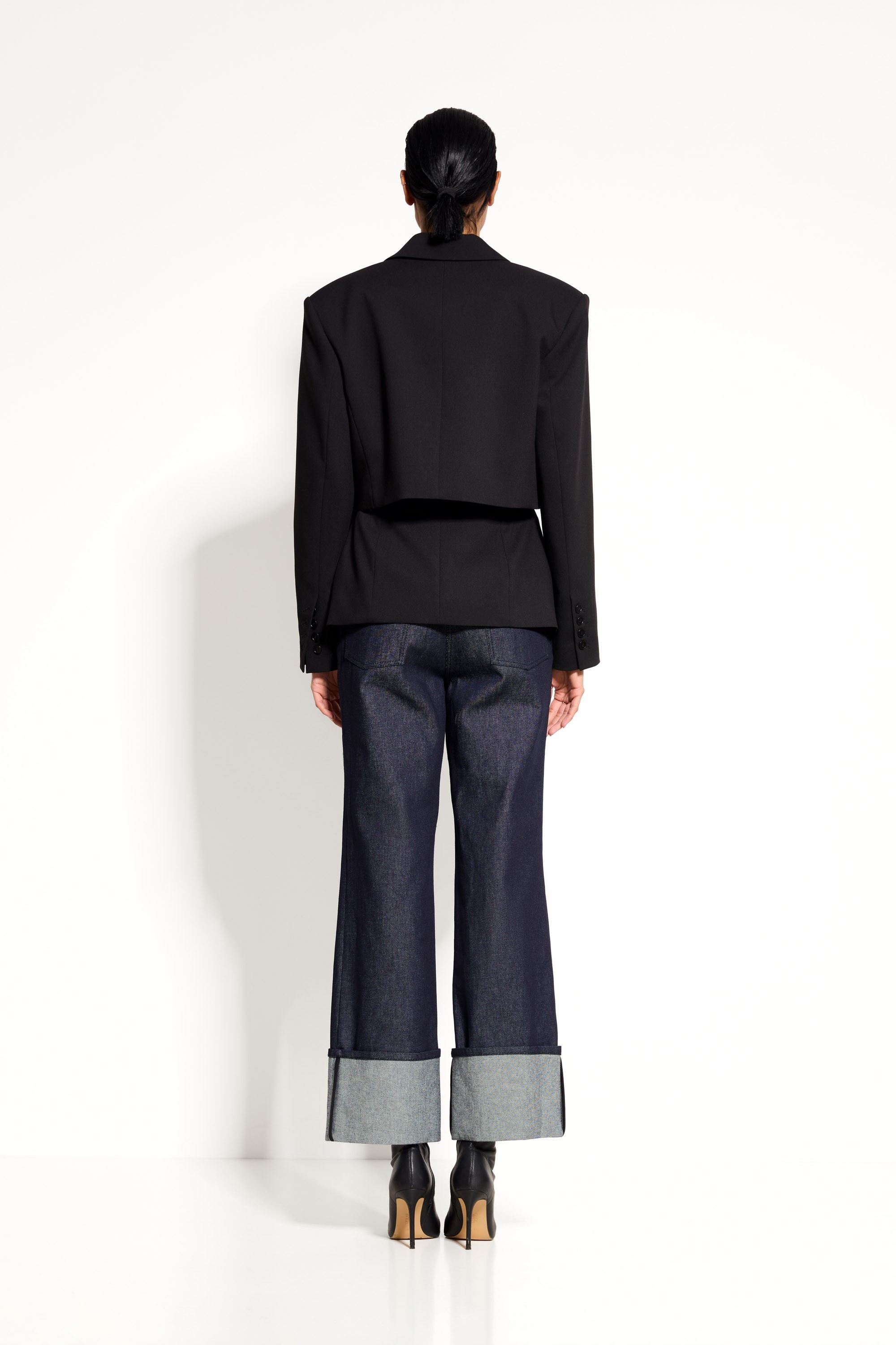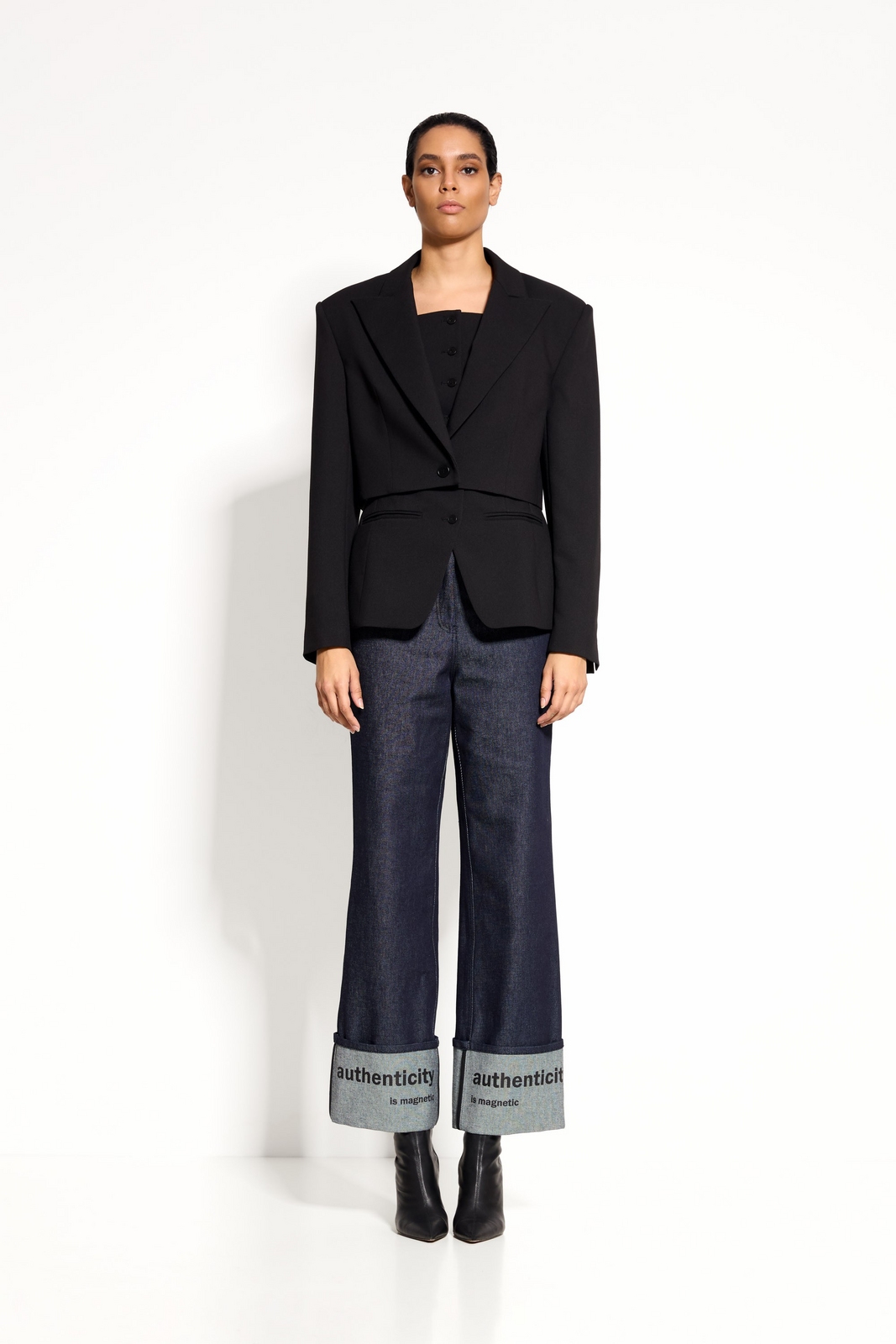 Укороченный прямой крой — создаёт аккуратный, структурированный силуэт и визуально удлиняет ноги при сочетании с высокими брюками или юбкой.