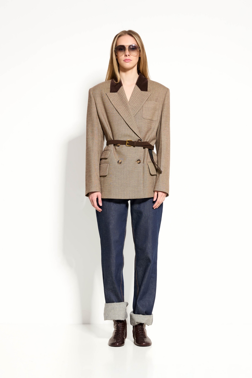 Жакет Lakbi 55352 — элегантная двубортная модель в актуальную клетку, которая сочетает классический силуэт и современные детали. Прорезные карманы с клапанами спереди добавляют функциональности и визуальной структуры, а комплектный пояс из экокожи позволяет подчеркнуть талию и создавать завершённый образ. Отложной воротник делает жакет универсальным для разных ансамблей — от офисных образов до стильных городских сетов.