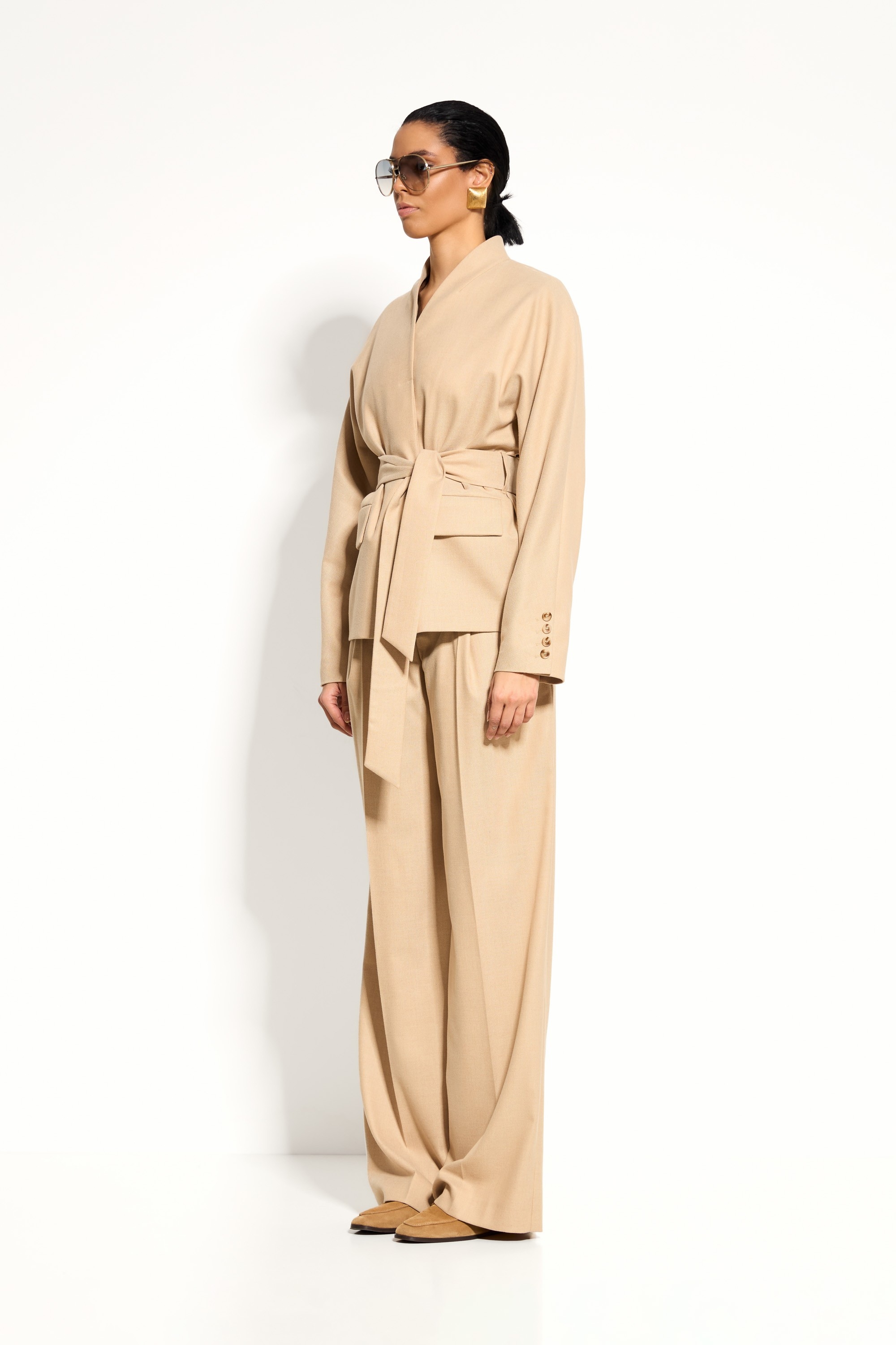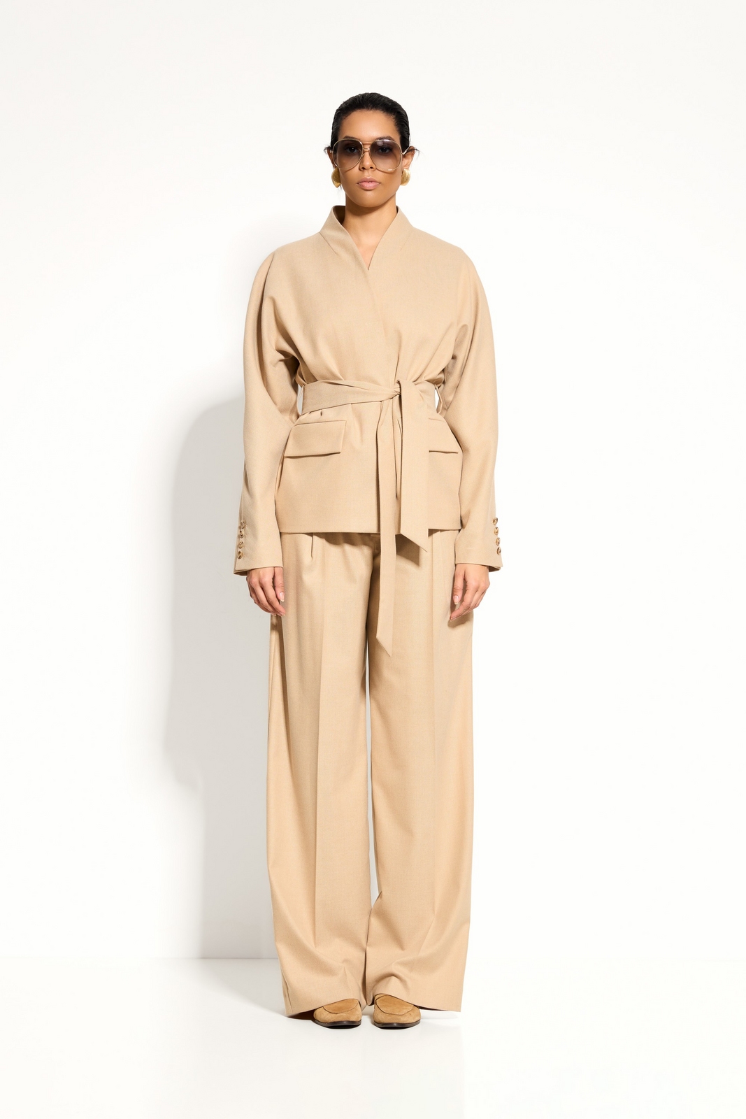 Комфорт и стиль: мягкая посадка и пояс создают баланс между удобством и выразительным силуэтом.