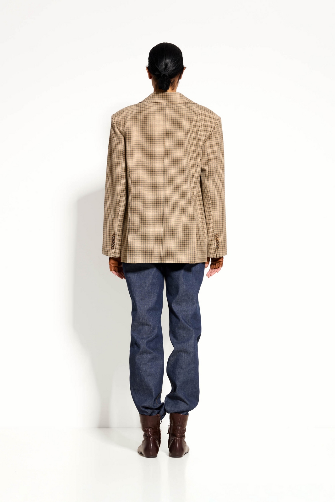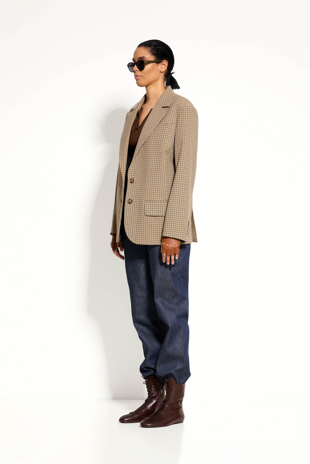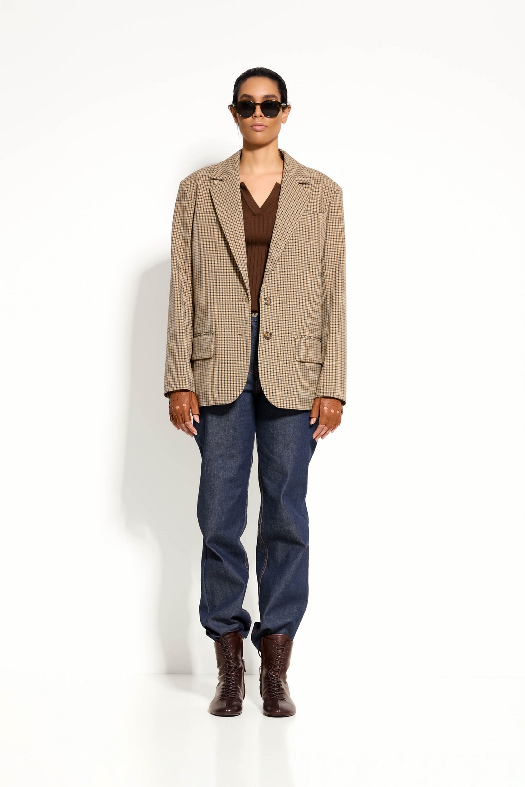 Аксессуары: сдержанные украшения и структурированная сумка подчеркнут клетчатый рисунок и свободный силуэт.