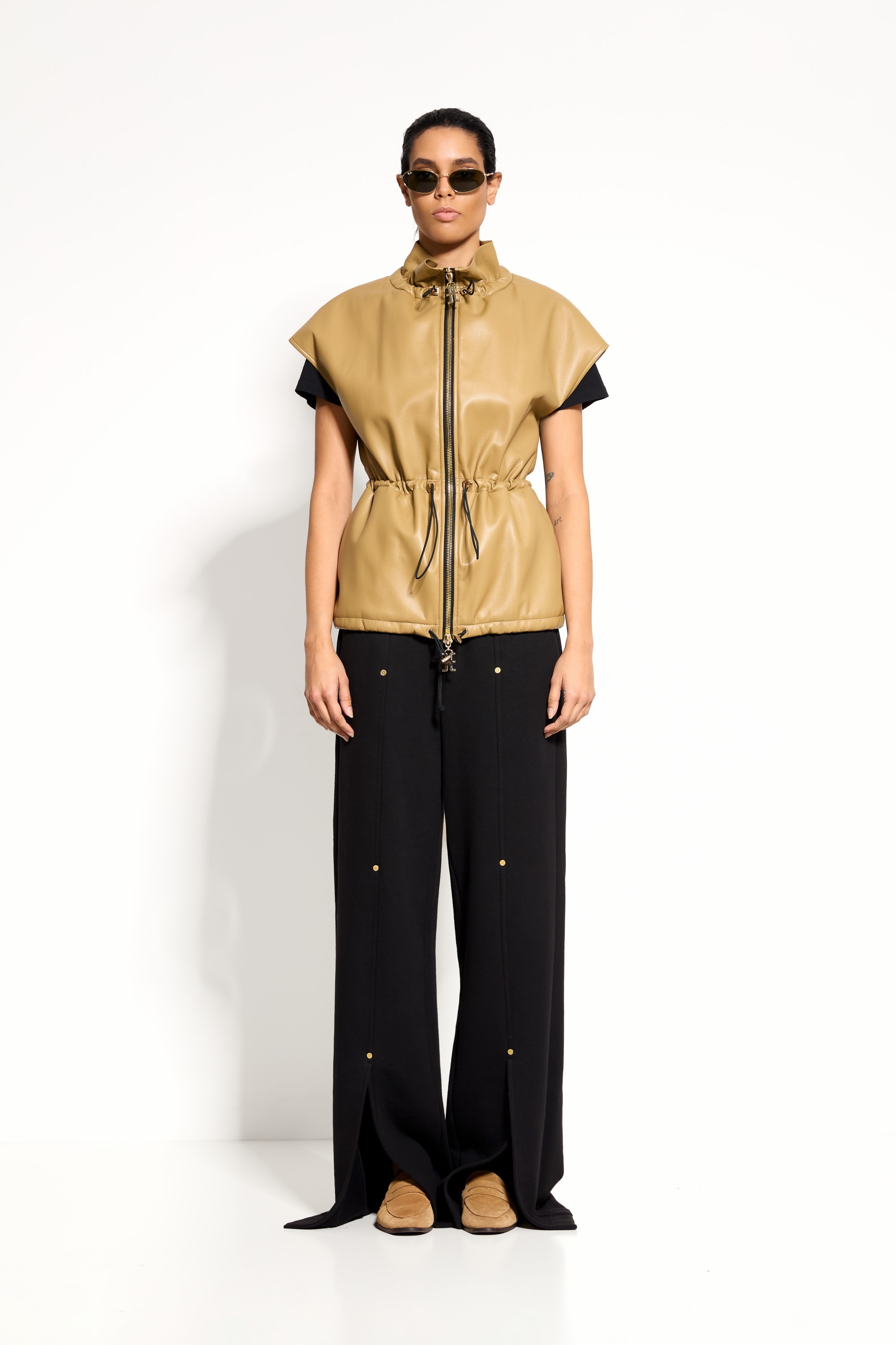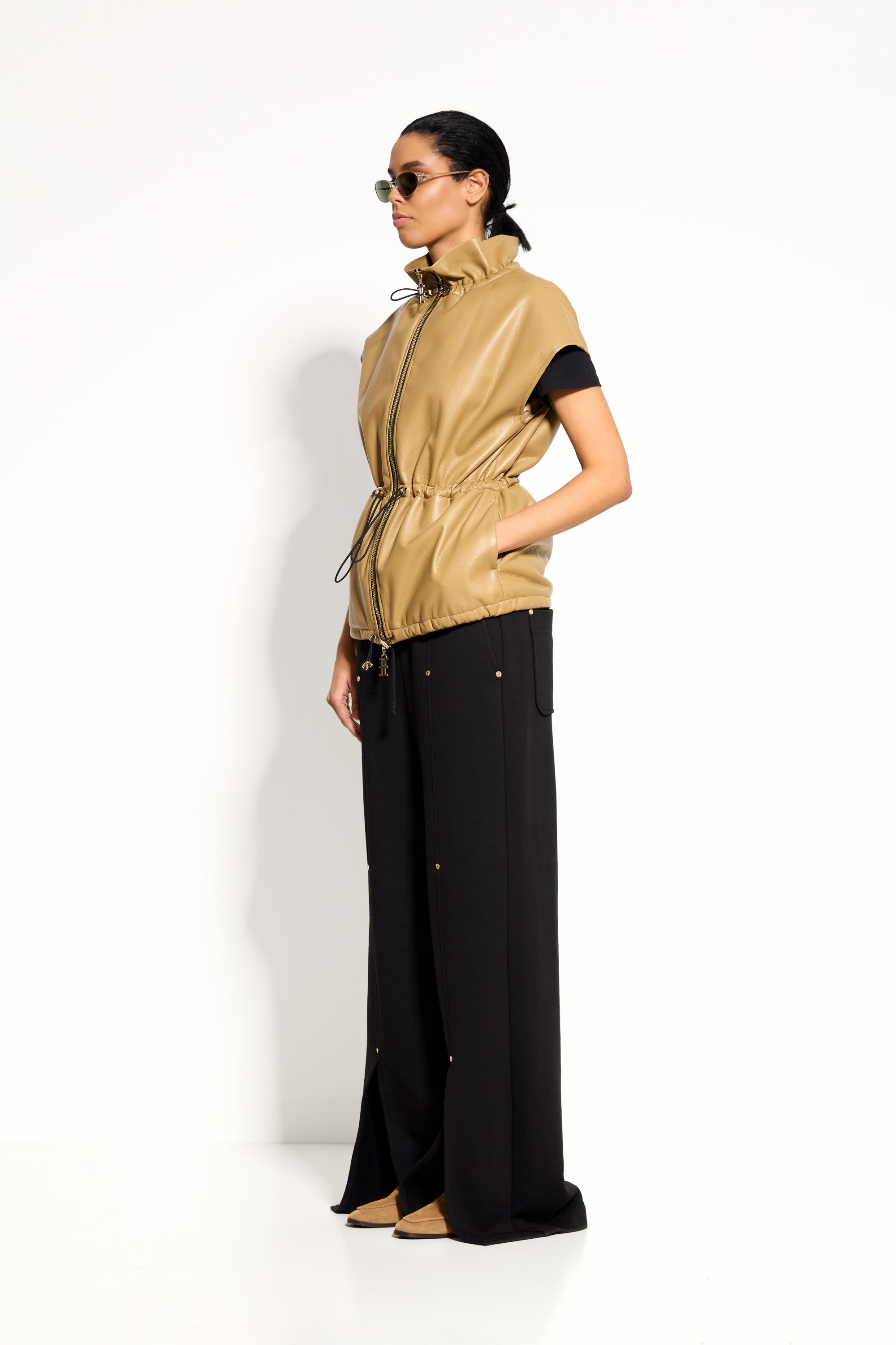 Жилет Lakbi 55371 — стильная модель в бежевом оттенке из мягкой, приятной на ощупь экокожи. Свободный силуэт с спущенной линией плеч и без рукавов создаёт лёгкий, непринуждённый образ, а кулиски с резинкой на талии и воротнике позволяют регулировать объём и подчёркивать индивидуальные пропорции фигуры. Этот жилет становится универсальным элементом гардероба, легко вписываясь как в повседневные, так и в более эффектные луки.