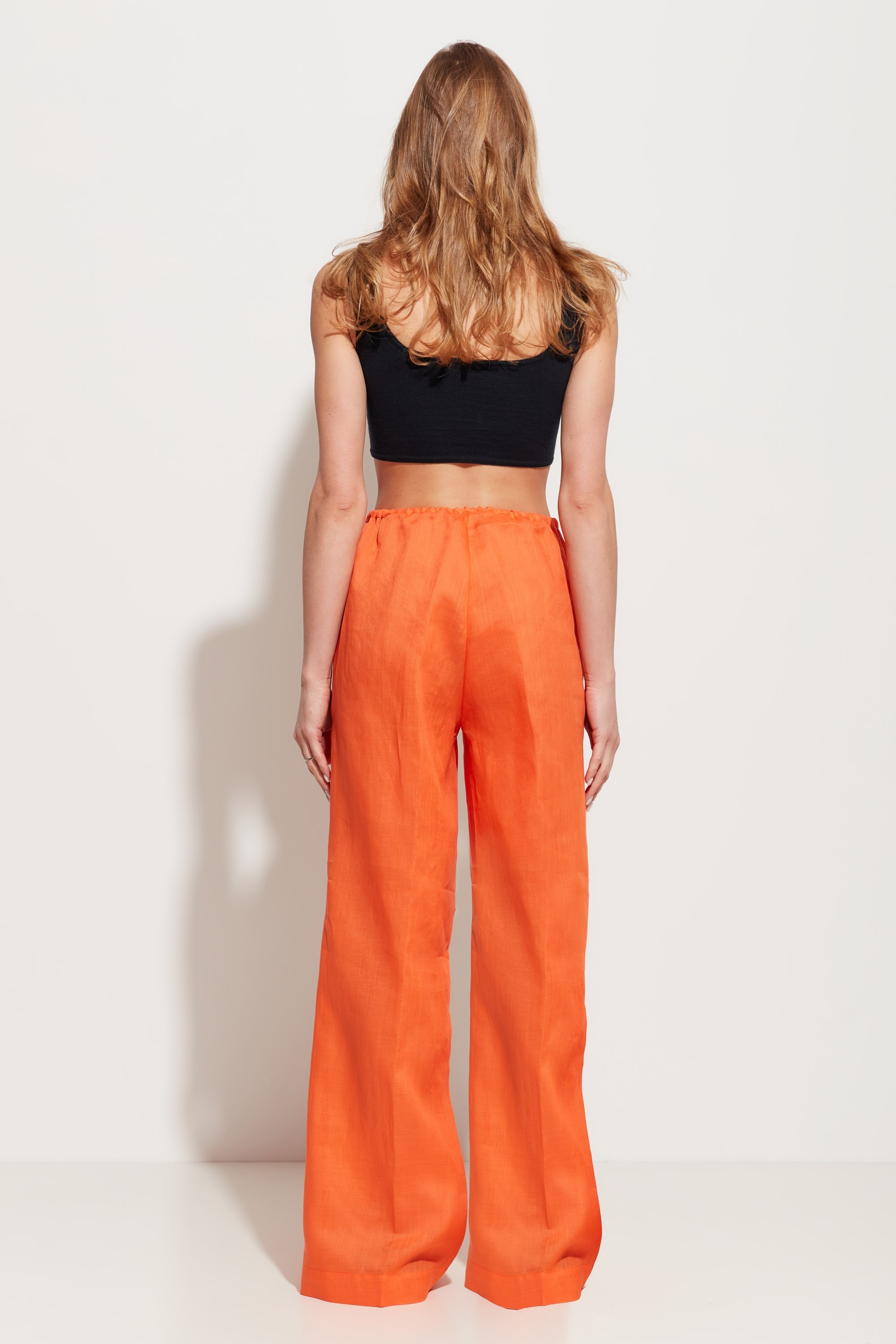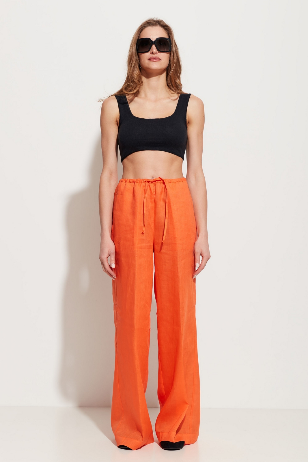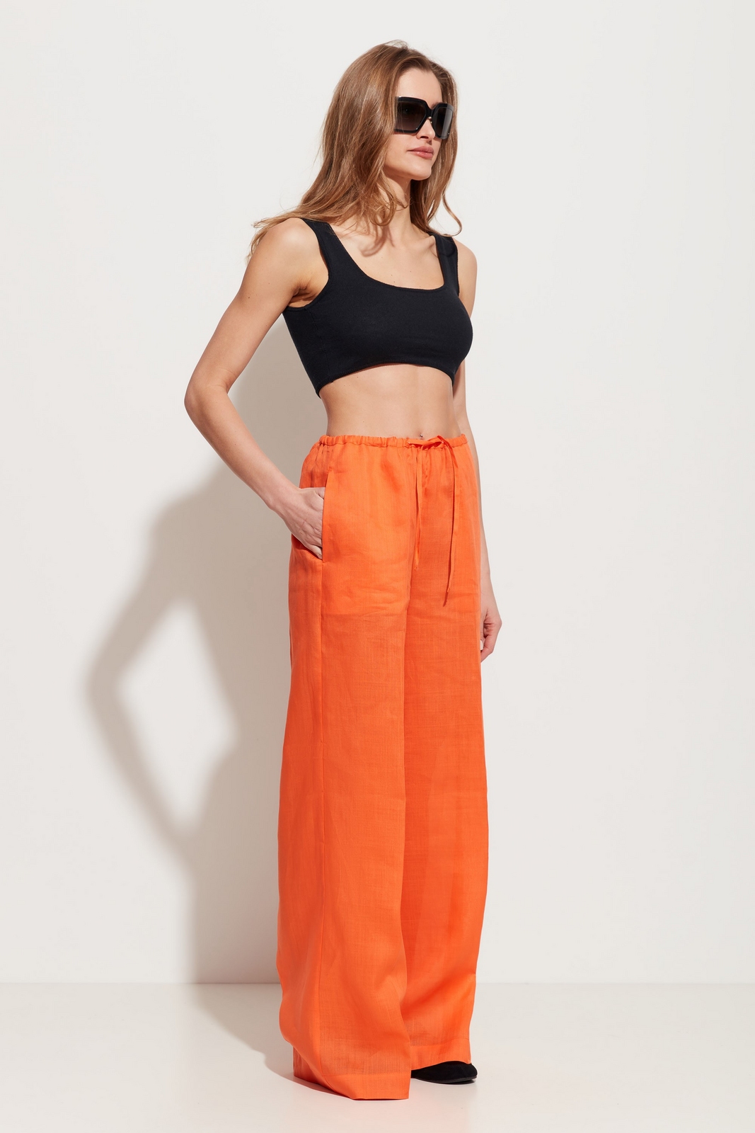 Брюки прямого кроя, расширенные от линии бедер к низу. Посадка изделия высокая. Объем талии регулируется при помощи протянутого шнура. По бокам карманы. Универсальная модель, которая сочетается с любым типом верха.