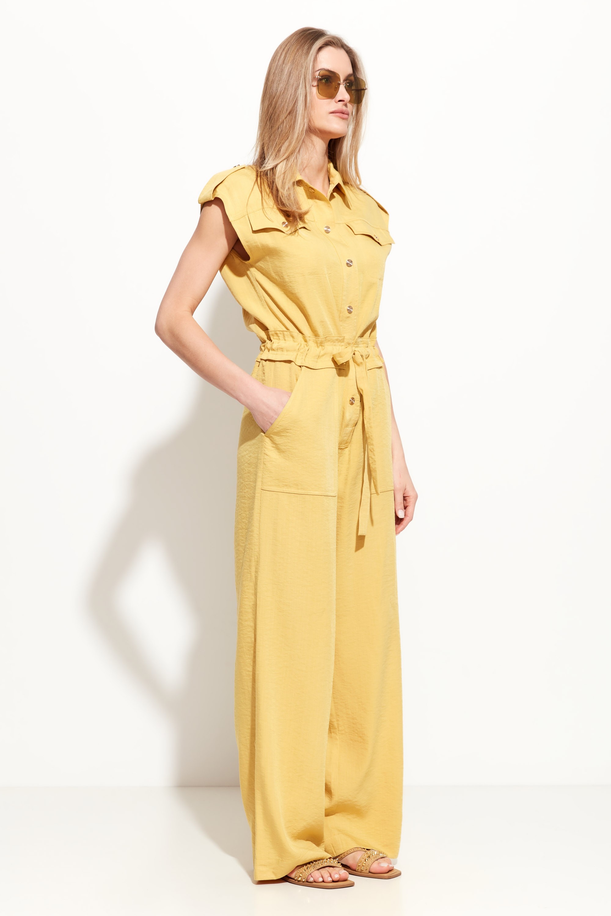 Комбинезон полуприлегающего силуэта с брюками. Воротник отложной. Линия плеч спущена. Объем талии регулируется при помощи пояса протянутого в кулиску. На груди накладные карманы с клапанами. На бедрах вместительные накладные карманы. Стильная модель, которая идеально подойдет для создания эффектных городских образов. Легкий и дышащий материал из вискозы позволяет носить изделие даже в самый жаркий день.