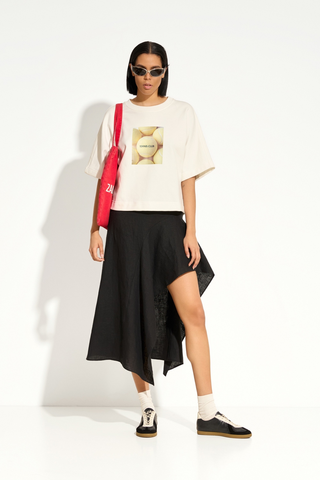 Акцентный графический принт — оригинальный рисунок с теннисными мячами делает джемпер заметным элементом гардероба.