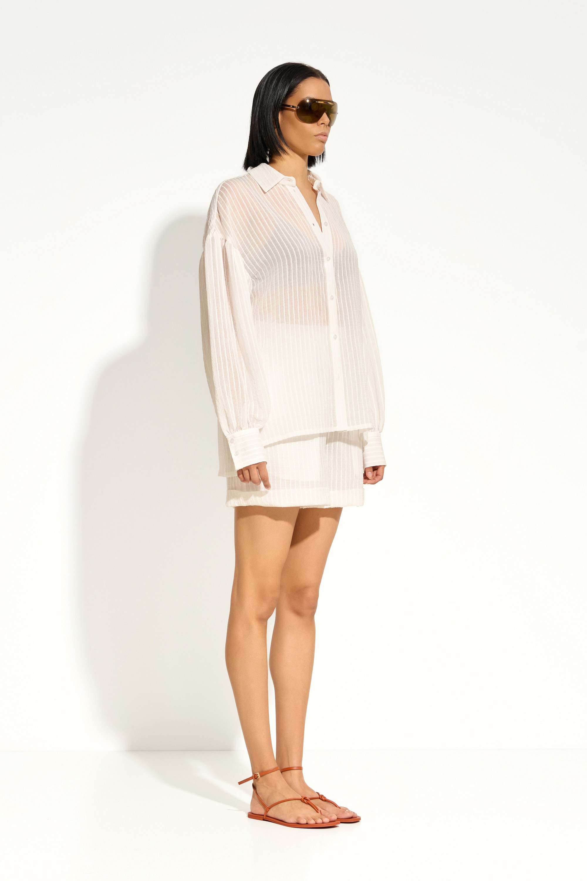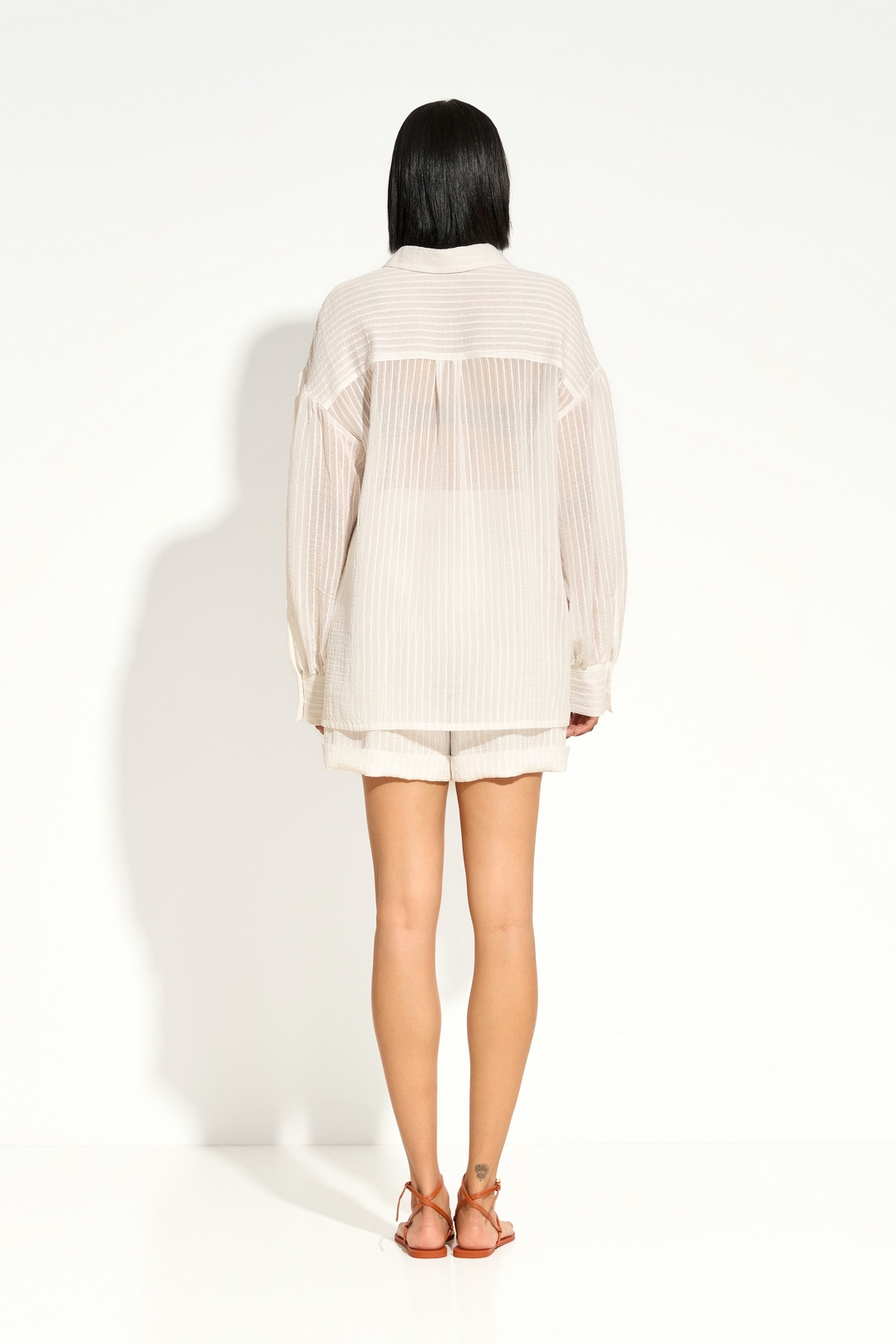 Модель дополнена стояче-отложным воротником и спущенной линией плеч, что создаёт расслабленный и современный силуэт. Объёмные длинные рукава с манжетами придают образу выразительность и элегантность, а лёгкая ткань обеспечивает комфорт даже в жаркую погоду.