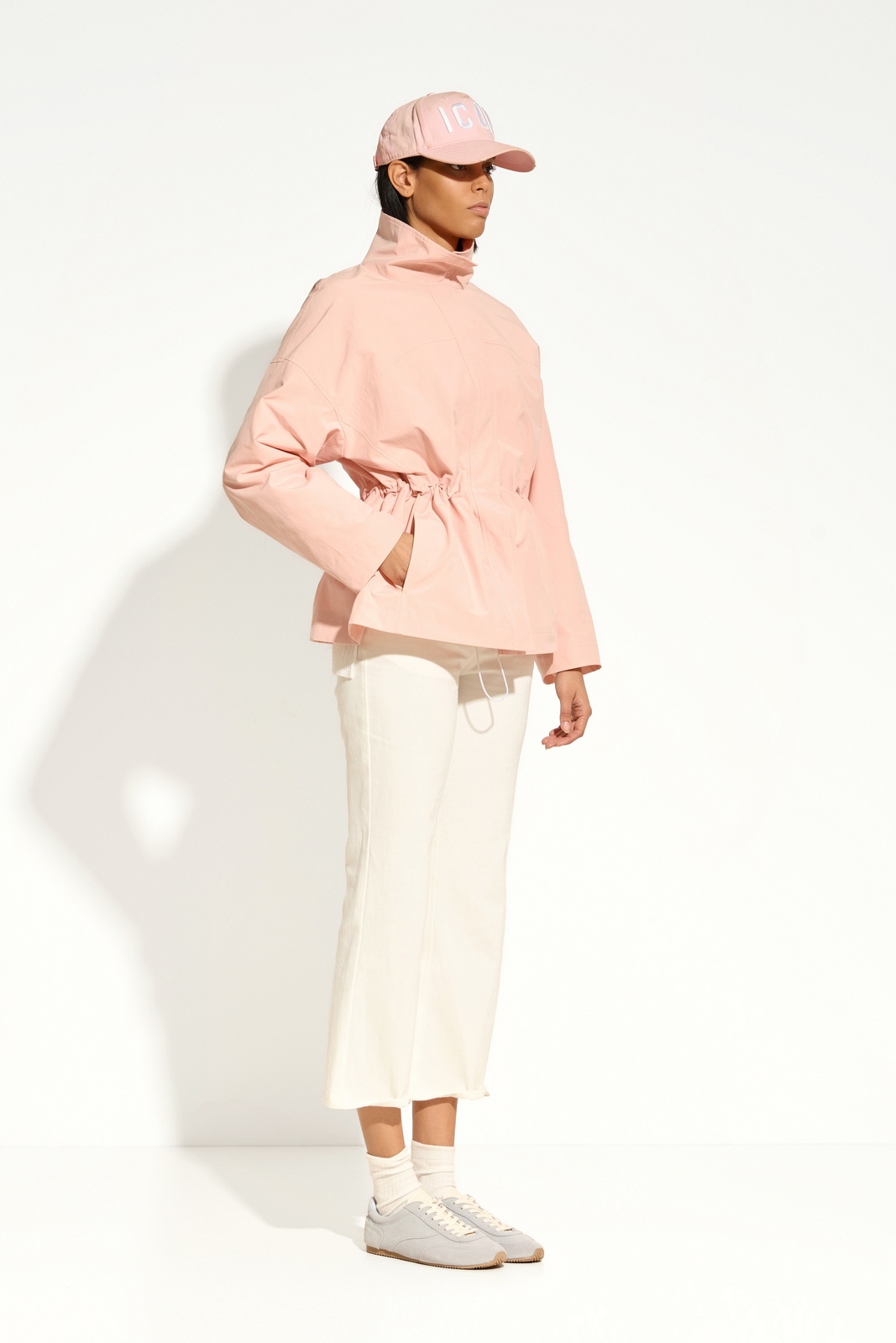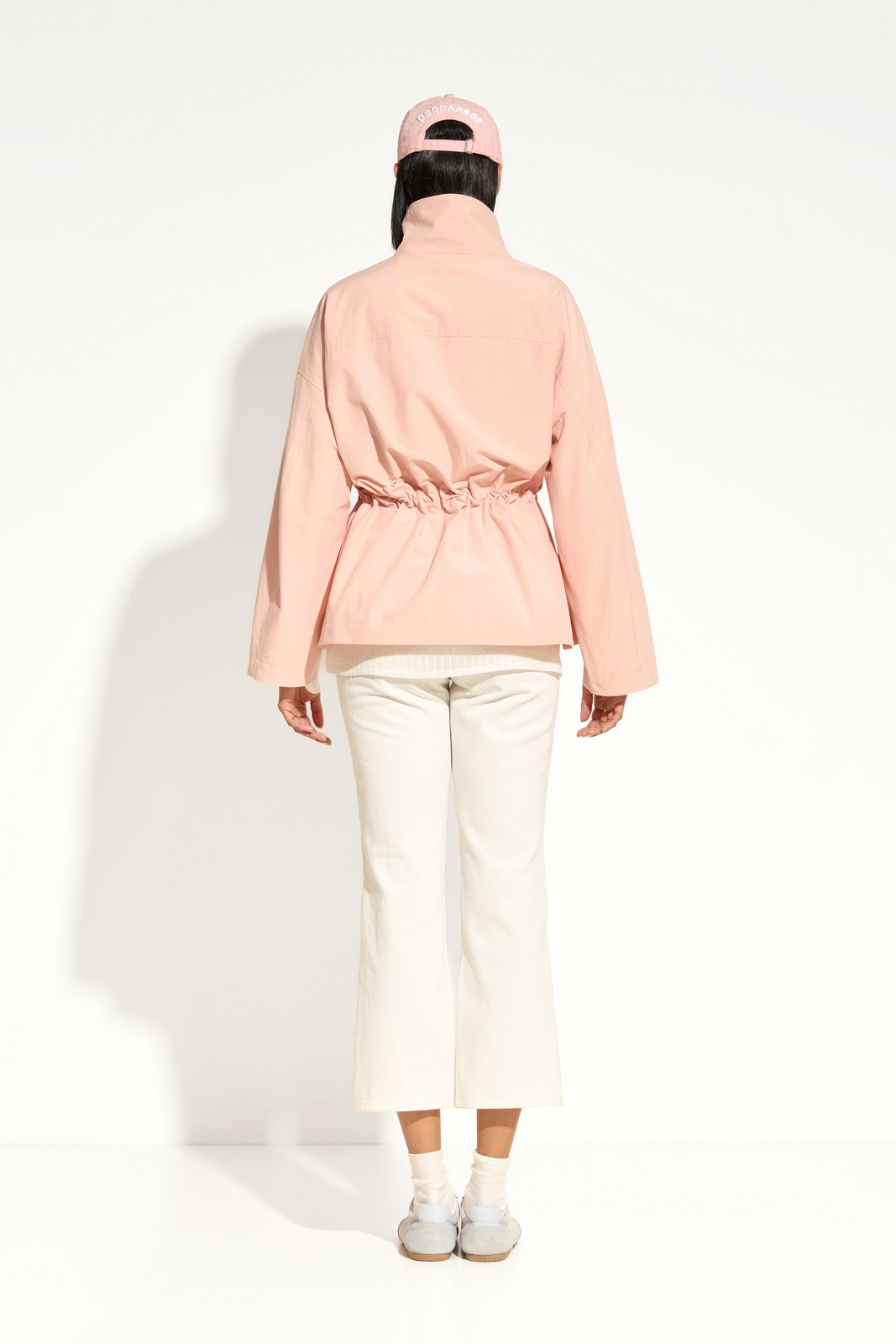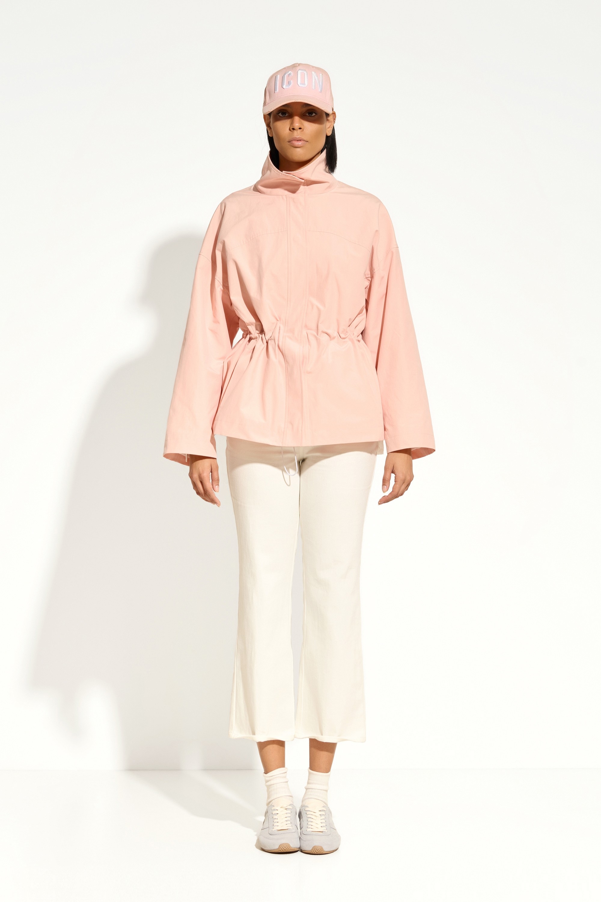 Спущенная линия плеч формирует расслабленный силуэт и добавляет изделию актуальности, а высокий стояче-отложной воротник делает образ более выразительным и защищает от прохладной погоды. На талии расположена кулиска с регулируемым шнурком, позволяющая подчеркнуть фигуру и легко менять объем силуэта.