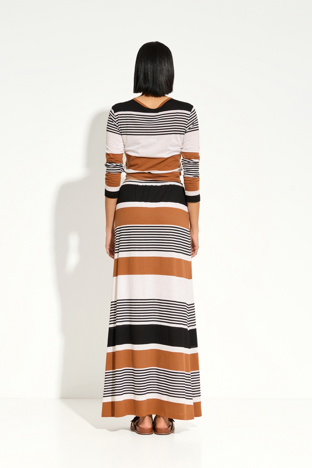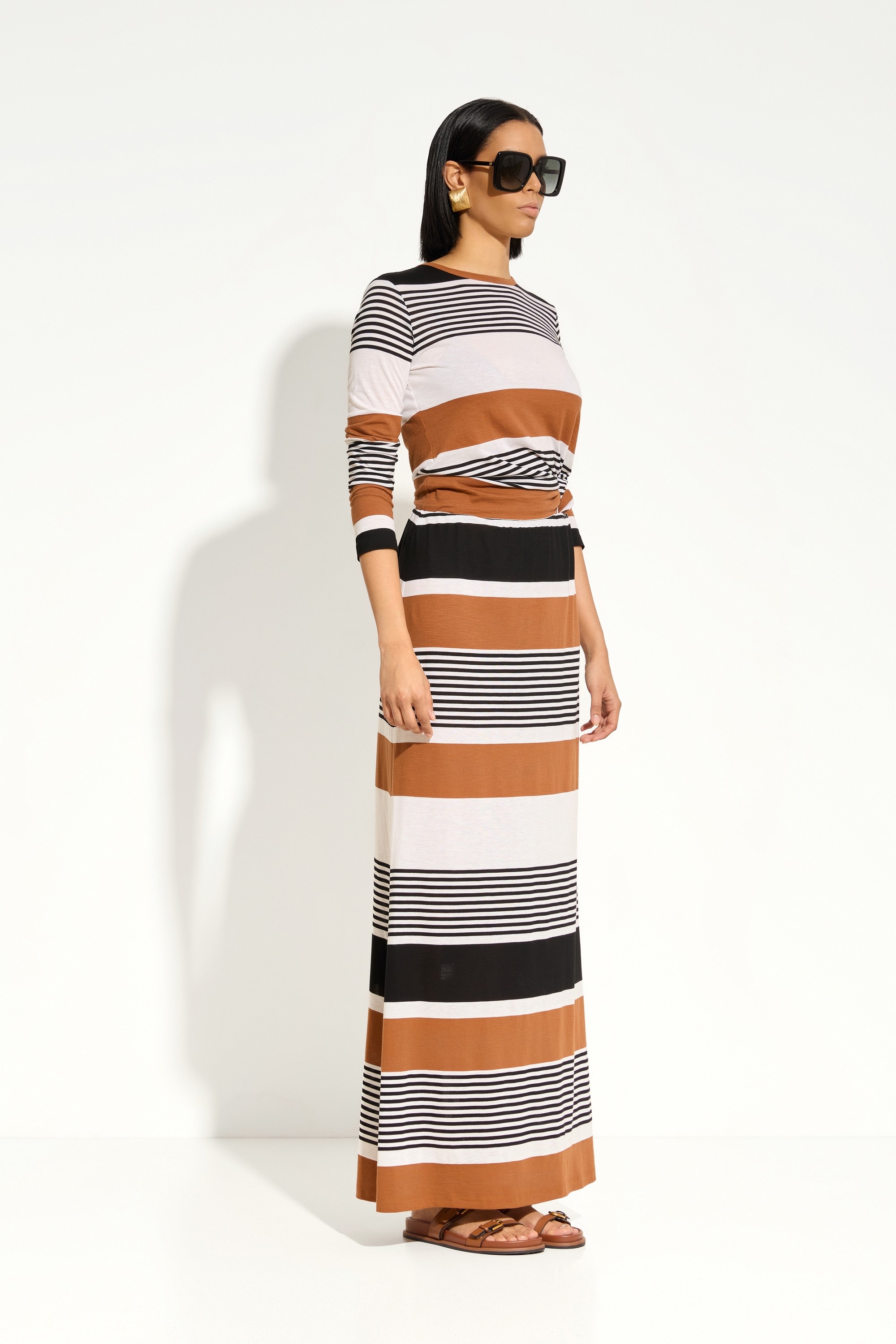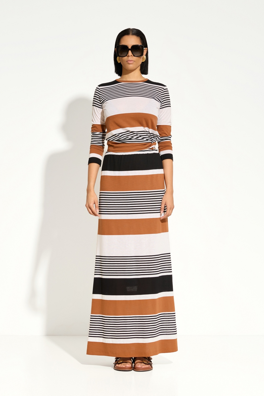 Горизонтальная акцентная полоска — стильный принт, придающий образу выразительность.