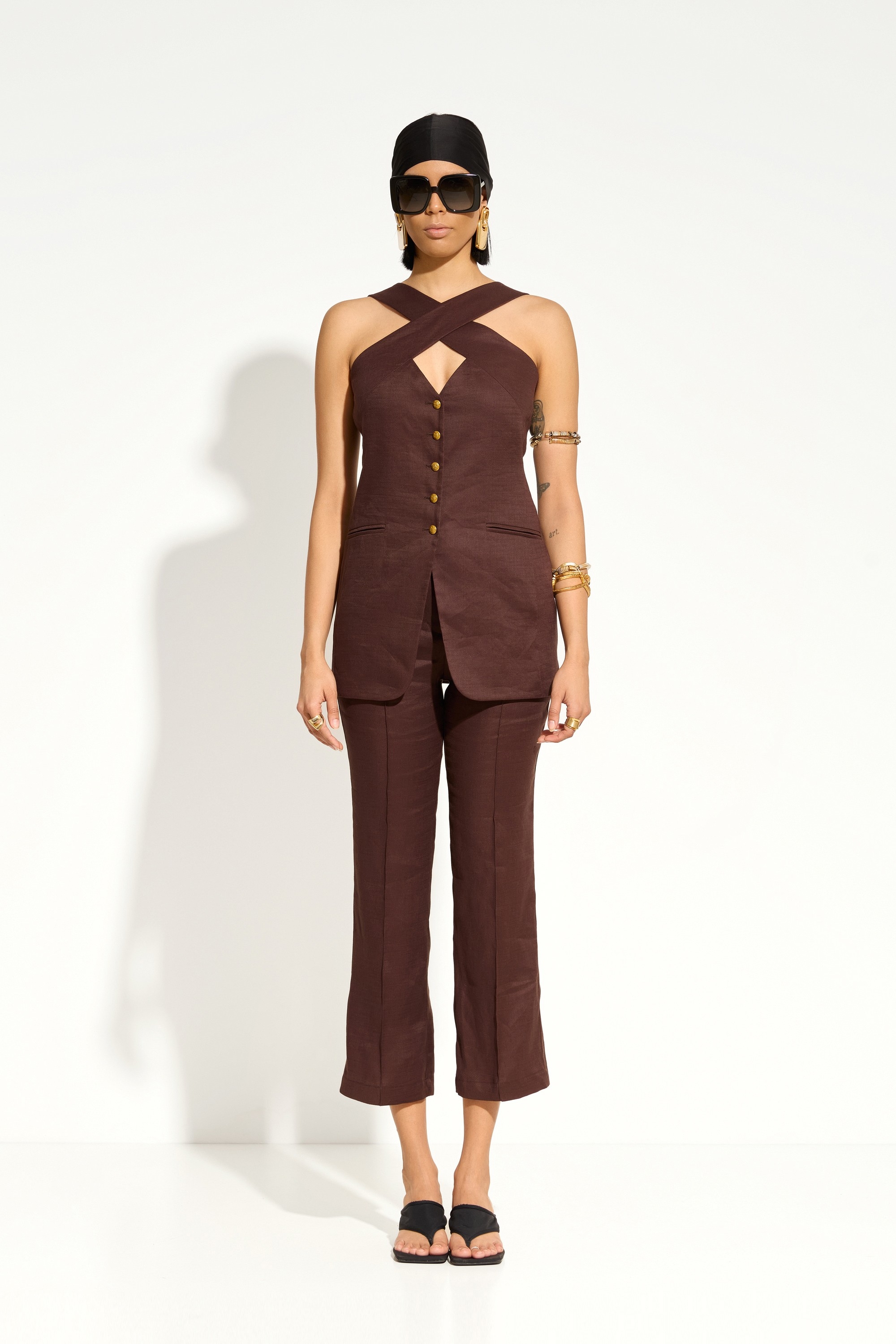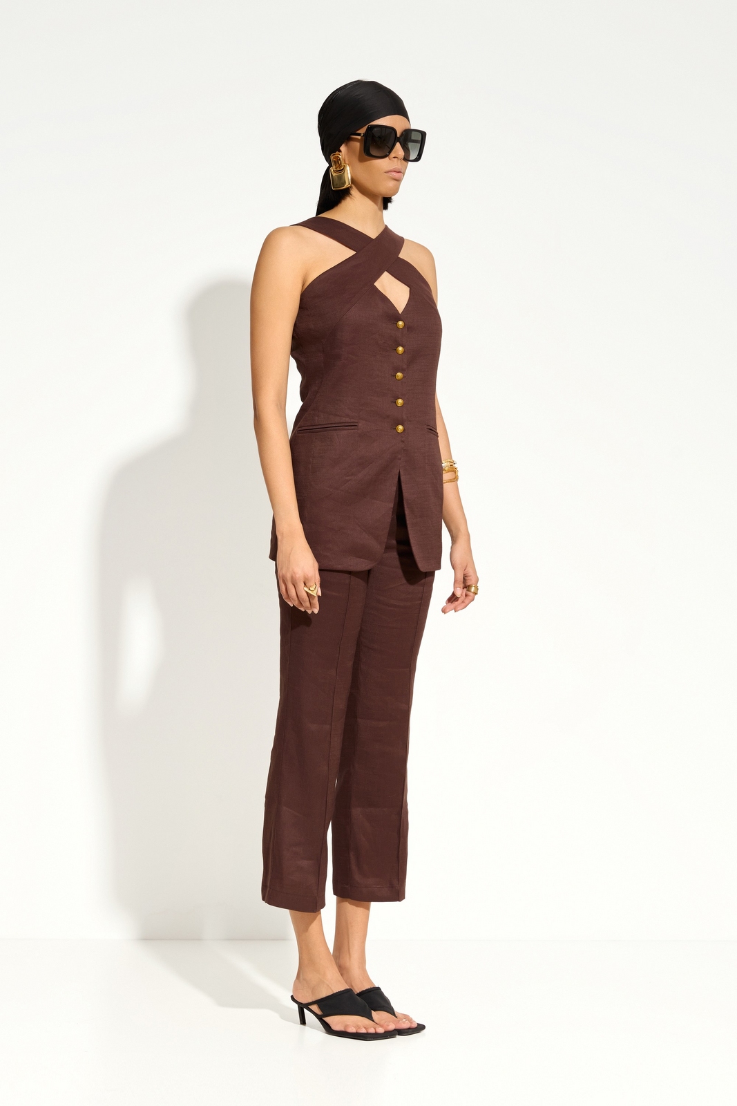 Жилет Lakbi 55697 прилегающего силуэта с фигурным верхом и золотыми пуговицами — элегантный акцент летнего гардероба.